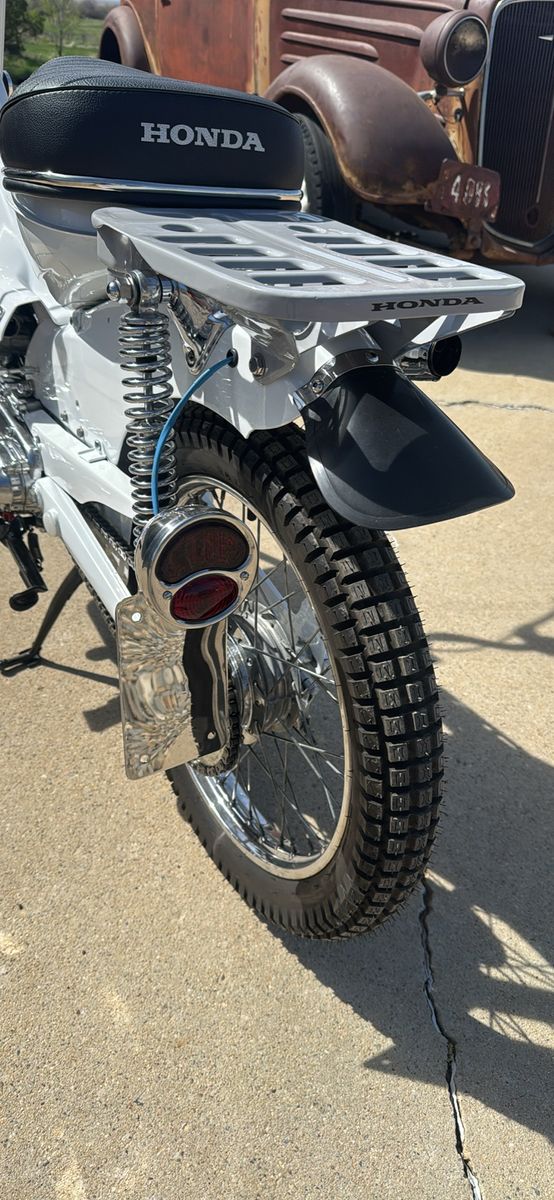 For sale is a show bike Honda ct 90. These are what has been done to it. New tires and tubes , new wireing harness, new seat , new handle grips and levers and controls, new pearl white paint , new battery , custom tail light and plate holder, bobbed the rear fender. New front forks , new rear shocks , custom rear rack , custom front fender , new brake pads, engine was recently gone through all new gaskets and seals. New chain, new brake cables , any way you get the picture. All the aluminum has been polished on the bike. I’m pretty firm on my price . No scammers if it posted it’s still available .