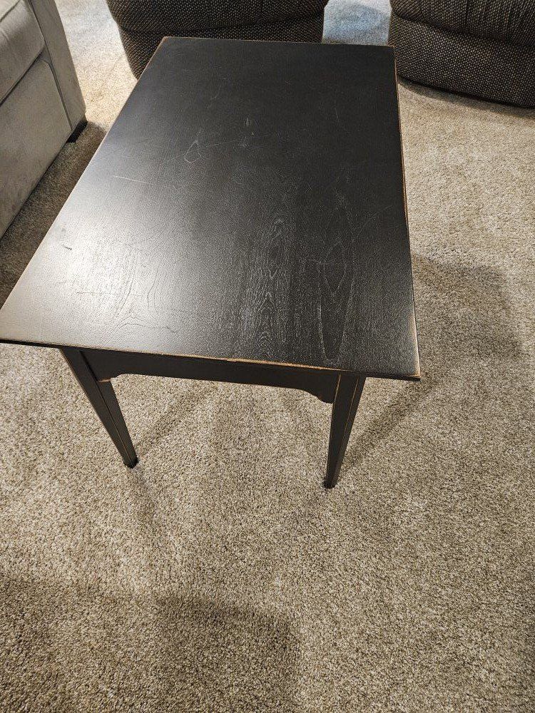 Black wood coffee table. "Distressed" edging. Some minor surface scratches.