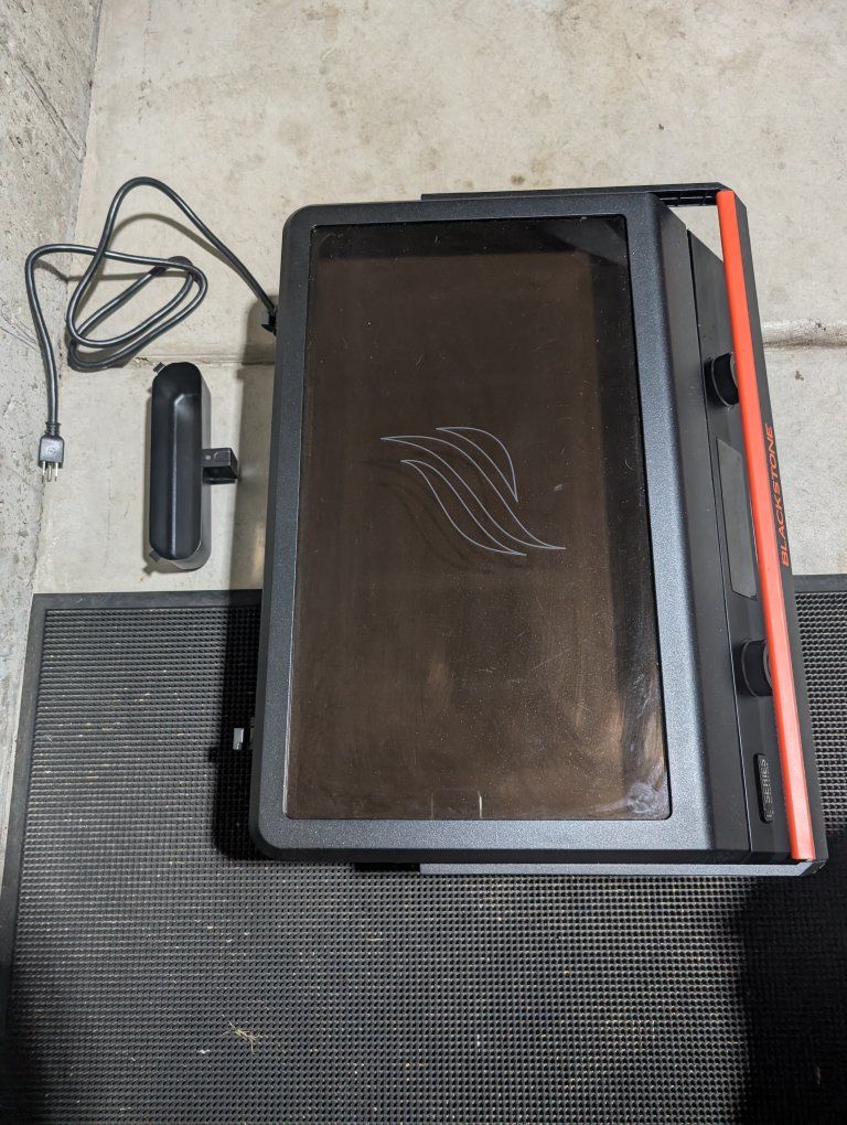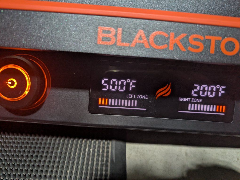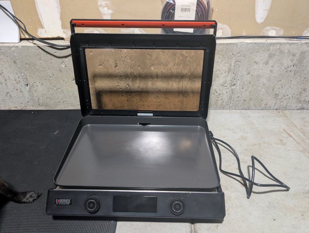 non stick ceramic titanium coated 22" electric Blackstone griddle with lid and grease management system and catcher. has two independent cooking zones
