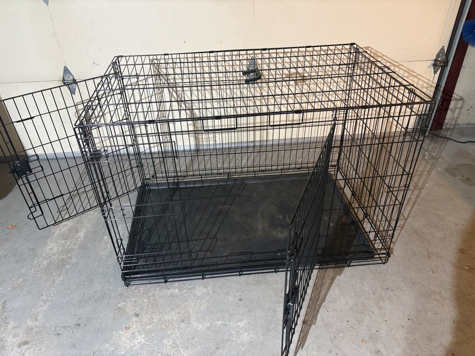 Heavy-duty folding wire dog crate with two doors (front & side), removable plastic tray. Folds flat for storage and transport. Great for crate training. Solid latches, no rust, very clean.