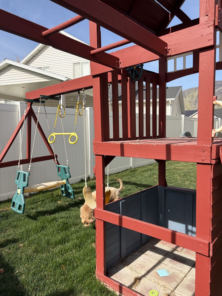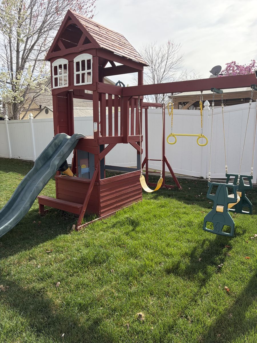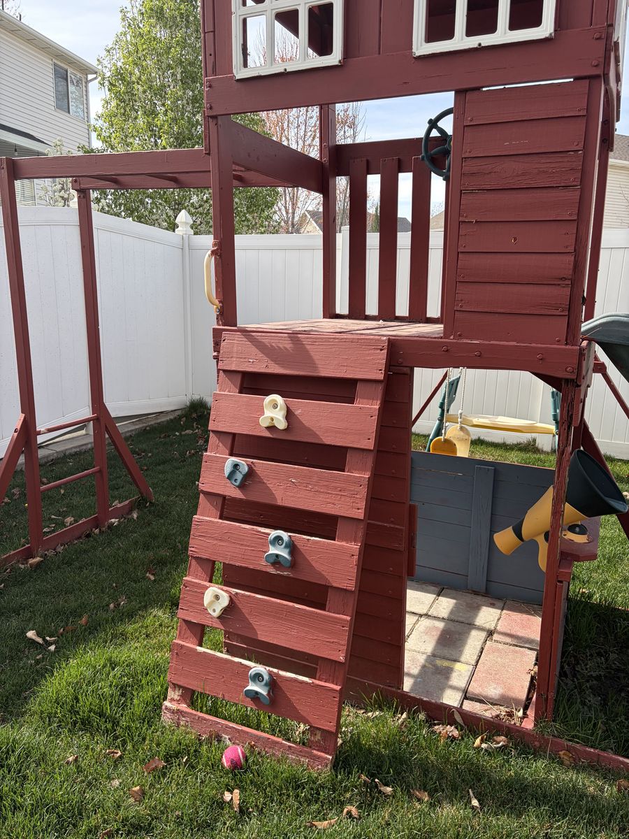 Kids playset / playground with monkey bars, climbing wall, slide and swing set.