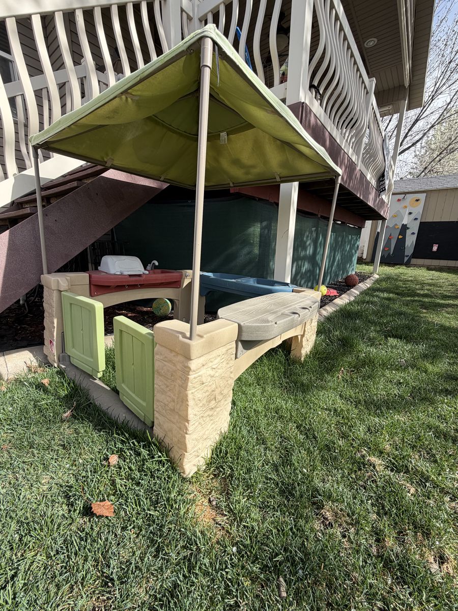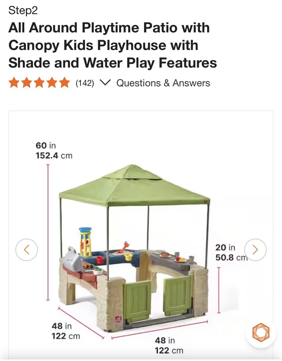 ApplePayThe All Around Playtime Patio with Canopy from Step2 brings backyard fun to life, giving toddlers a space to imagine, create, and play together. Its roomy, open layout makes it easy for several kids to enjoy different activities at once, whether they're cooking, digging, splashing, or simply hanging out. Parents can see the action from every angle, and the built-in canopy offers welcome shade so the games can keep going even on warm afternoons. With stone and wood textures molded into the design, this kids playhouse blends right into the yard while offering a special spot for siblings and friends to gather. The built-in kitchen is ready for pretend cookouts, while the sand and water stations invite hands-on mess-making. There's even a serving counter for snacks, stories, and quick breaks between activities. Every corner of the patio invites exploration. 1 moment they're testing out the grill; the next they're scooping sand or sending water sailing. These activities spark creativity, encourage cooperation, and help develop fine and gross motor skills without kids even noticing they're learning. Made from durable, easy-clean materials, the All Around Playtime Patio is designed to handle years of active use.
