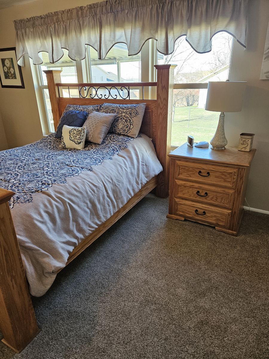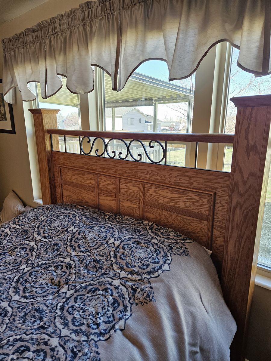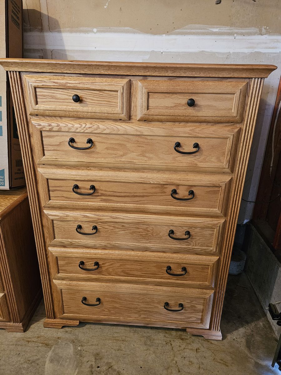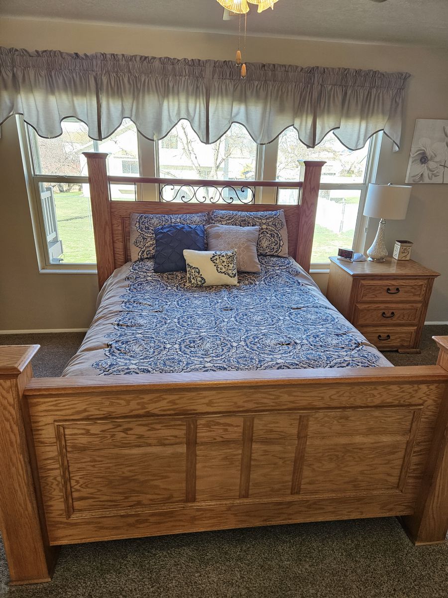 Beautiful queen oak bedroom set. Includes headboard, footboard, tall dresser, dresser with mirror, and 2 nightstands. Does not include mattress. Buyer must provide own transportation and moving crew. Text me for dimensions. Asking $800 cash only, no venmo.