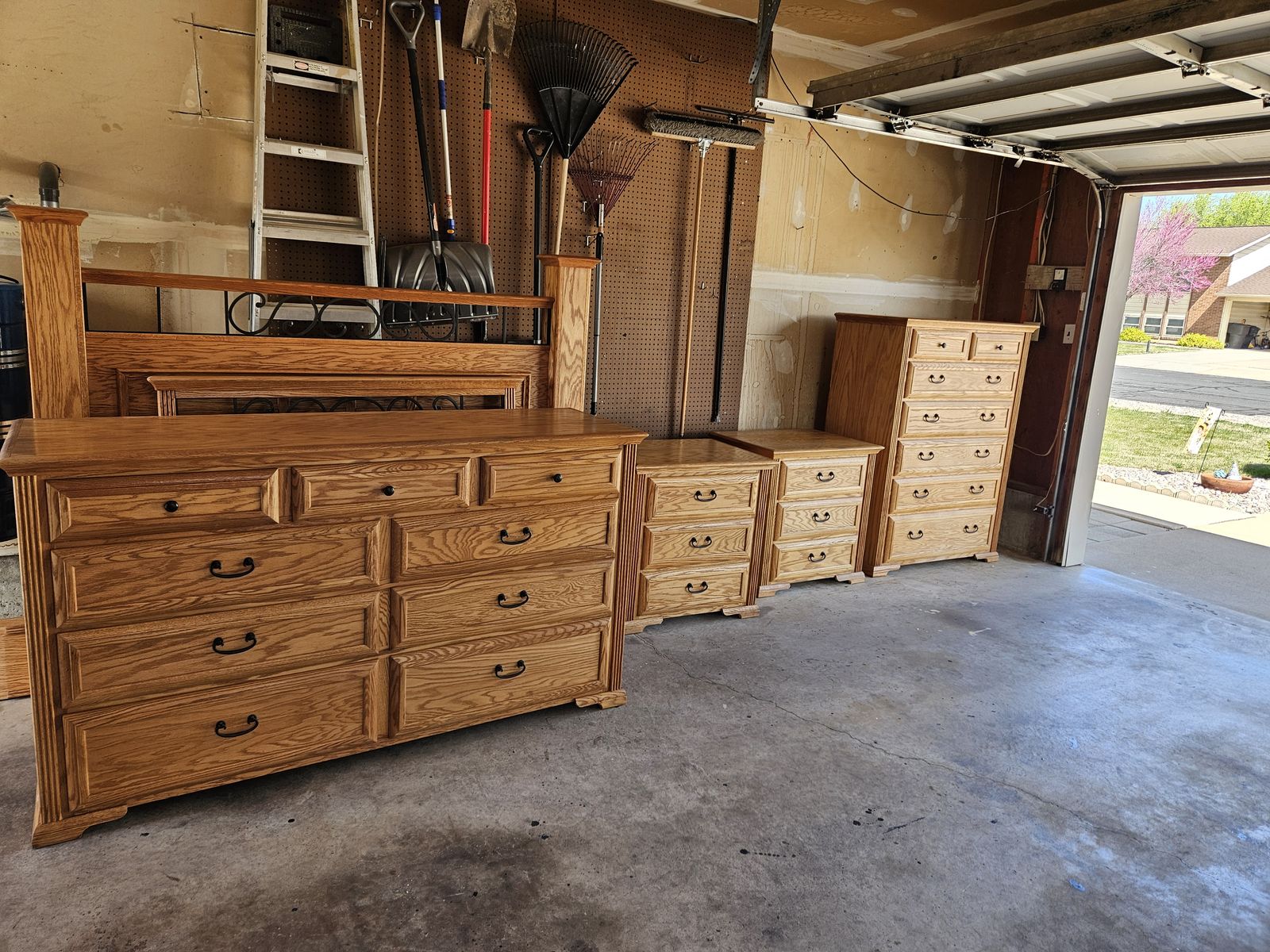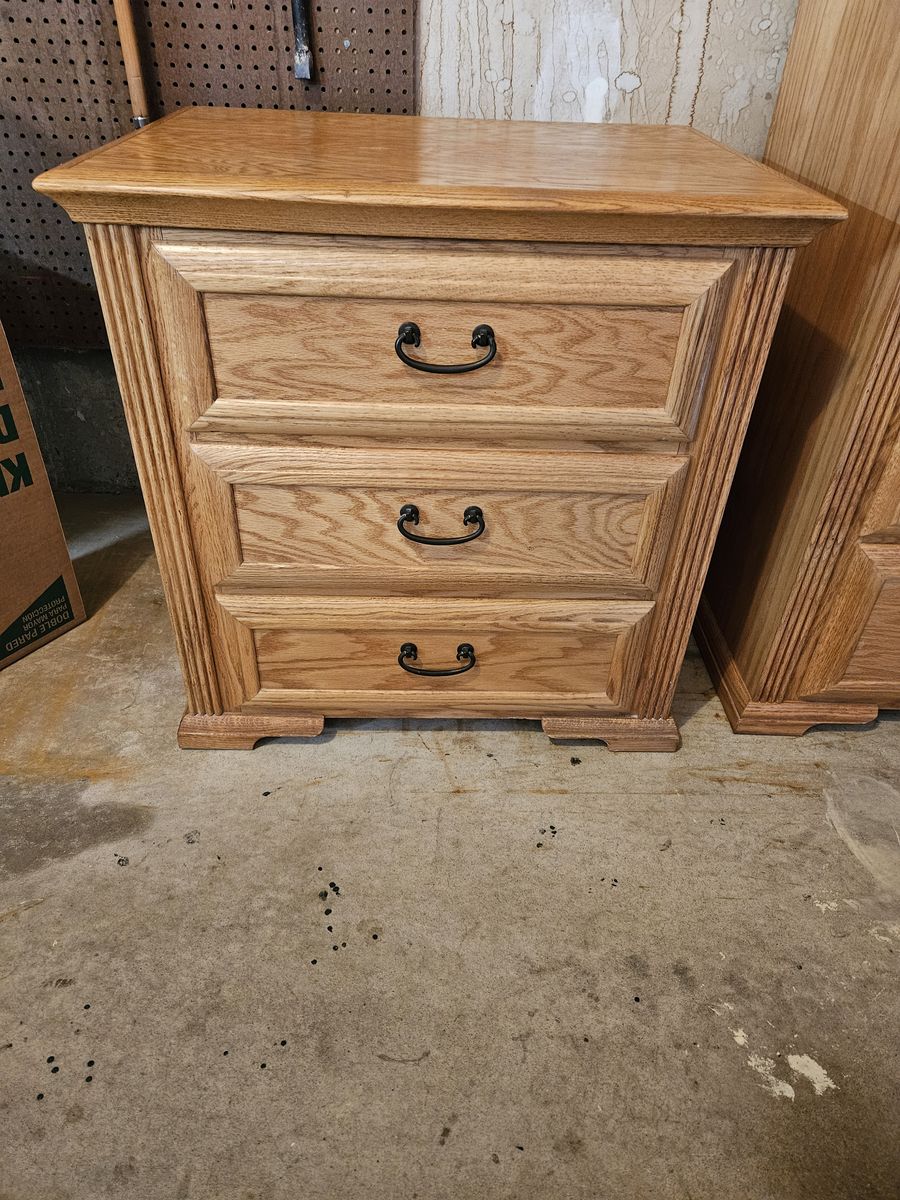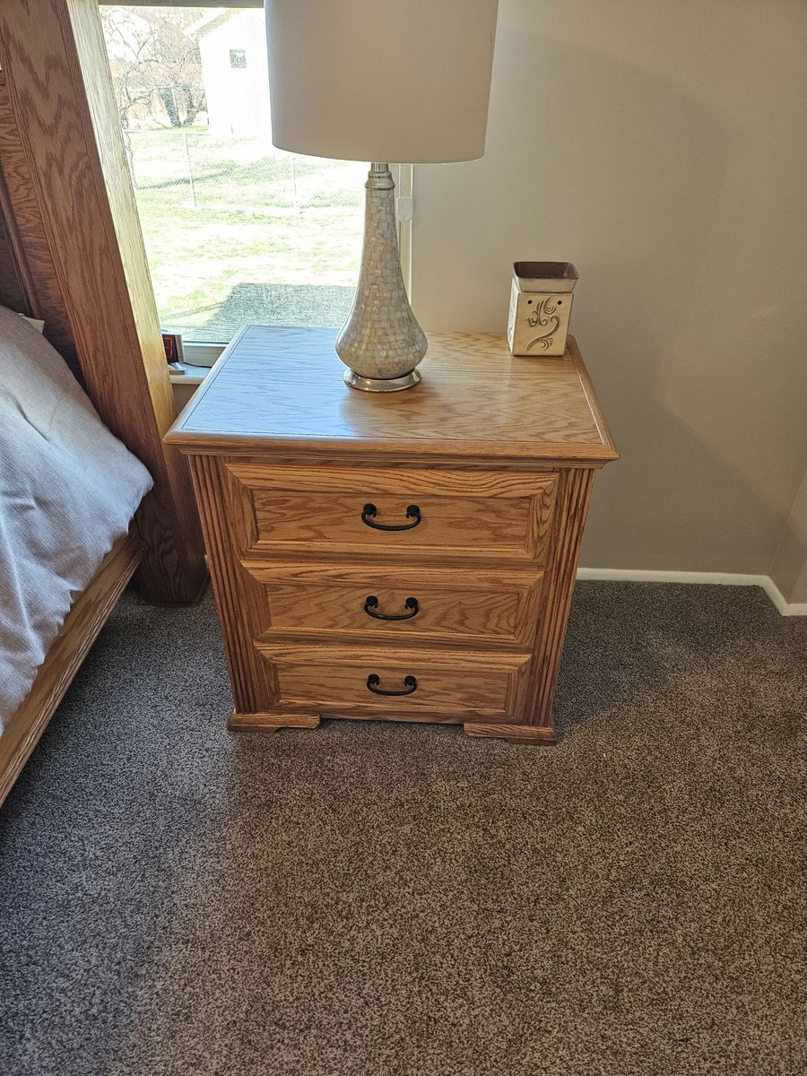 Beautiful queen oak bedroom set. Includes headboard, footboard, tall dresser, dresser with mirror, and 2 nightstands. Does not include mattress. Buyer must provide own transportation and moving crew. Text me for dimensions. Asking $800 cash only, no venmo.