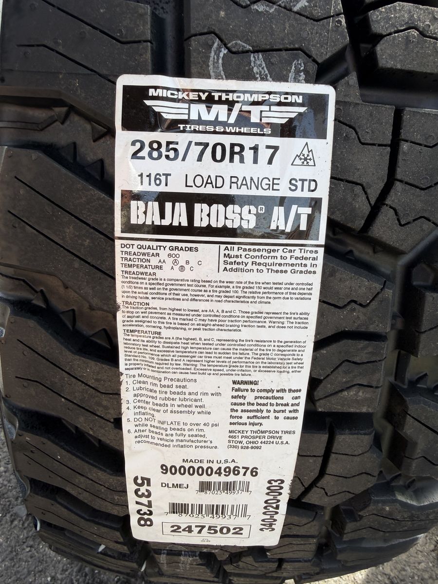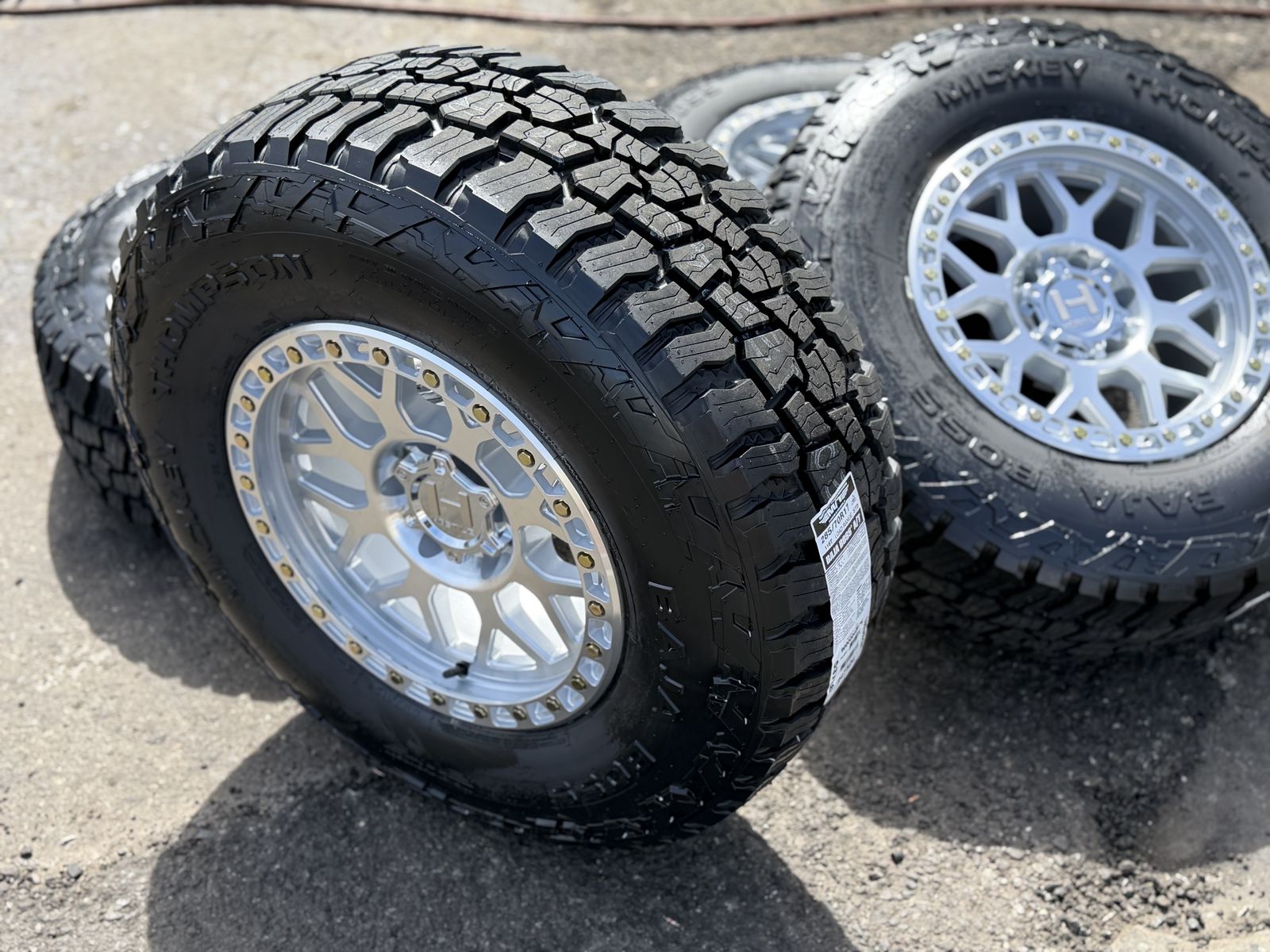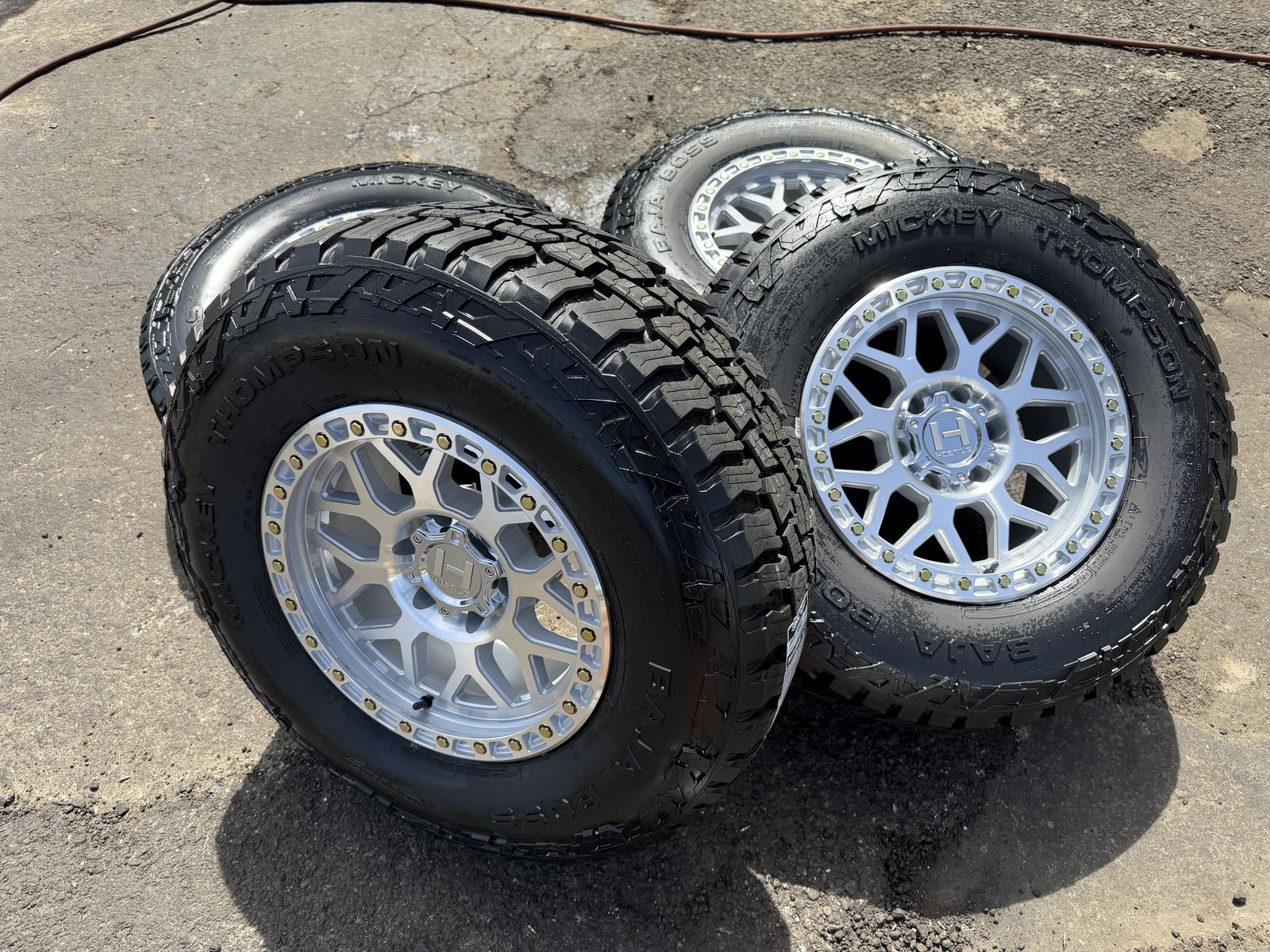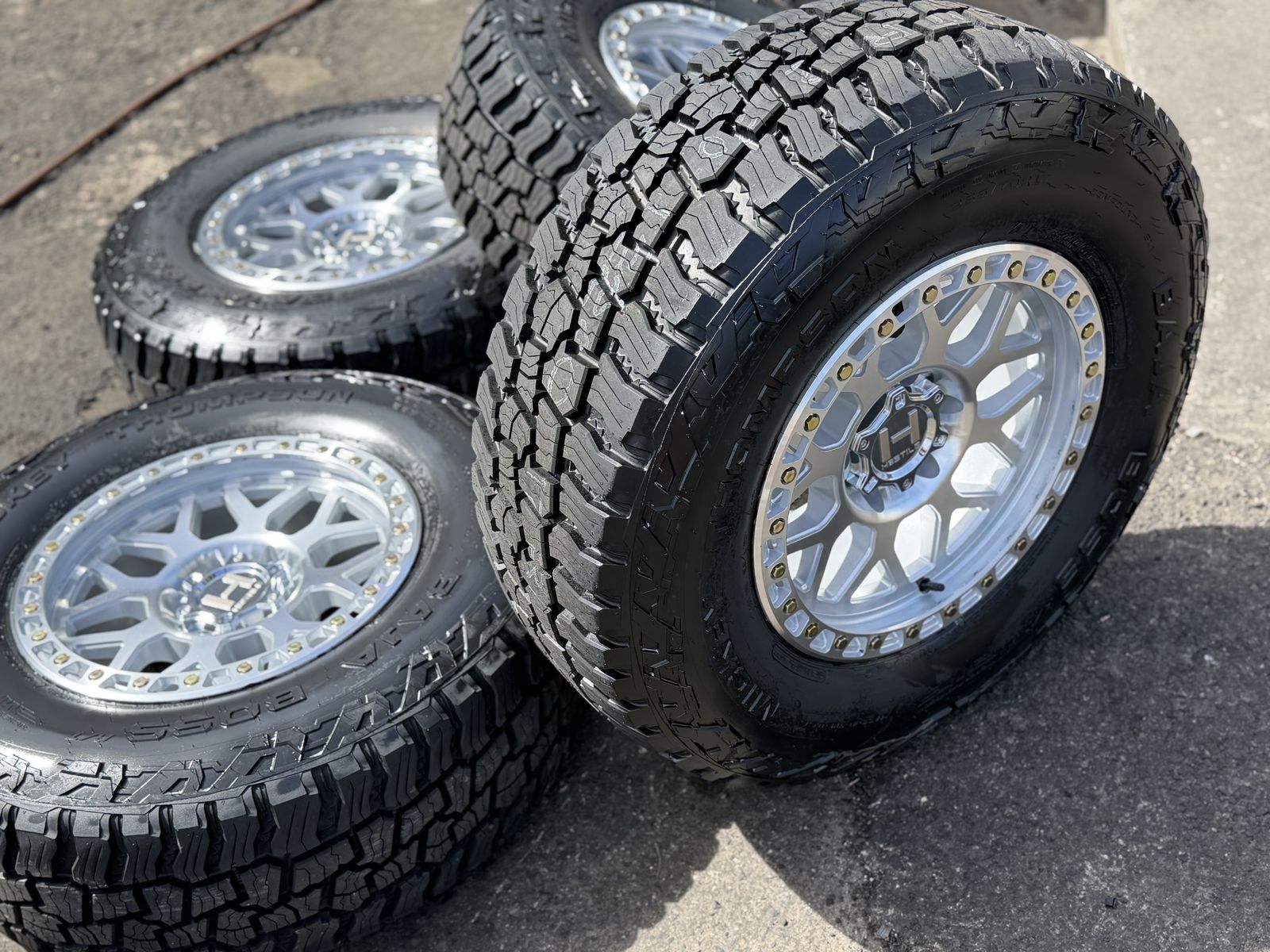Brand new package! Brand new style for 2026 from Hostile this is the H601 Rapture 17x9 00et offset. Silver and machined finish. Mounted and balanced on a new set of Mickey Thompson Baja Boss AT tires 285/70r17. 6x135 bolt pattern. These fit 2004 and newer Ford F-150 and expedition. Huge savings! Priced to sell. Call or txt 801-876-0324