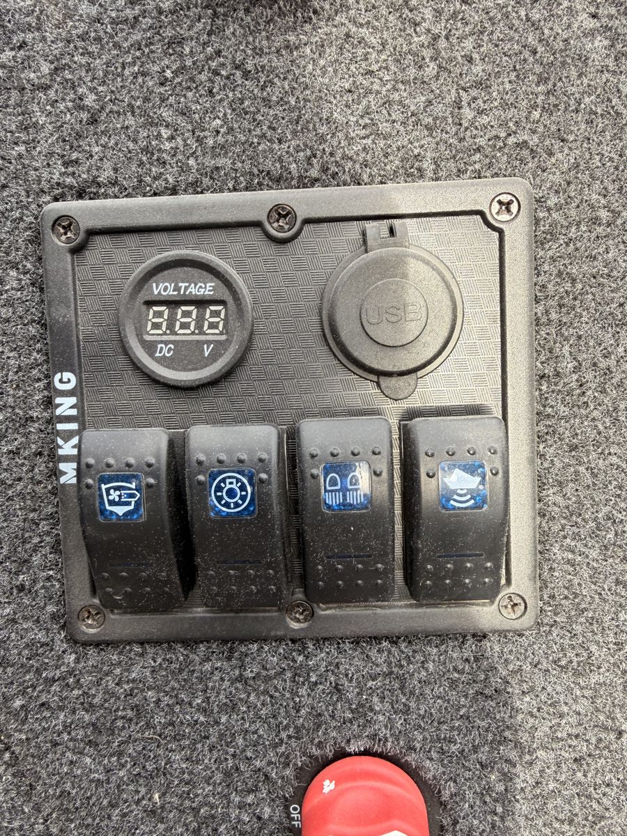 Integrated switch panel for accessories, and battery management system hardwired into bow with standard 110 charger port. ($300 parts alone, lots of meticulous labor)