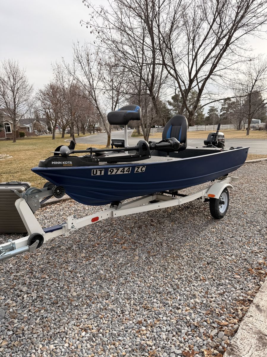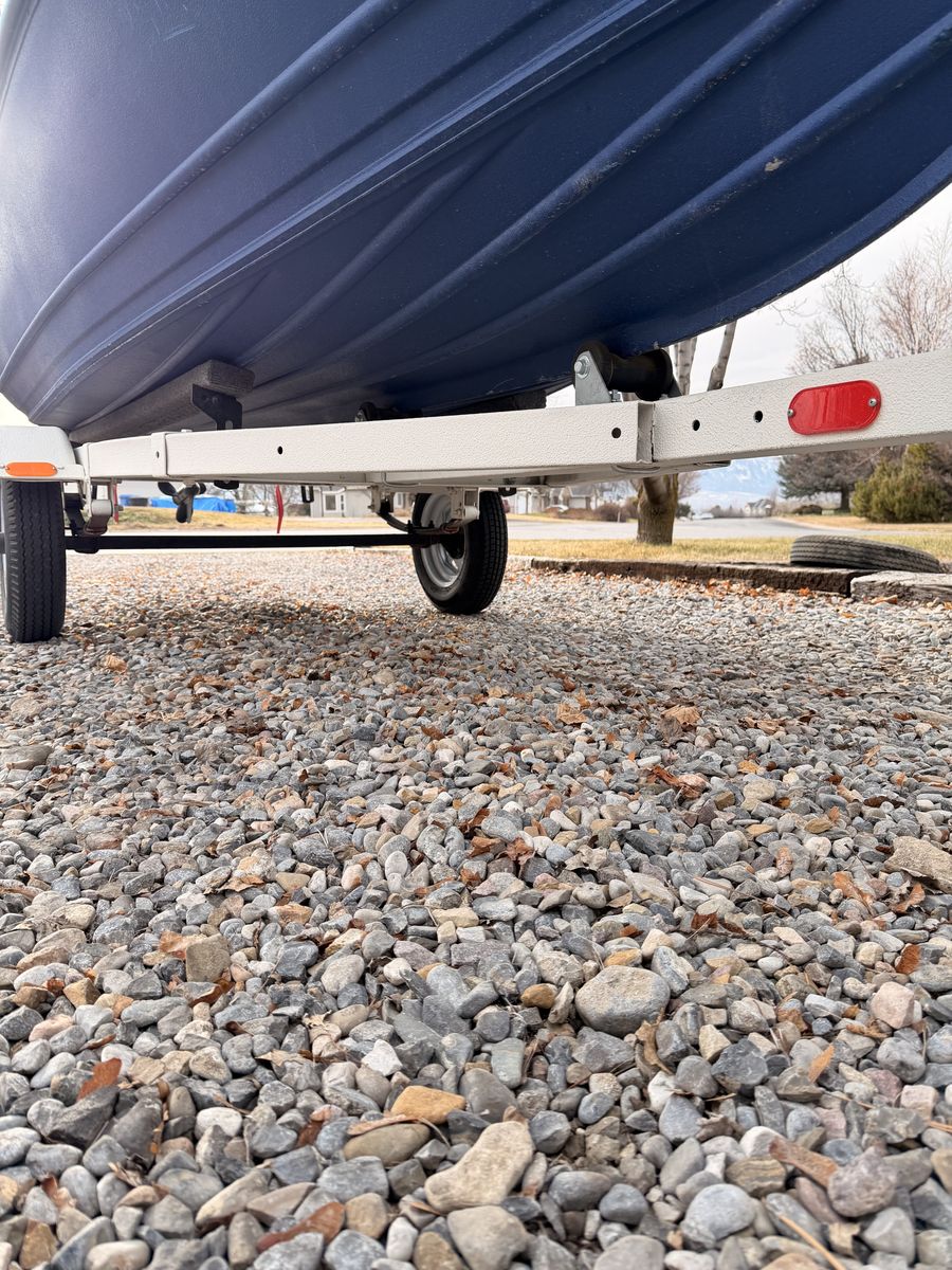 It’s a 12ft welded aluminum hull from 1972, fully coated in marine blue paint scheme, white on the trailer, same treatment.