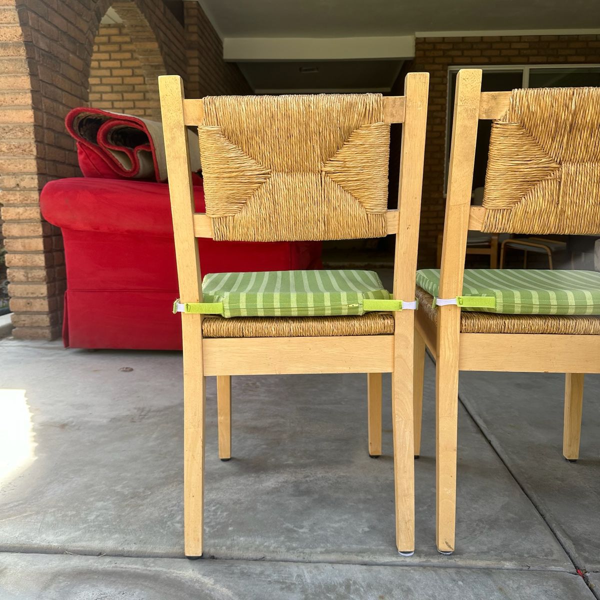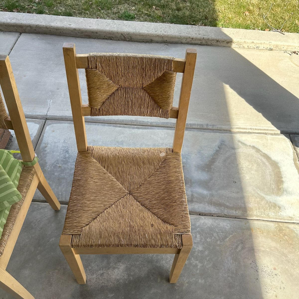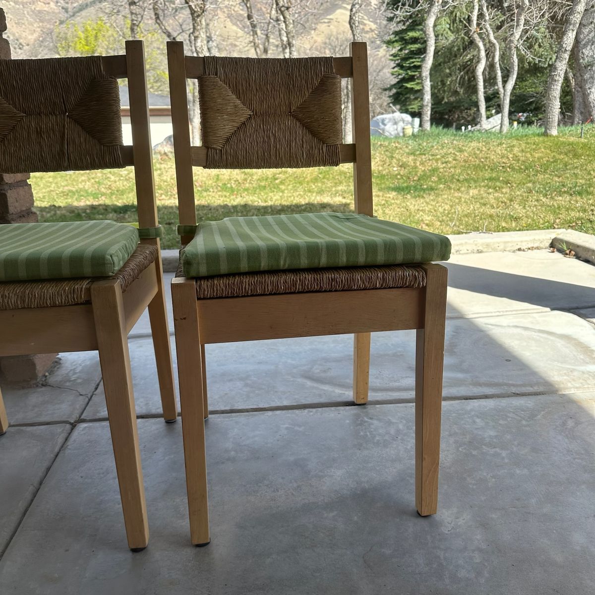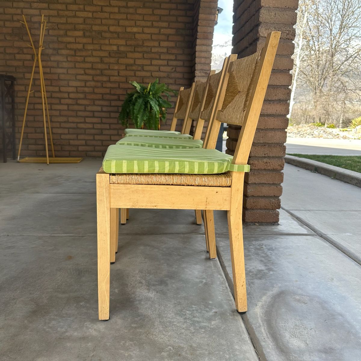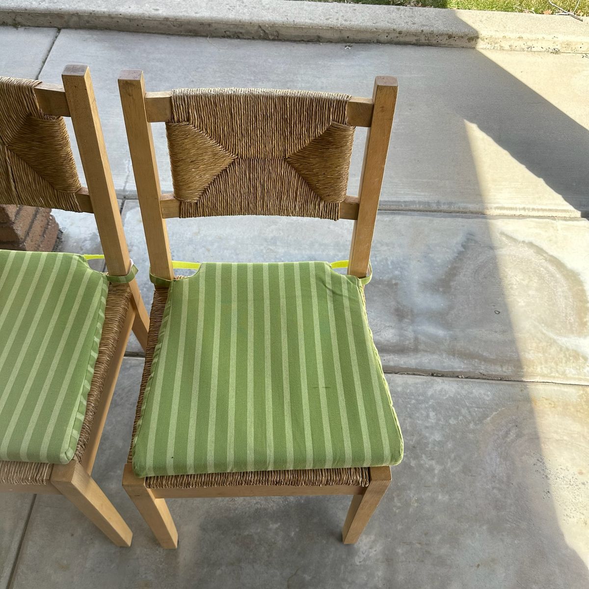 Set of four dining chairs crafted with light-toned wood frames and textured woven rush seats and backrests. These chairs feature a classic ladder-back silhouette with a distinctive diamond-patterned rush weave that adds a rustic, organic touch to any dining space. Included are four removable seat cushions in a vibrant green and lime striped pattern, providing both comfort and a pop of color. The clean lines and natural materials make these versatile enough for farmhouse, coastal, or bohemian interior styles.