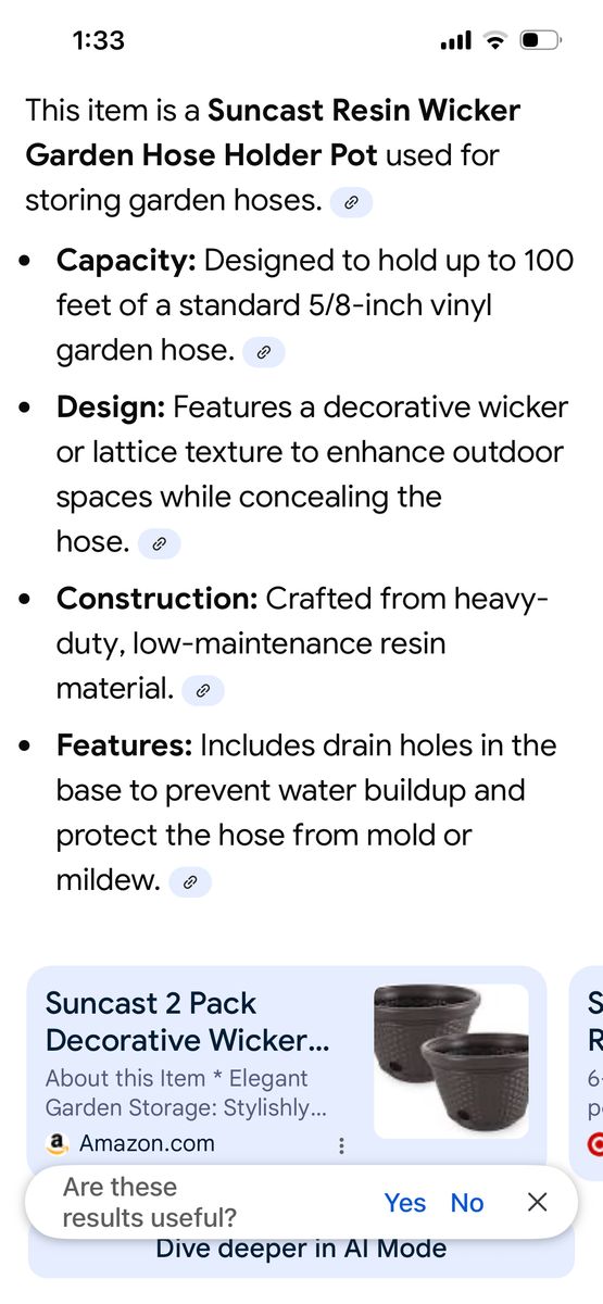VenmoSuncast brand garden hose decorative bowl storage. Easy to use. Helps keep your garden hose, clean and out of the way. Dark brown black color. Smoke free. Cash or Venmo. Located in and picked up from Alpine, Utah.
