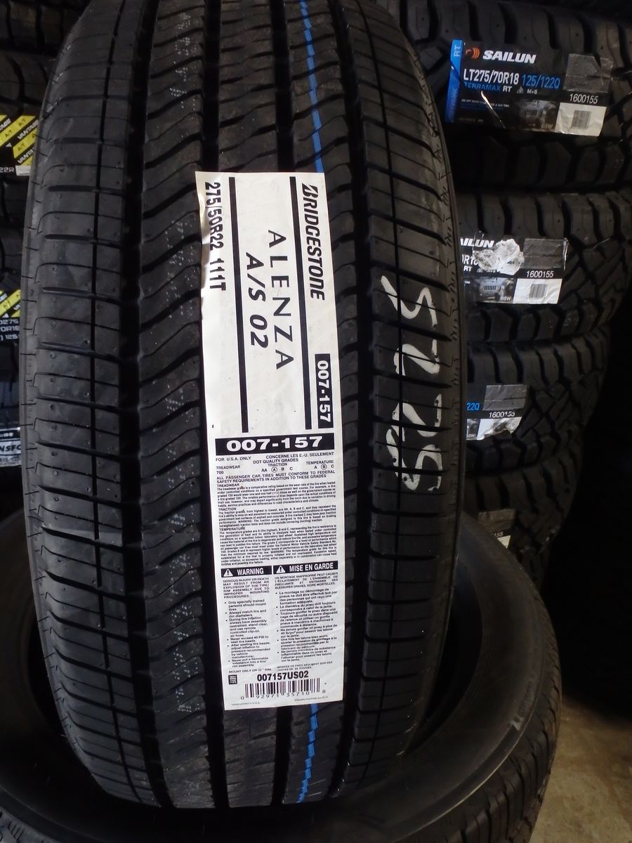J&J TIRES & WHEELS SET OF BRAND NEW TIRES 275/50R22 BRIDGESTONE ALENZA A/S 02 FOR ONLY $880 THESE IS A GREAT TIRES FOR ANY WEATHER CONDITIONS, WE WILL INSTALL THEM FOR AN ADDITIONAL $20.00 PER TIRE INSTALLATION INCLUDES MOUNTING,BALANCING,VALVE STEAM AND TIRES DISPOSAL FEE,CALL FOR ANY QUESTIONS AT JOSE OR ROBERTO 801-878-4556 801-410-4460 OR VISIT US,WE'RE OPEN MONDAY TO SATURDAY FROM 9:00 AM TO 6:00 PM..WE HAVE A LOT'S A MORE AN NEW TIRES AND WHEELS CALL US IF YOU ARE LOOKING FOR A DIFFERENT SIZE....