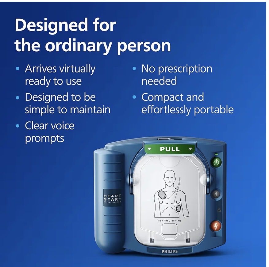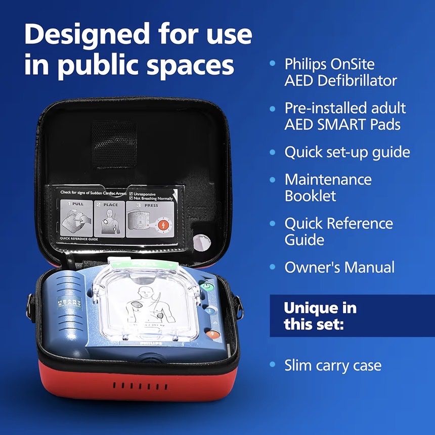 Selling a brand-new Philips HeartStart OnSite (HS1) AED Defibrillator. This unit is in brand new condition and has never been activated. The battery pull-tab is still intact, and the adult pads are factory-sealed.
