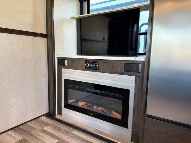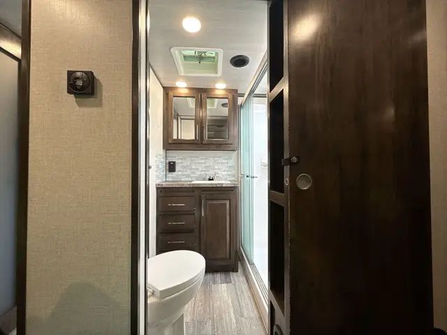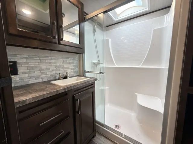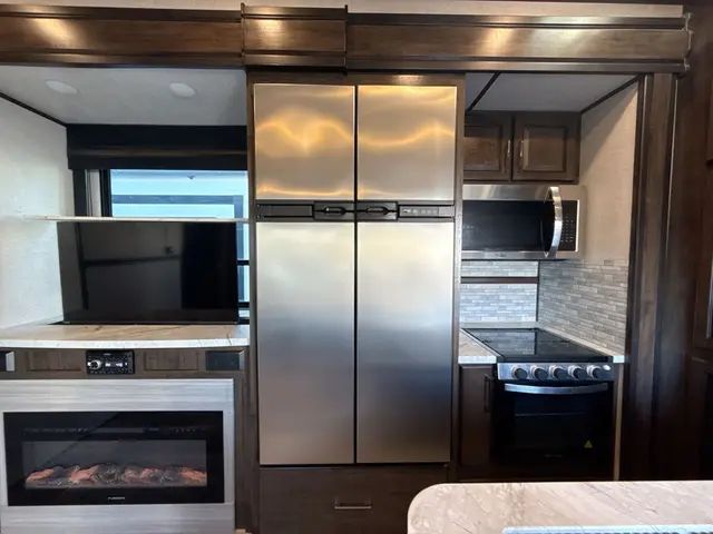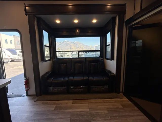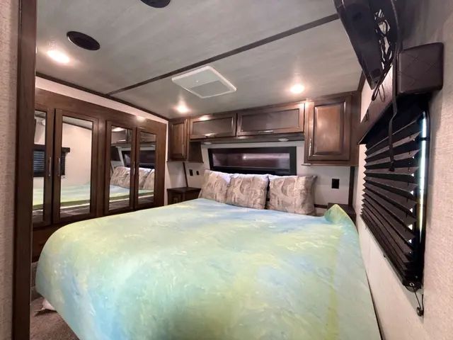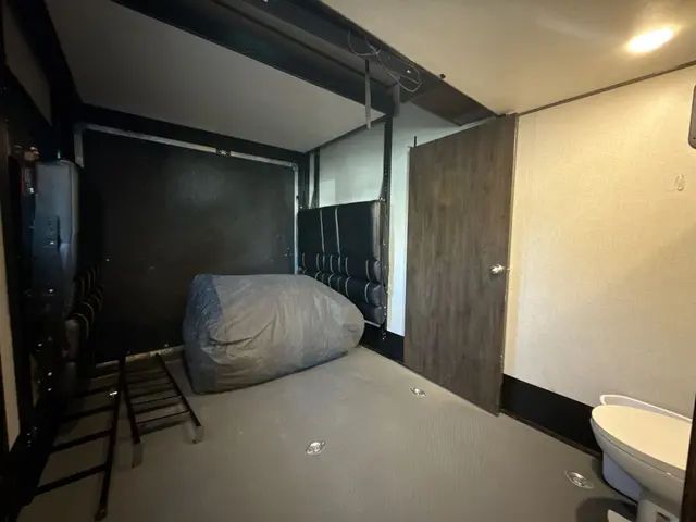 VERY CLEAN! 14’ Separate Garage!, 3 slides, Generator Onan 5500 Watt, Fuel station, Large Kitchen & Fridge SLIDE! Massage/heat Couch Slide, Double Rear Electric Queen Beds (Bottom bed makes into Booth Dinette), Front Bed with wardrobe slide, Electric patio awning, (2) AC units and Heat. 2 bathrooms. Auto leveling system.