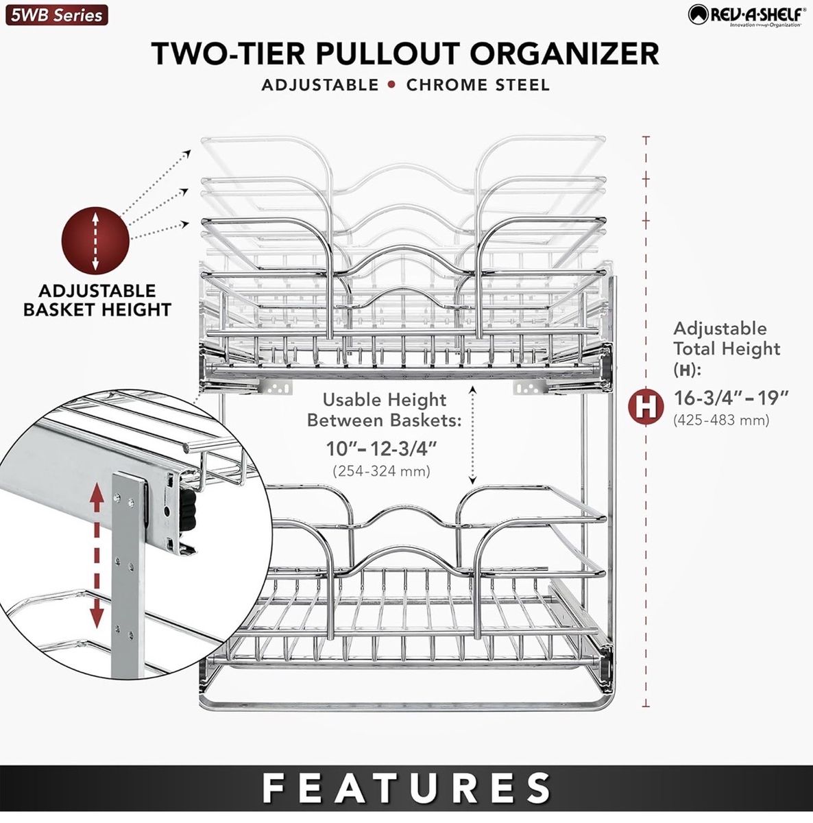 2-tier sliding pull-out design Heavy-duty chrome wire baskets Great for pantry, under-sink, or base cabinets Smooth slide-out system for easy access Size: 15” x 22” (model 5WB2-1522CR-1)