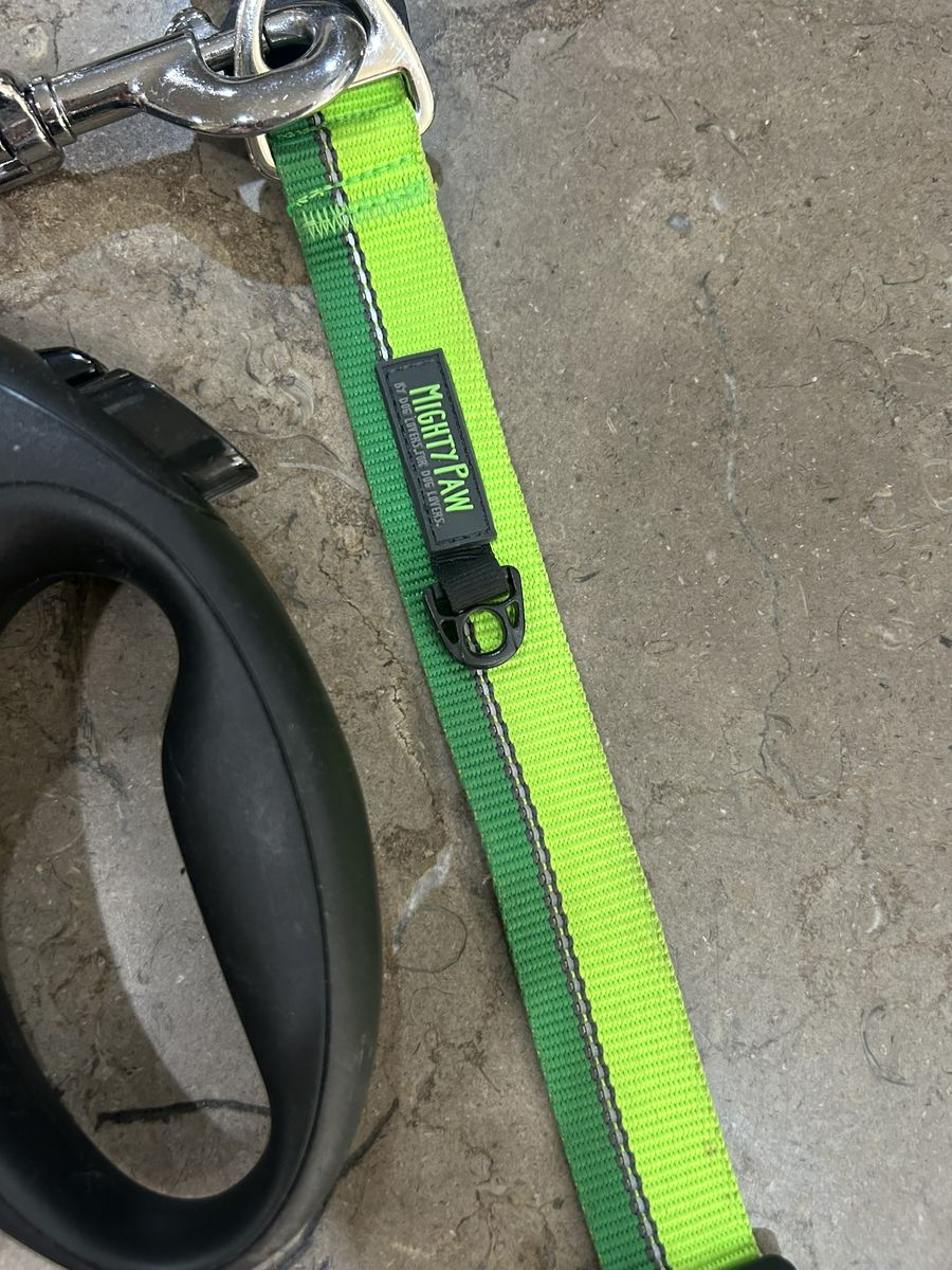 Mighty Paw collar hooked to Flexi retractable leash