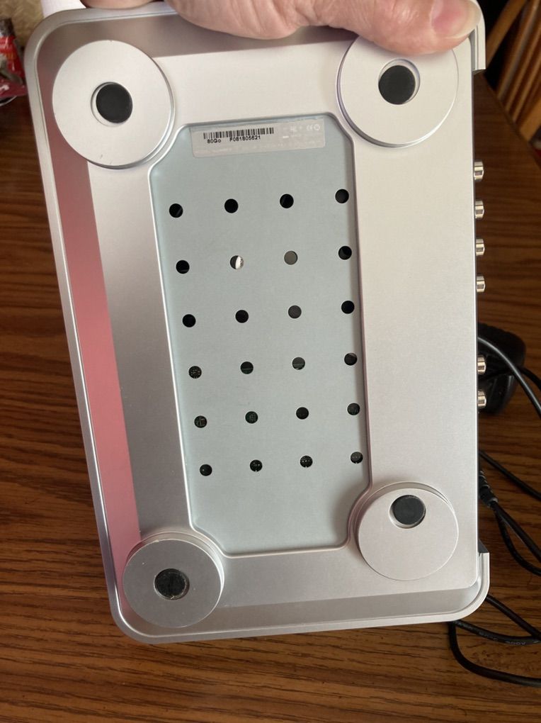80 GB and is missing the remote. Only comes with AC adapter. Picture shows what they look like in case you need to purchase one.