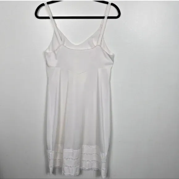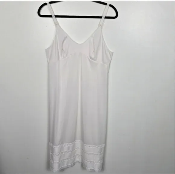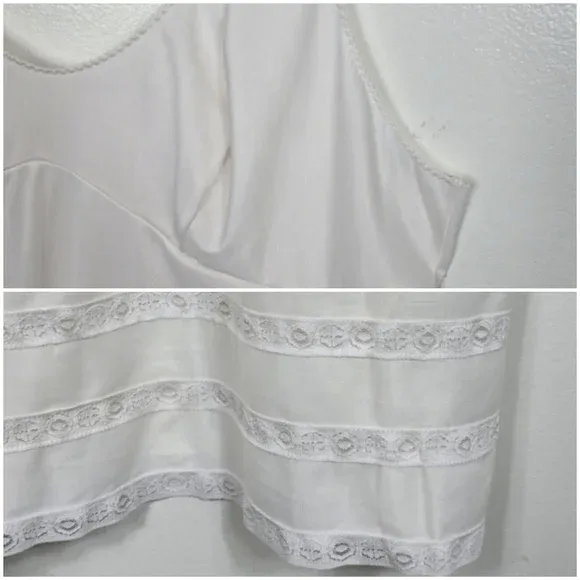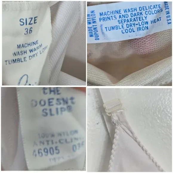 2 - Sears The Doesn't Slip Anti Cling Chemise Full Slip Dress White 36 Previously owned, great condition - **please see stitch repair on strap last pic Solid bust and body Lace trim at hem 100% Anti-Cling Nylon - Machine Wash Adjustable straps Pit to pit 18" Waist 32" Hip 38" Length from top of bust to hem 37"