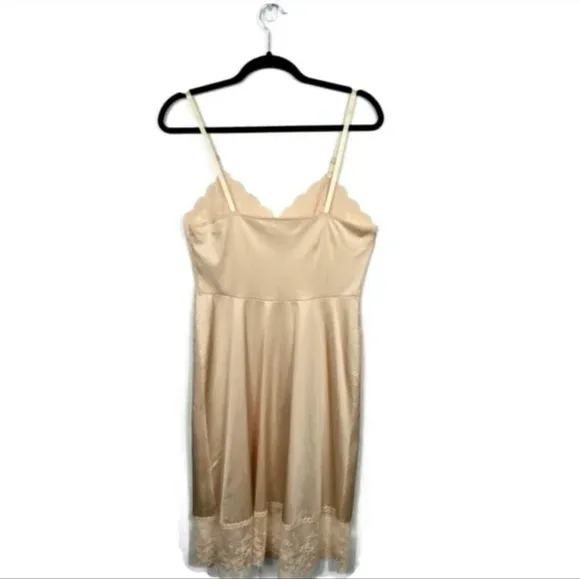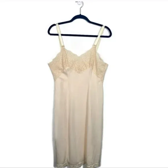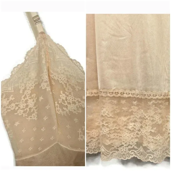 Listed in order of appearance: 1 - Vanity Fair Lace Full Slip Dress Chemise Size: 34 L Champagne Excellent Used Condition Lace and tulle bust and hem Adjustable straps 100% Antron Nylon - Machine Wash Pit to pit 18" Waist 30" Hip 40" Length from top of bust to hem 37"
