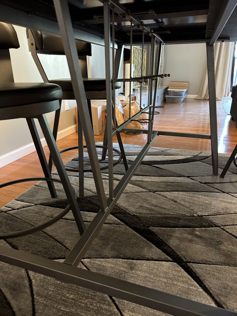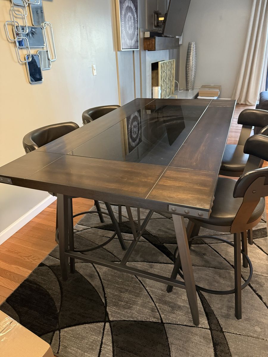 Venmo3 years old, barely used. Counter height dining room table with 4 slot wine rack underneath and 4 matching bar stools.