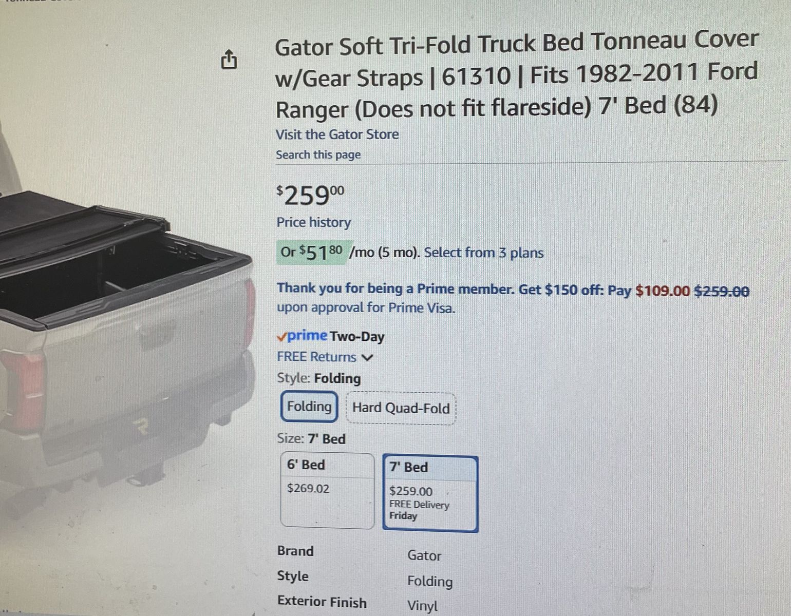 VenmoGator Tri-fold soft tonneau cover fits 1987 - 2011 Ford Ranger with 7’ bed. Text is best.