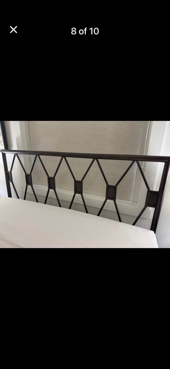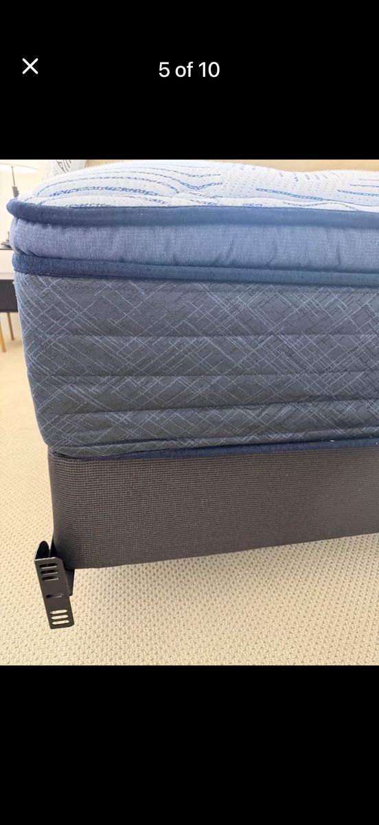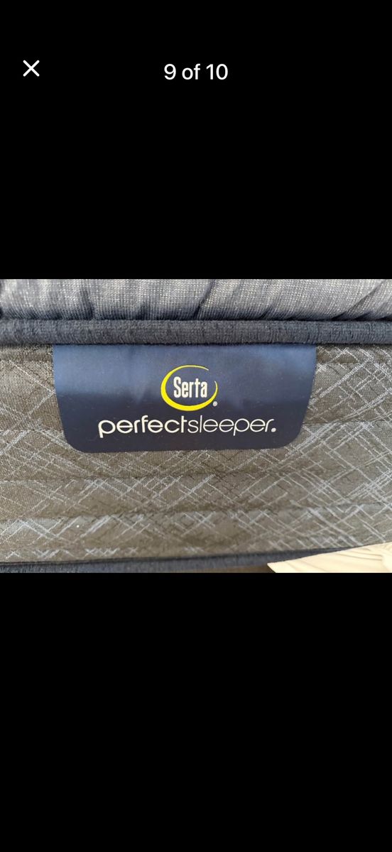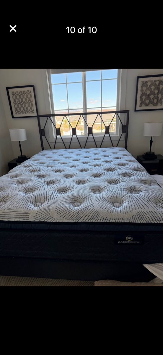 Queen Serta sleeper, pillow, top mattress, mattress, cover, sheet set, two pillows, comforter, two nightstands, two lamps, headboard with frame.