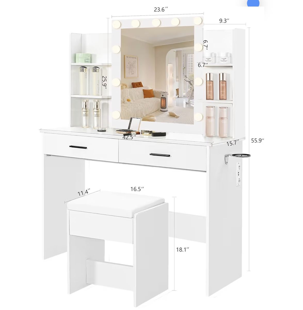 KAMABOKO Vanity Desk with Lighted and Mirror, White Makeup Table with Drawers and Charging Station, 3 Model Adjustable for Bedroom & Dressing Room (010 White)
