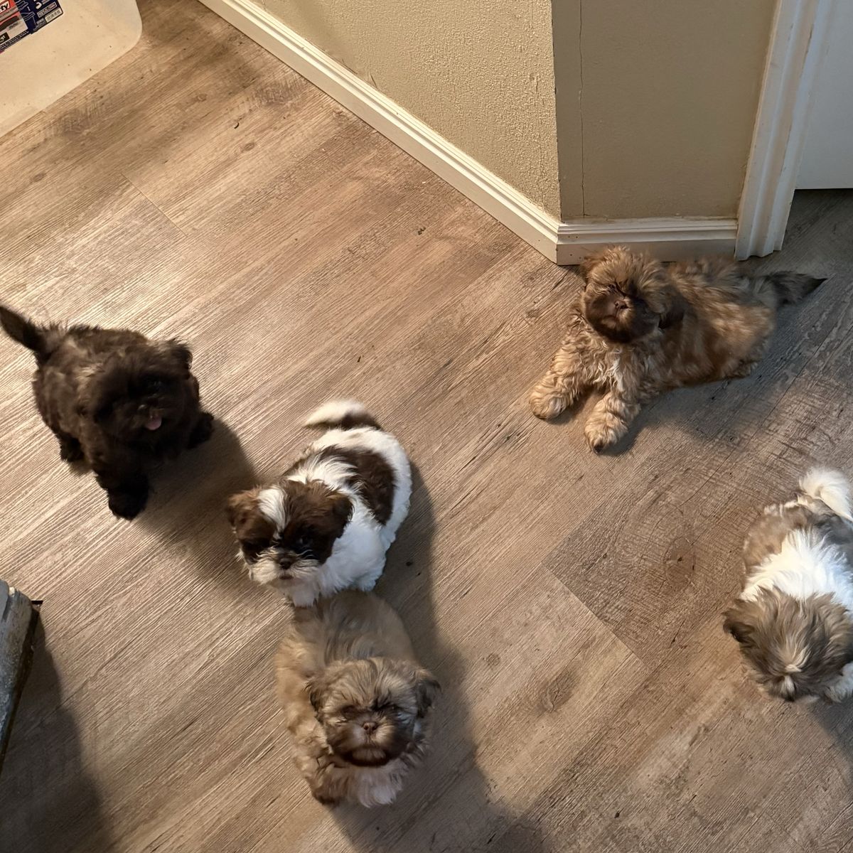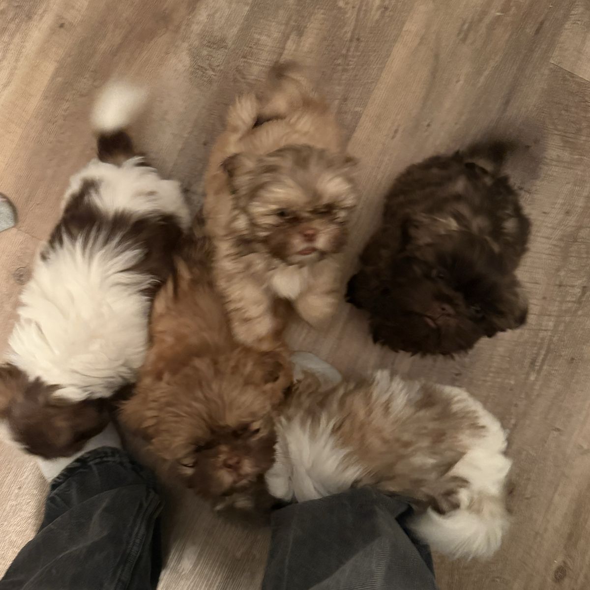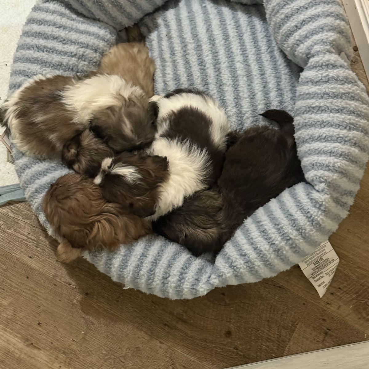5 puppies available: Female - Light brown and white Female - Light tan Male - Chocolate Male - Dark brown and white Male - nutmeg coloring