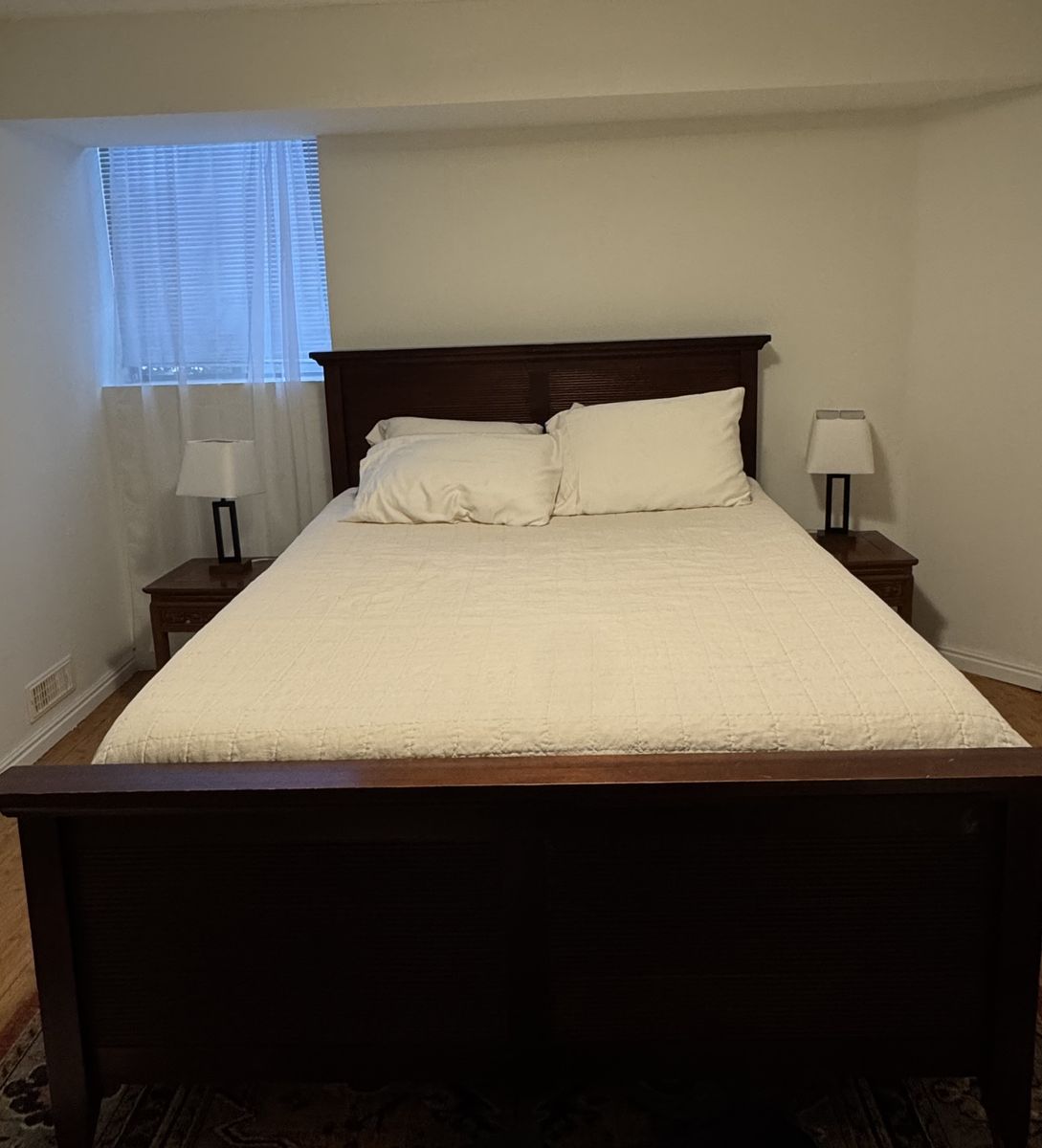 VenmoWood queen bed frame, some scratches on headboard. Wood slats included.