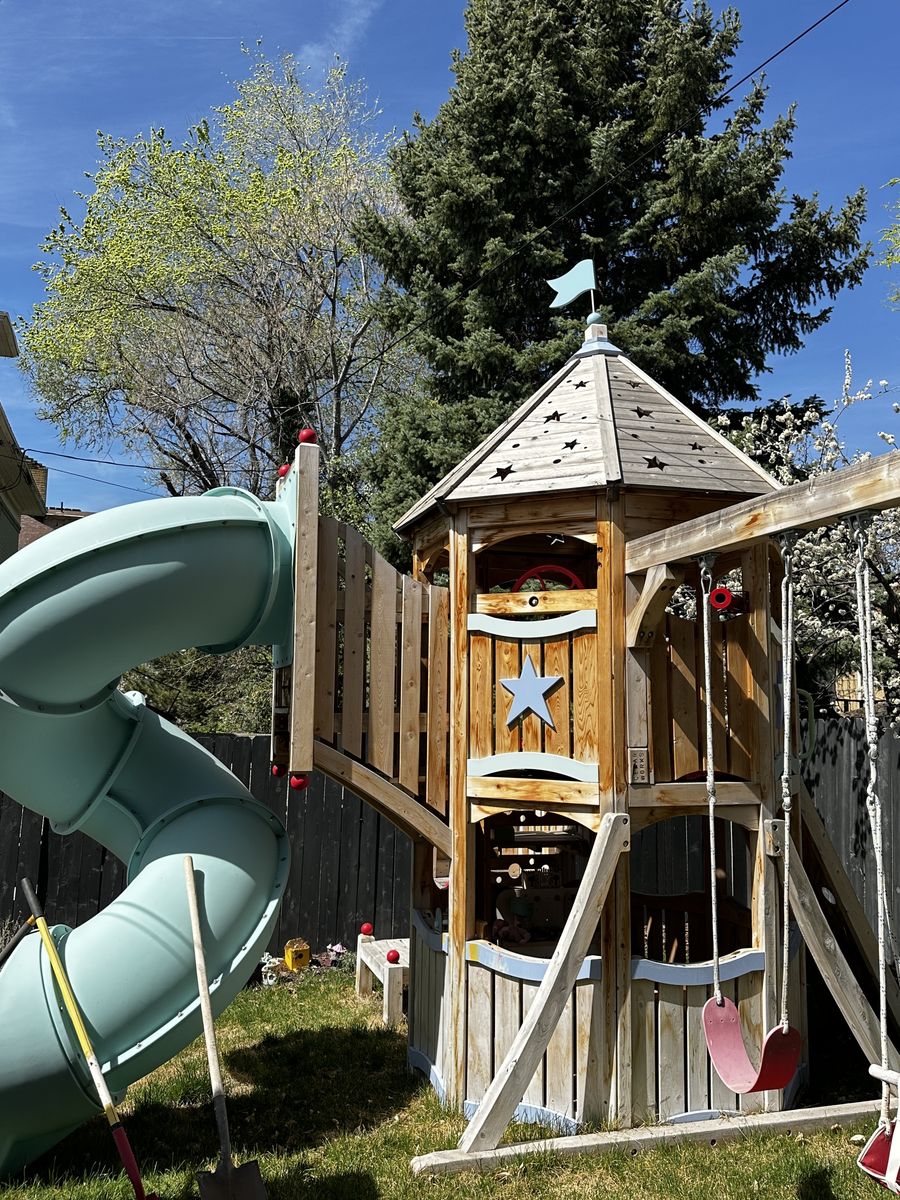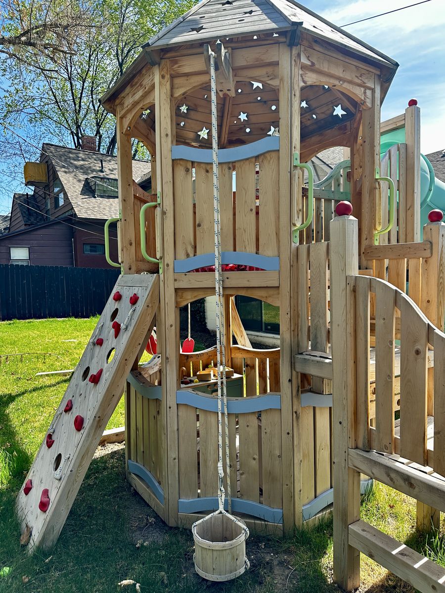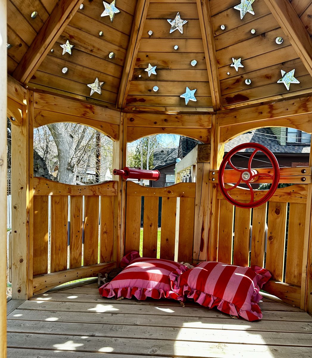 • Two-level fort — upper crow’s nest + lower covered playhouse