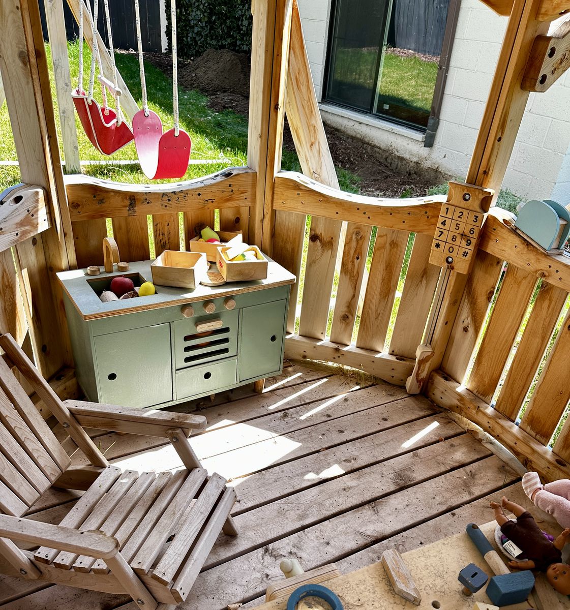 • BONUS ITEMS INCLUDED: Play kitchen (sage green, Montessori-style) Kid's Adirondack chair Misc play tools and kitchen accessories