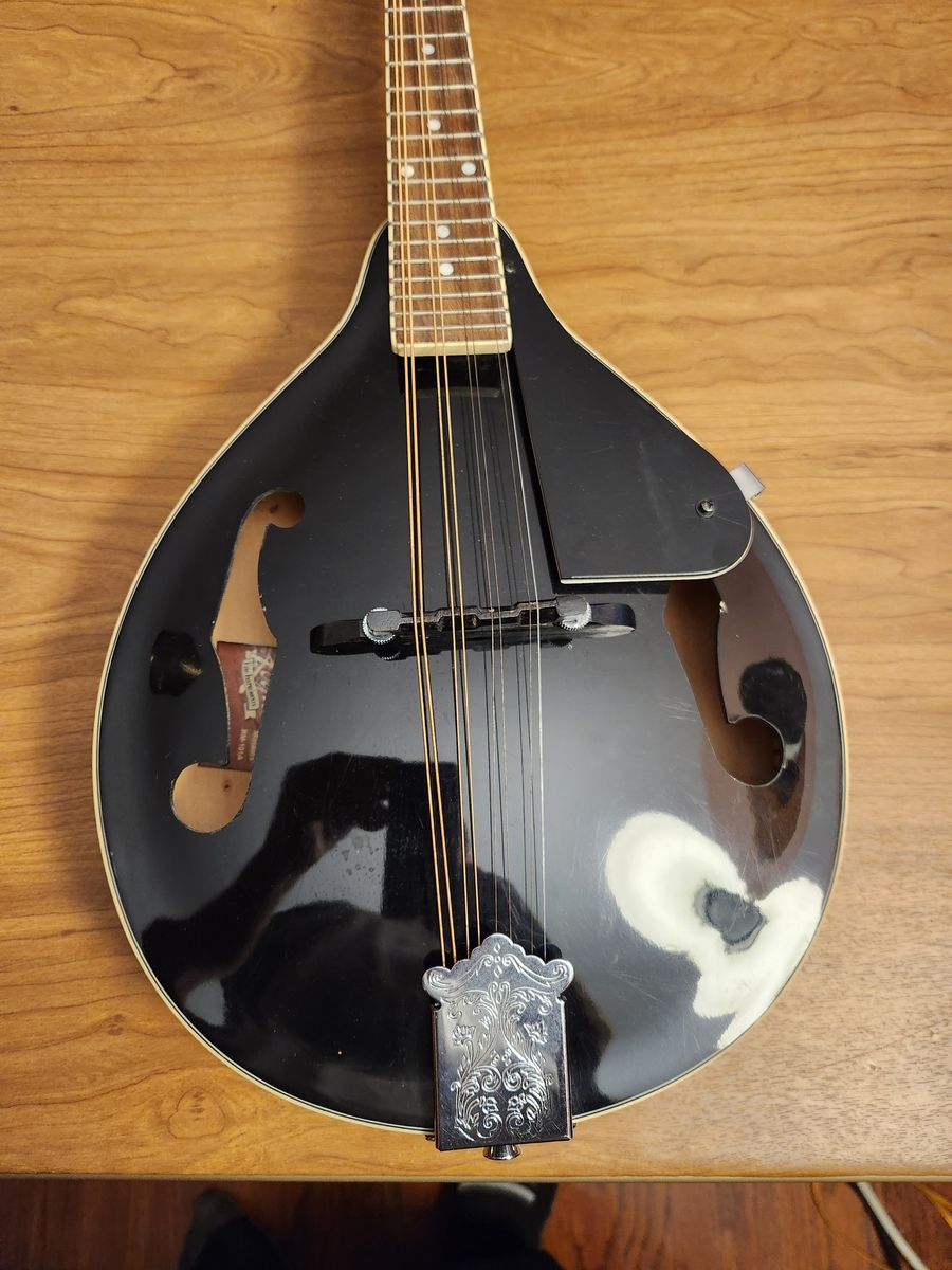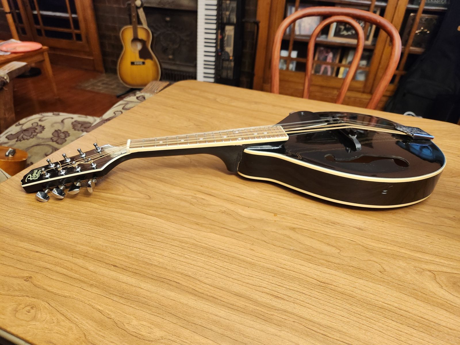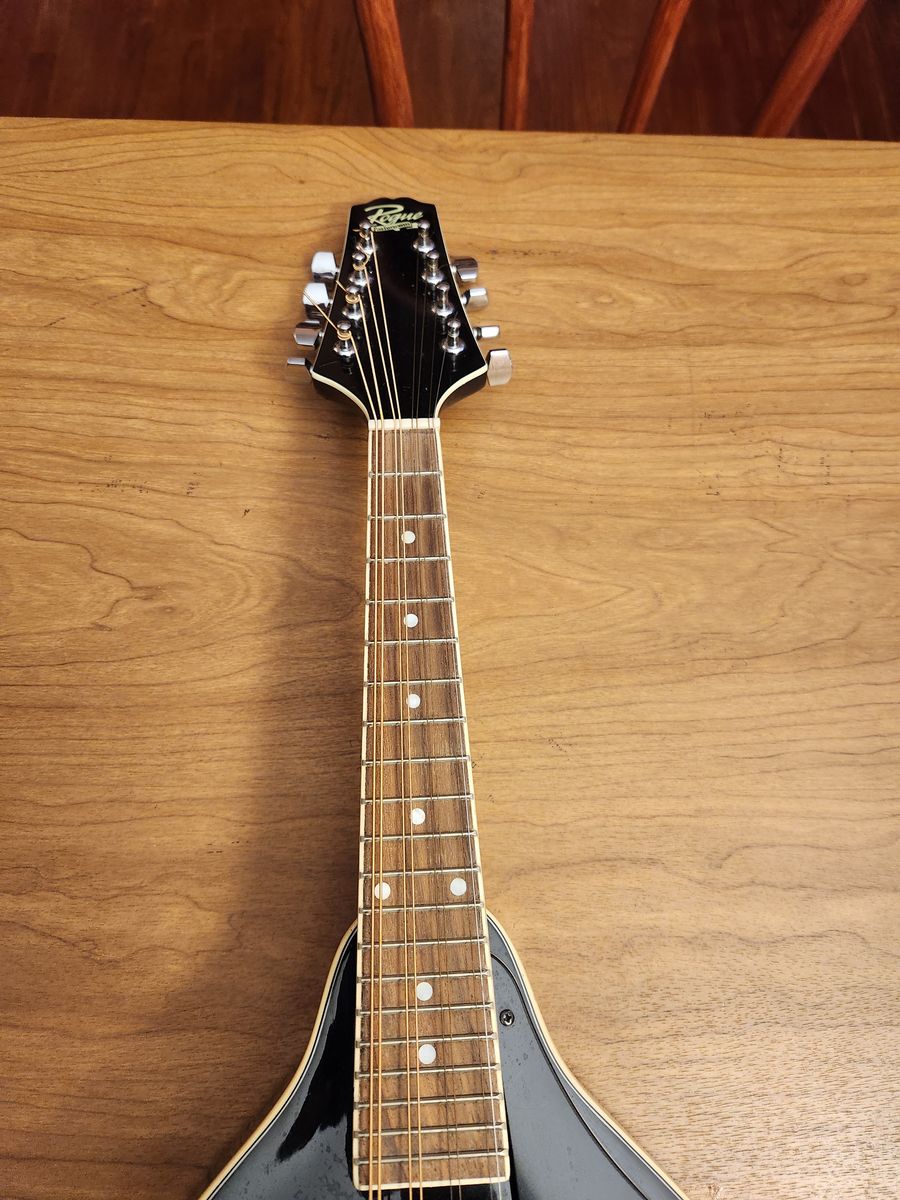 Rogue Mandolin. Sounds and plays great. It does have a tiny bit of damage...I don't know the back story of it, but it cracked a little where the neck attraches to the body but it was repaired by soneone (not professionally). It is straight and the strings sit fairly low.