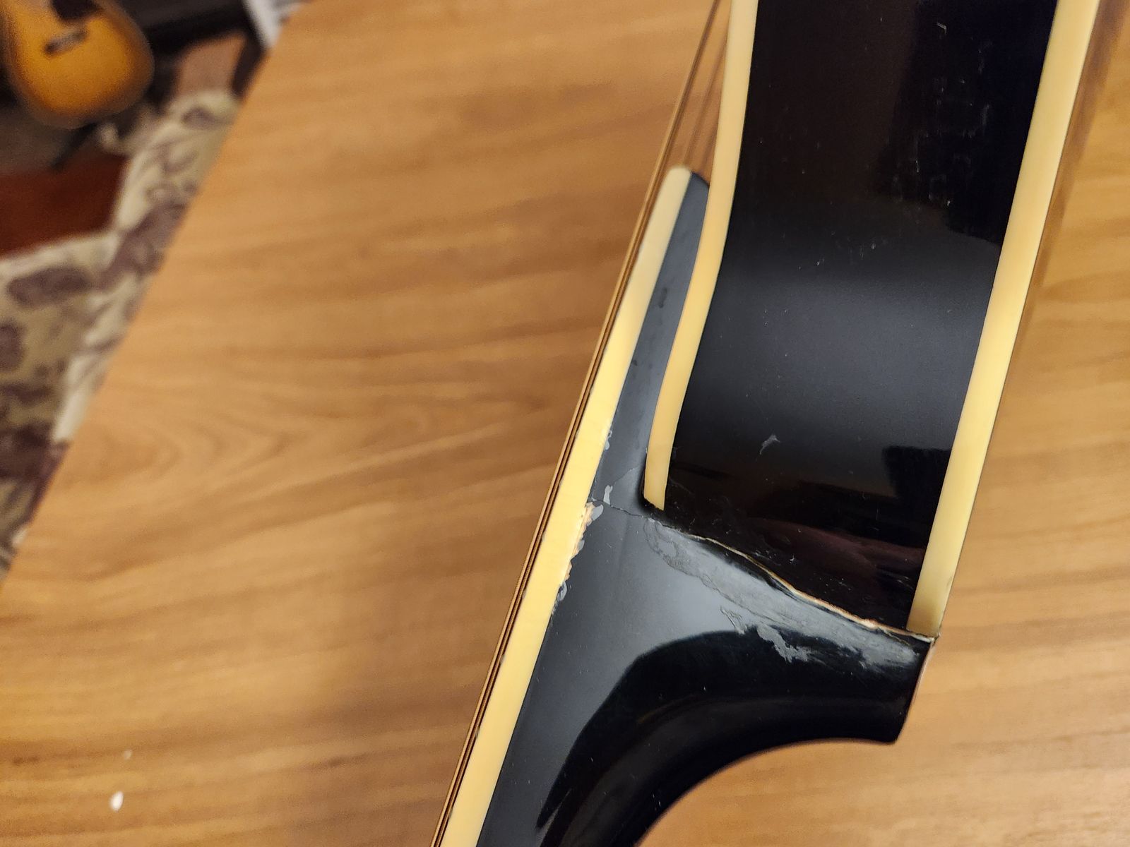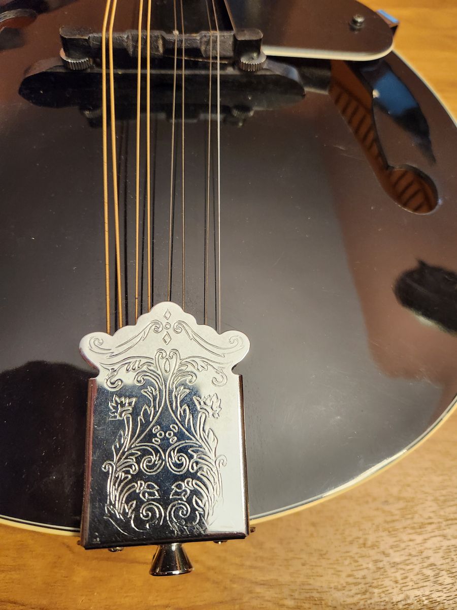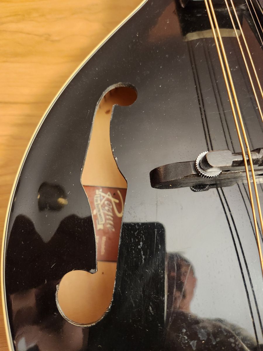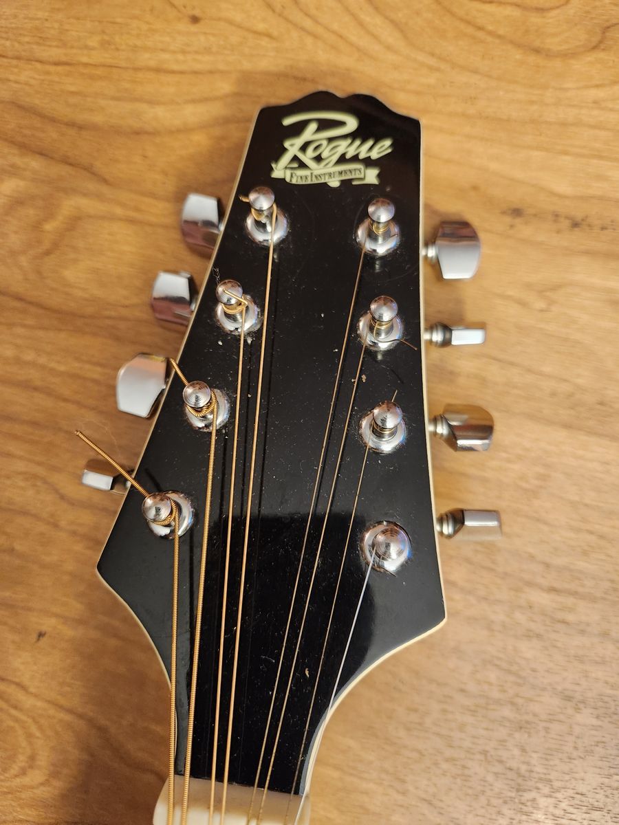 Rogue Mandolin. Sounds and plays great. It does have a tiny bit of damage...I don't know the back story of it, but it cracked a little where the neck attraches to the body but it was repaired by soneone (not professionally). It is straight and the strings sit fairly low.