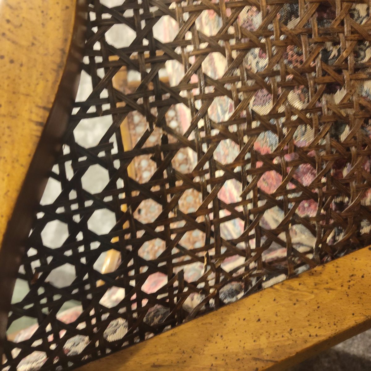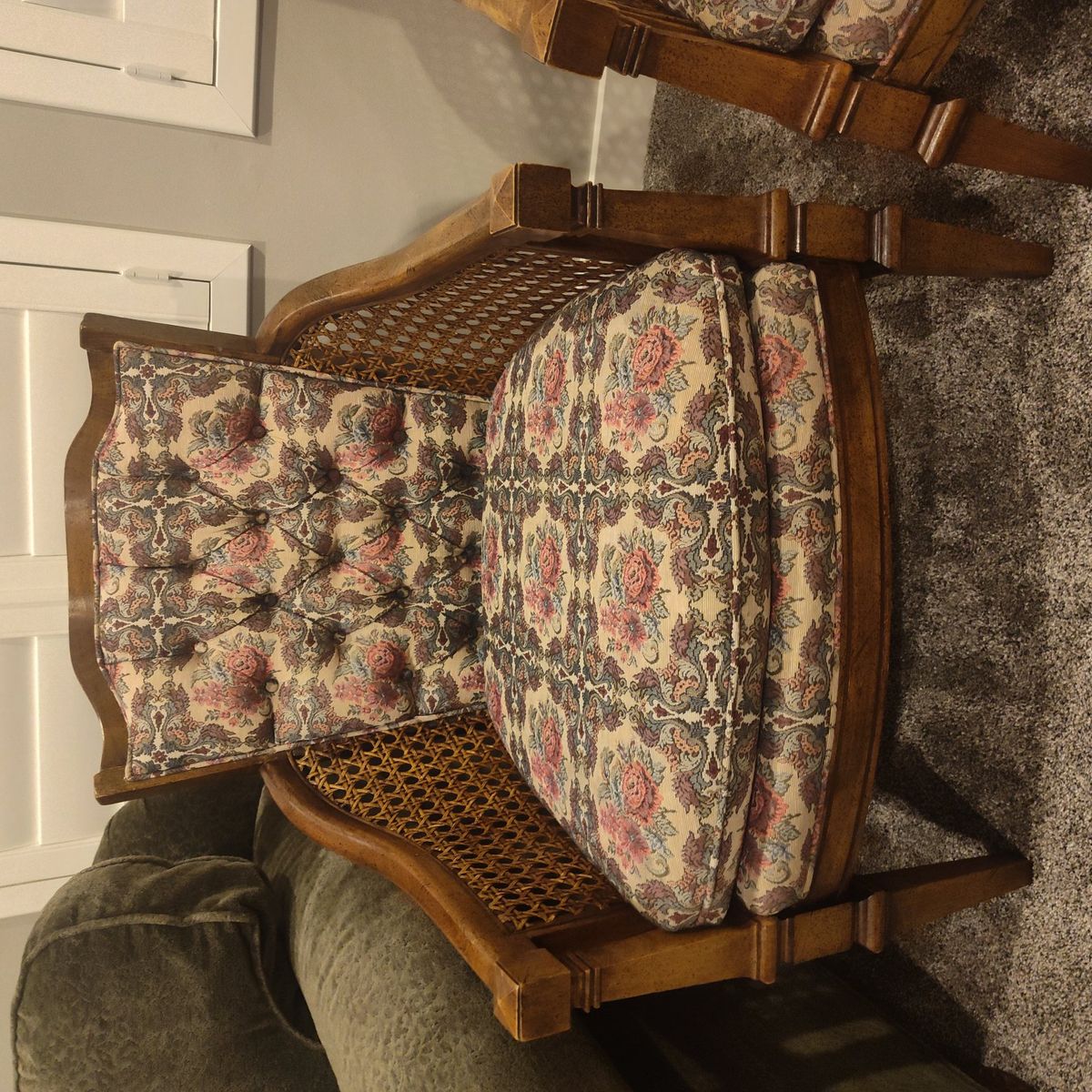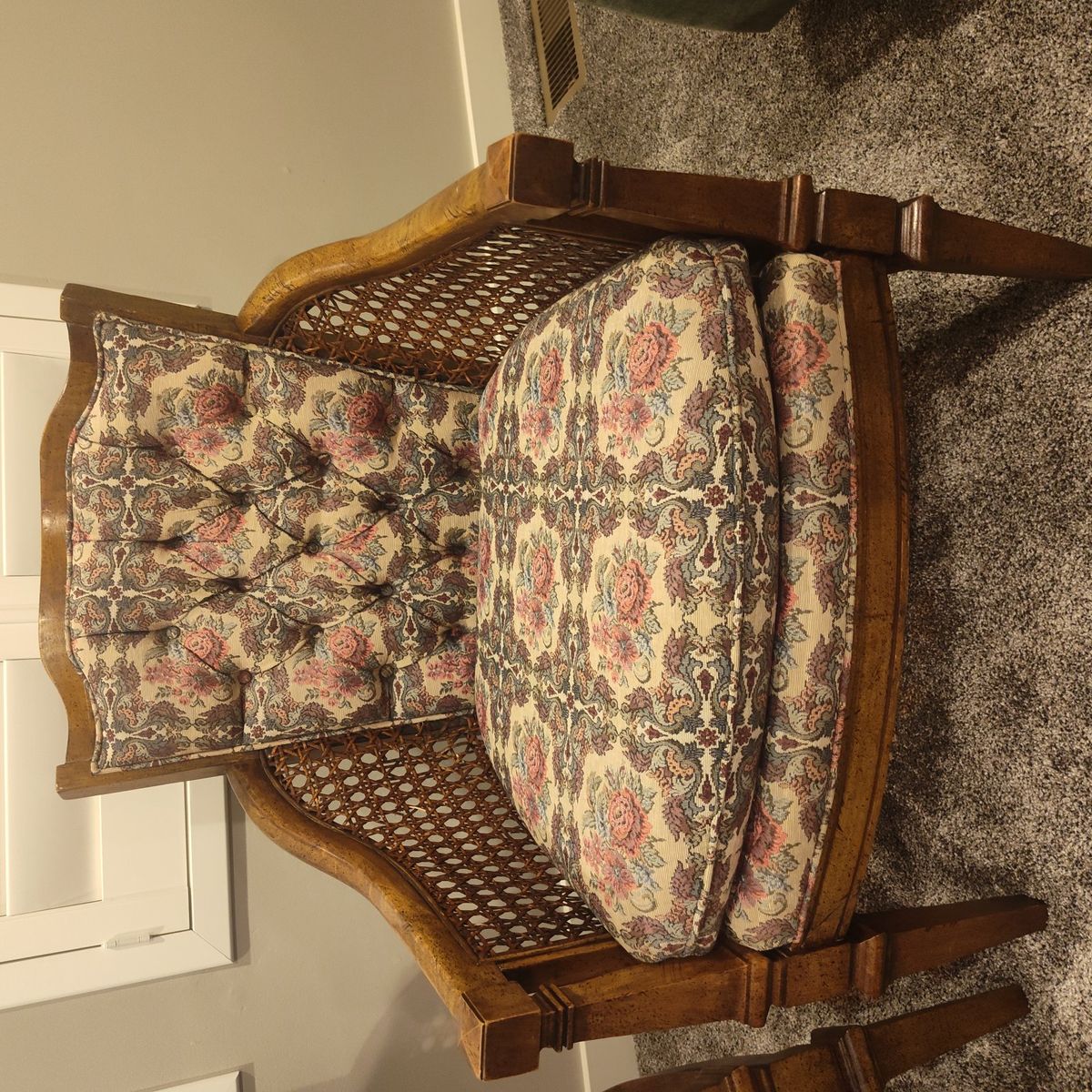 VenmoVintage French Provincial-style barrel chair featuring a wooden frame with cane panel sides and tufted, floral-patterned upholstery. very good condition. very little wear. $175 for both