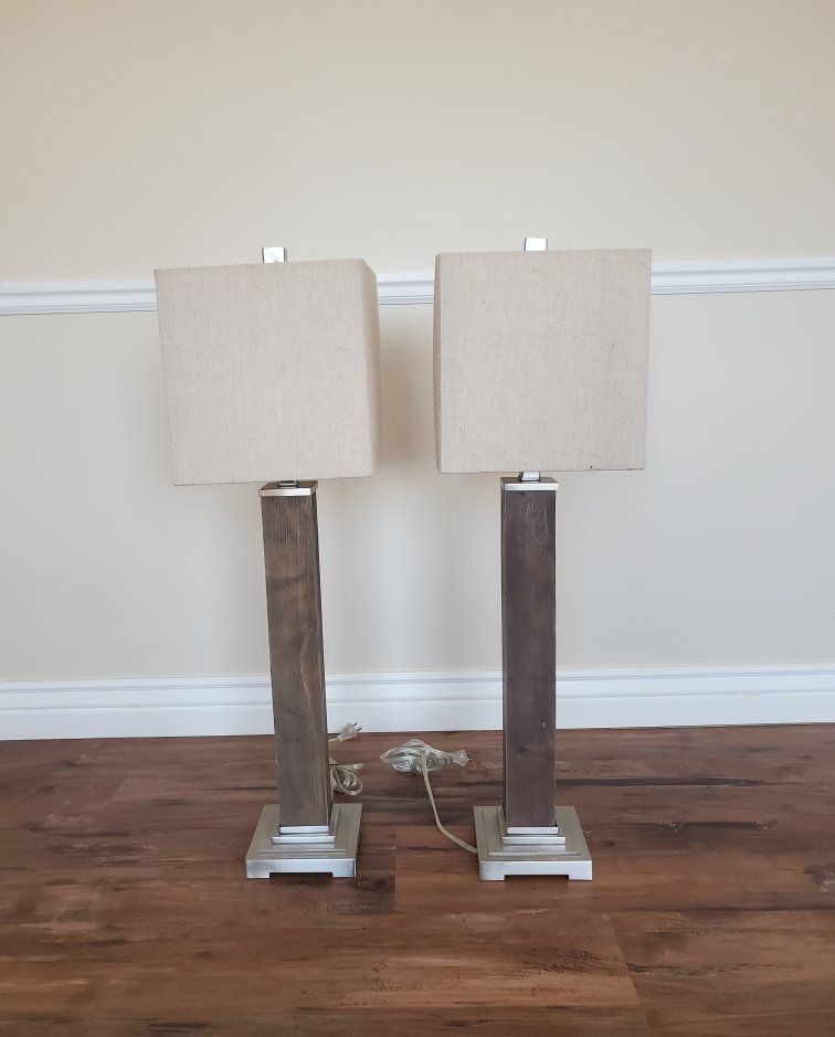 Solid wood base finished in an aged gray wash accented with brushed nickel plated details. The square hardback shade is a taupe-beige fabric with natural slubbing