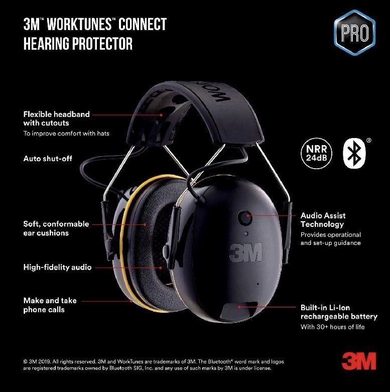 3M WorkTunes Connect Hearing Protector with Bluetooth Wireless Technology combines a modern, comfortable design with high-fidelity sound quality. Equipped with Bluetooth Wireless Technology, these hearing protection headphones allow you to stream the entertainment of your choice from your smartphone or other mobile device, while providing hearing protection in noisy environments. The low-profile and lightweight design is crafted with style in mind. Built-in comfort features such as soft ear cushions and a hat-compatible headband are excellent for extended wear. Whether you're using a power saw or mowing the day away, reach for 3M WorkTunes Connect Hearing Protector with Bluetooth Wireless Technology to help make your workday entertaining and-most importantly-comfortable.