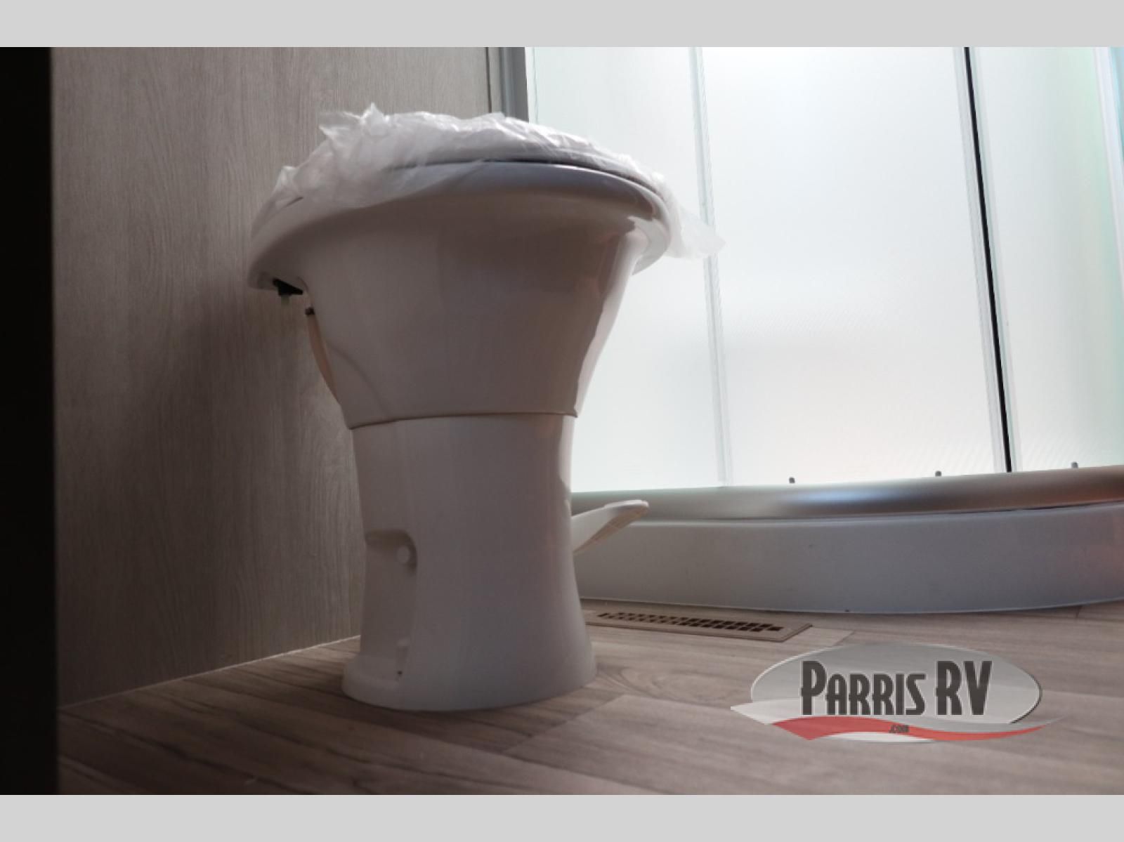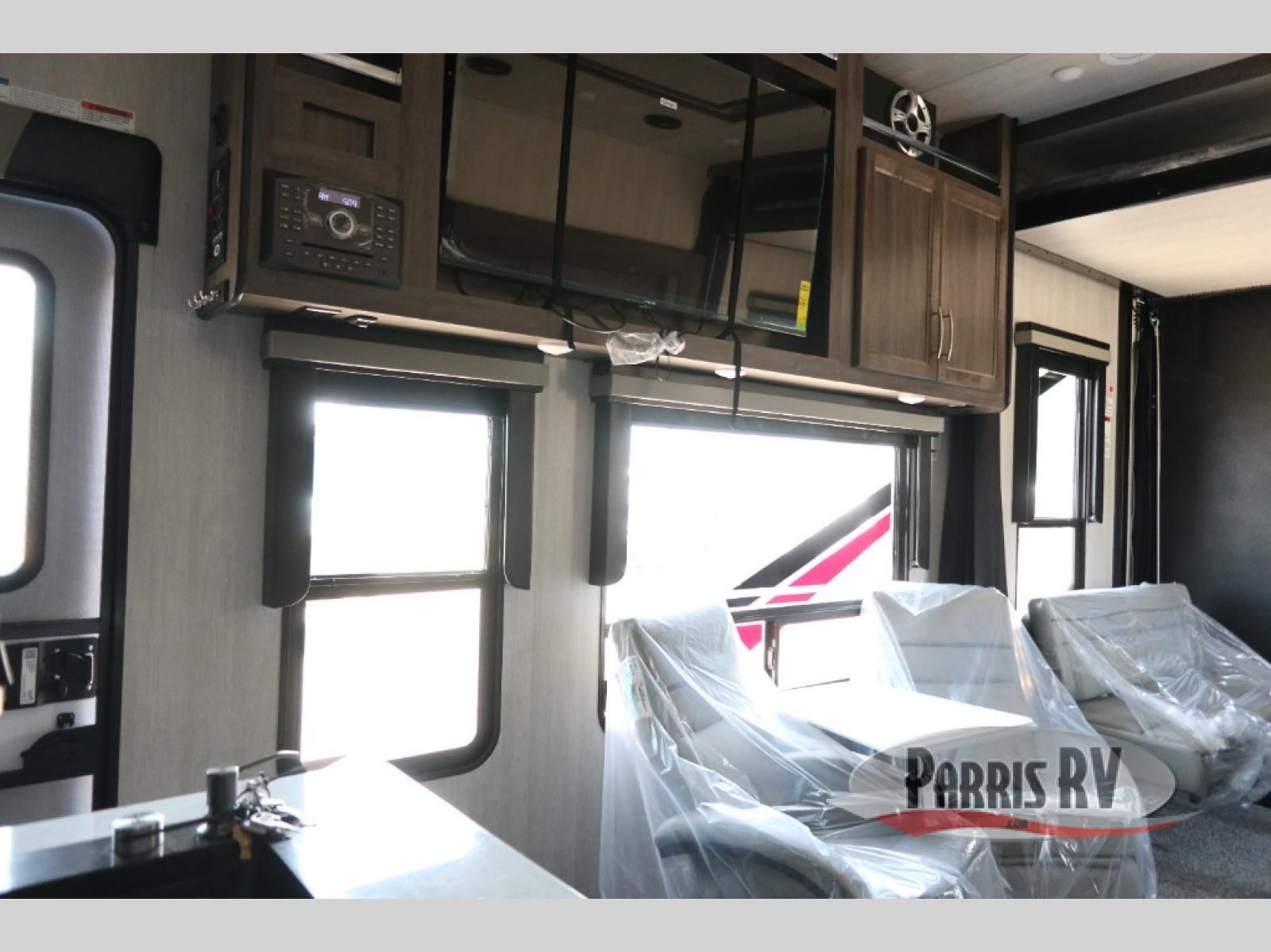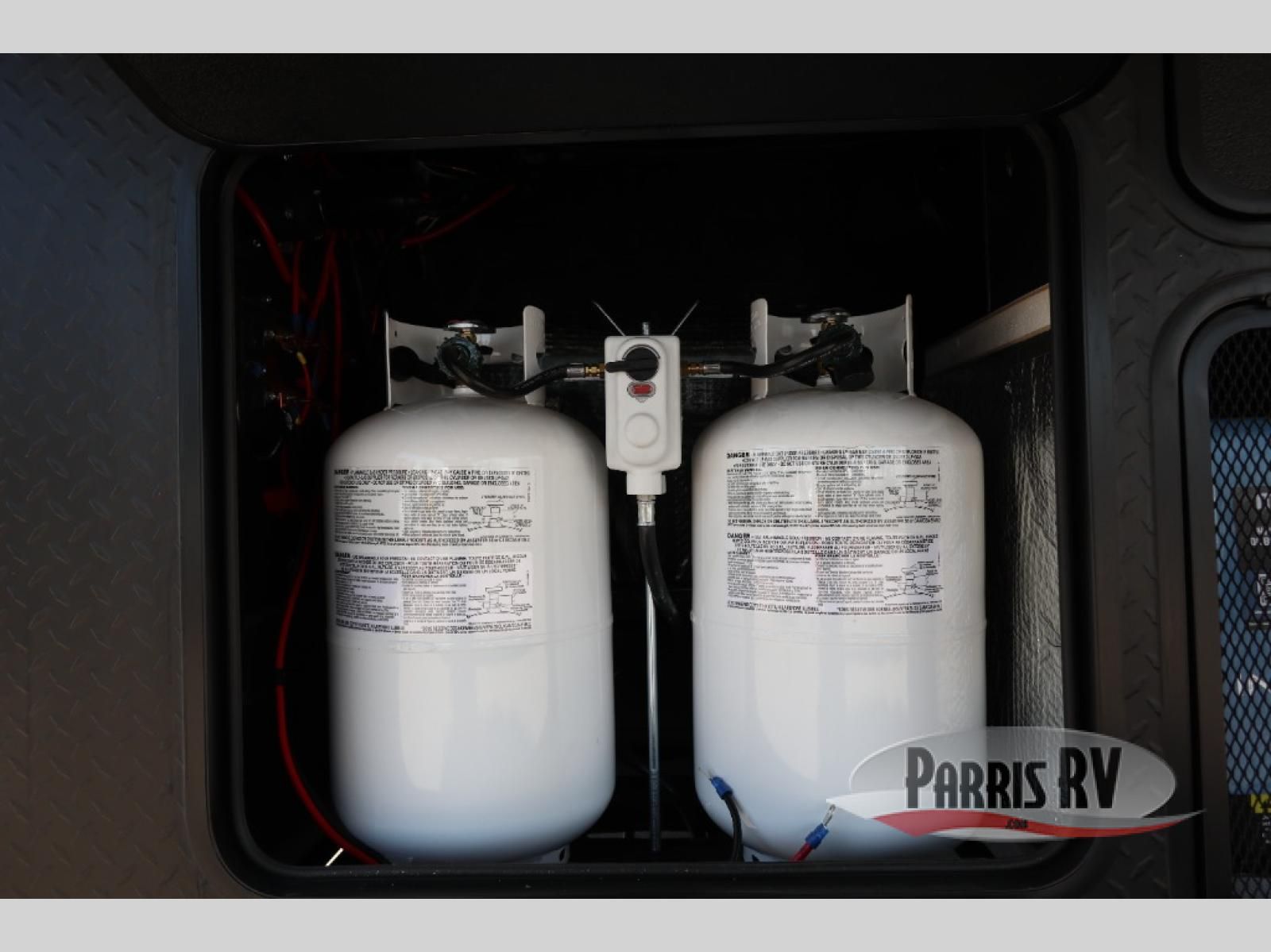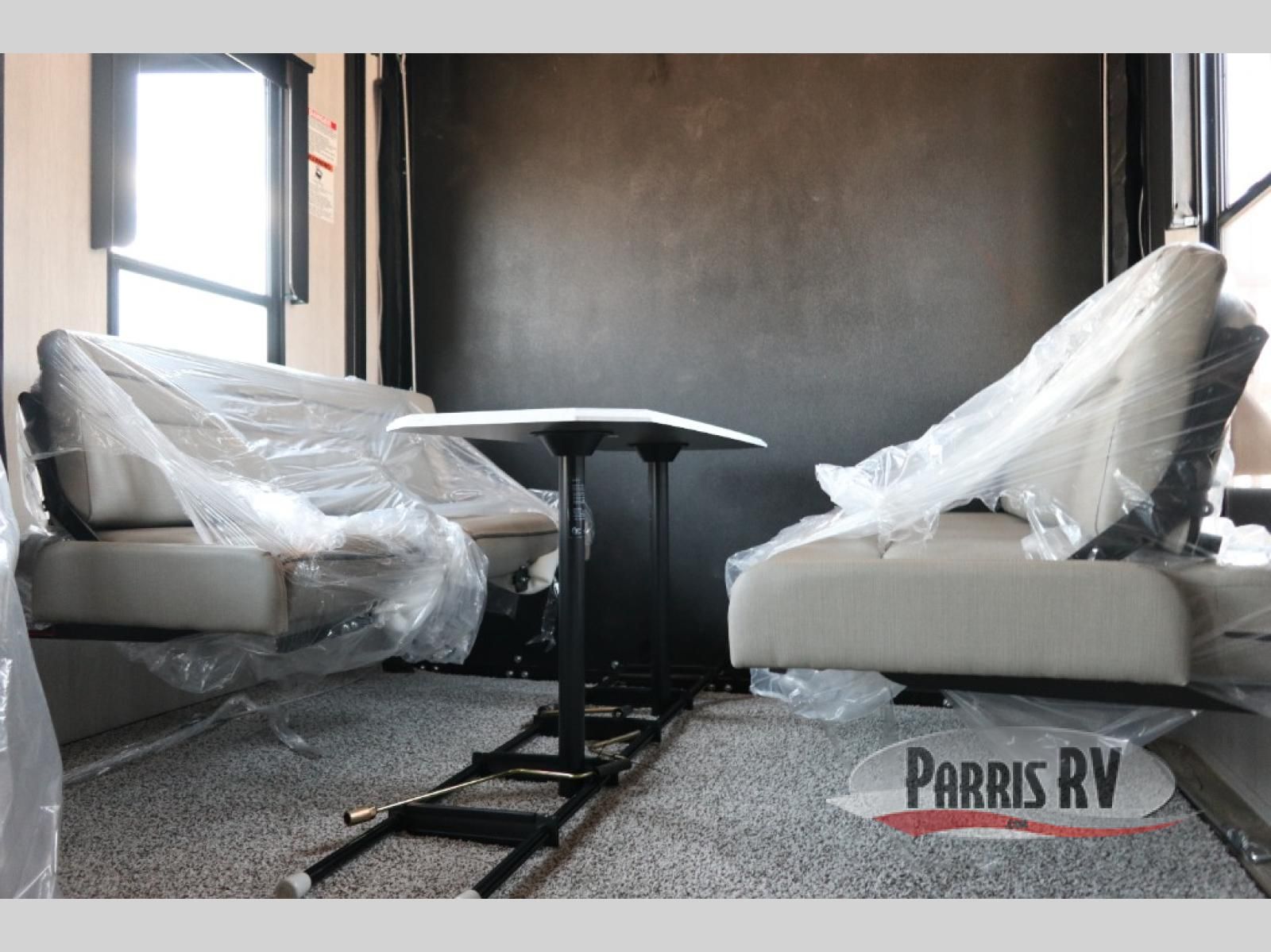 Stand out from the crowd with this Vortex toy hauler! You can enjoy a comfortable night of rest on your very own king-size bed in the front master suite. This space has a wardrobe slide for storing your sweaters, a nightstand to place your alarm clock on, and a countertop on the other side of the bed that you can place décor on. The kitchen is equipped with great tools, like the three-burner range that you can use to fry up some eggs and bacon, and you'll also be able to take a load off in the two lounge chairs.