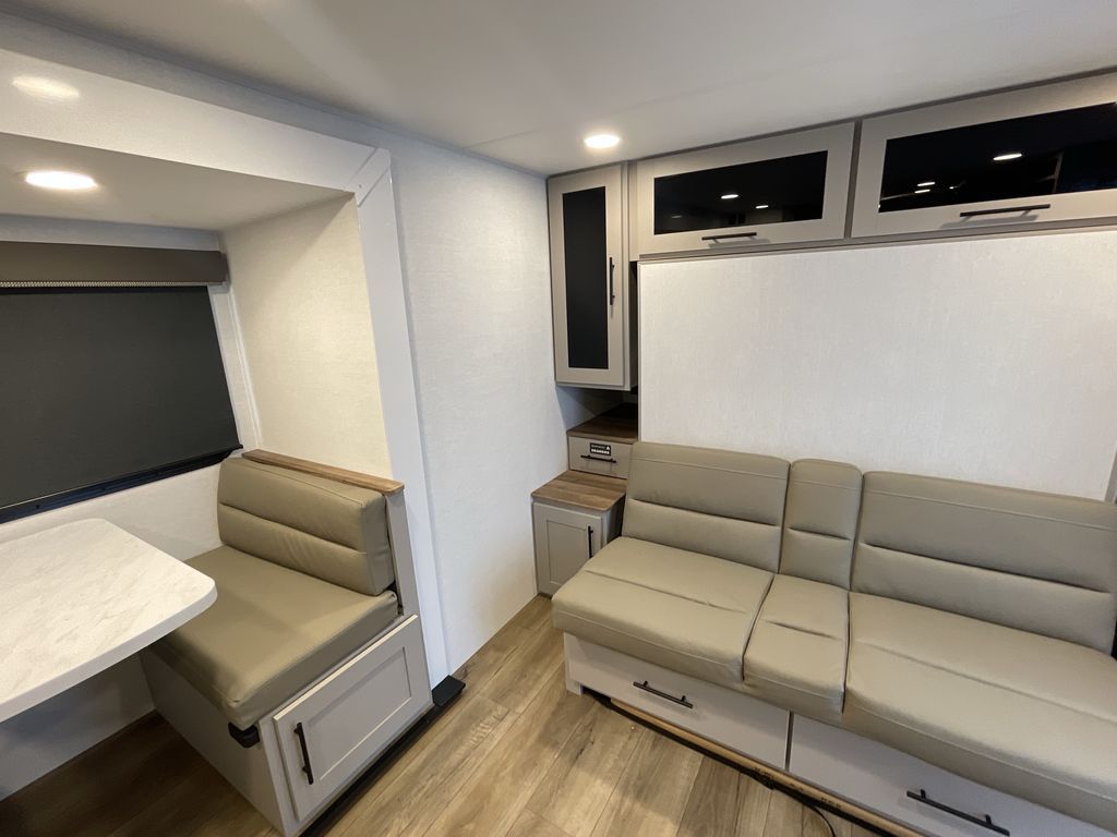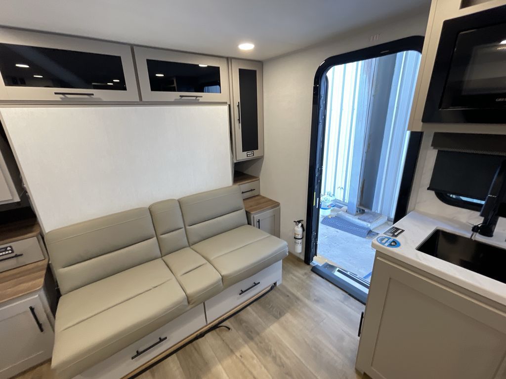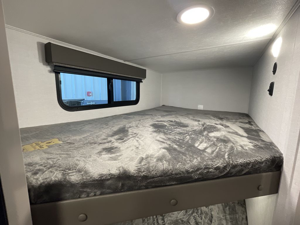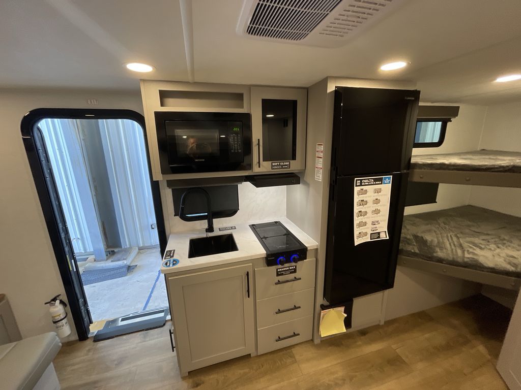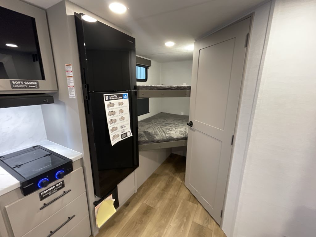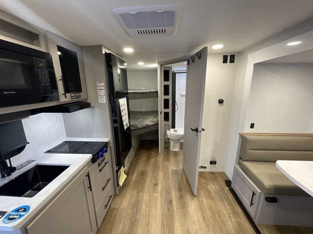 Step inside through the solid step entry and you'll be greeted by a cozy queen bed, perfect for a restful night’s sleep. In between wardrobe nightstands and topped with overhead storage, there’s plenty of room for your clothes and essentials. For added versatility, the bed converts into a 60" jack knife sofa, providing extra seating when needed. The slide out features a dinette that offers additional space, a comfy sleeping area, and a spot to enjoy meals. Across from the dinette, the kitchen is fully equipped with a 10-cu. ft. refrigerator, two-burner cooktop, sink, and microwave, everything you need to prepare your favorite dishes. At the rear corner, you’ll find even more sleeping space with dual 46" x 74" bunks, right next to a full bathroom complete with a 30" x 36" shower for added comfort and convenience.