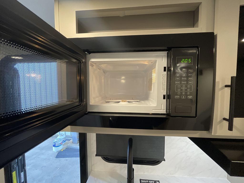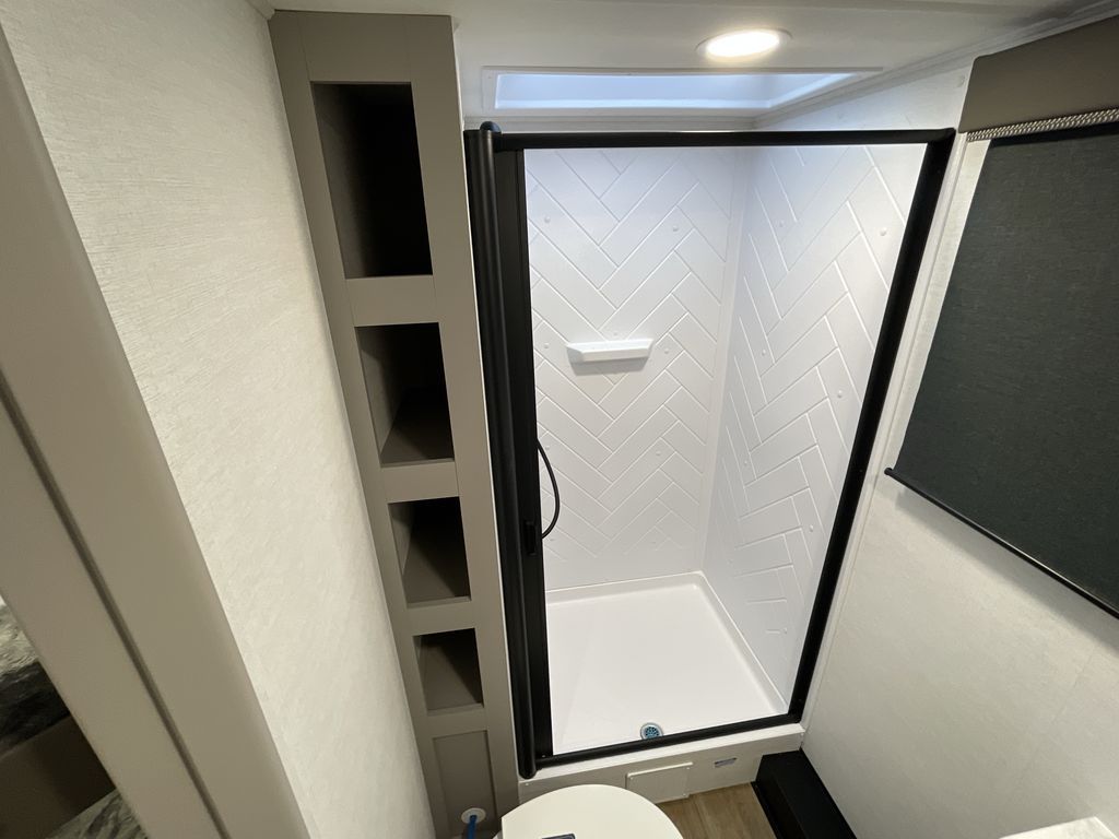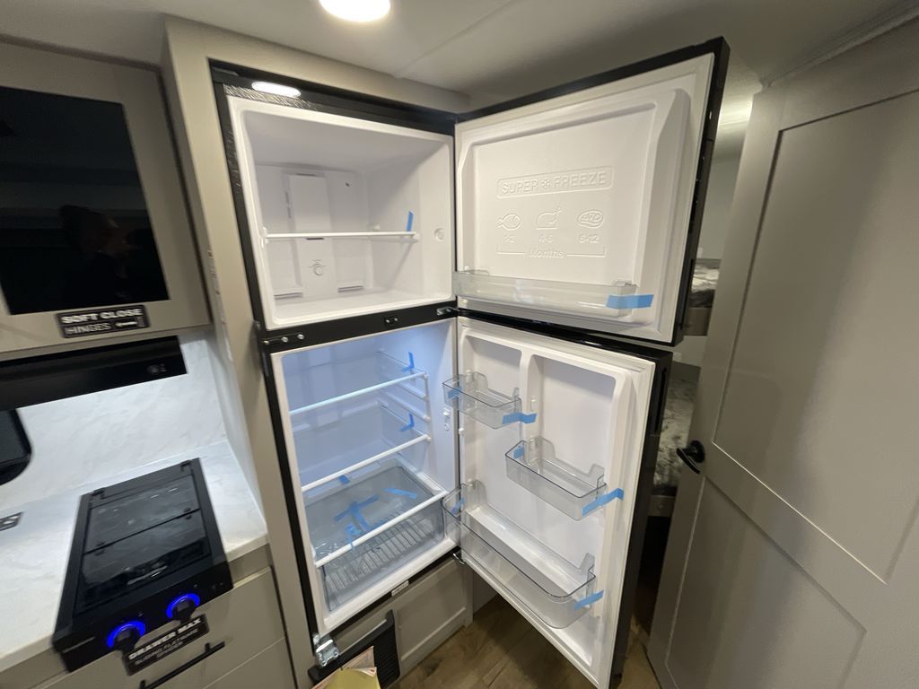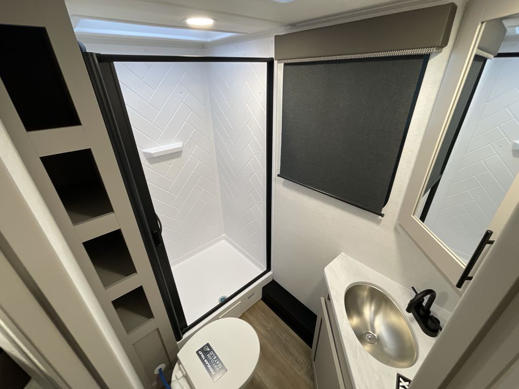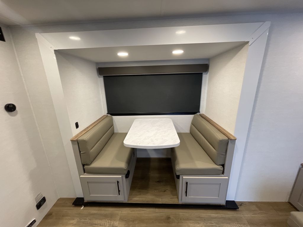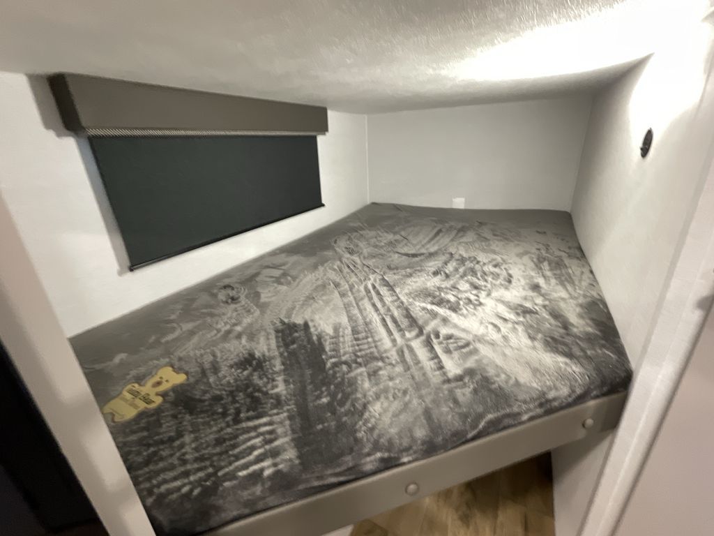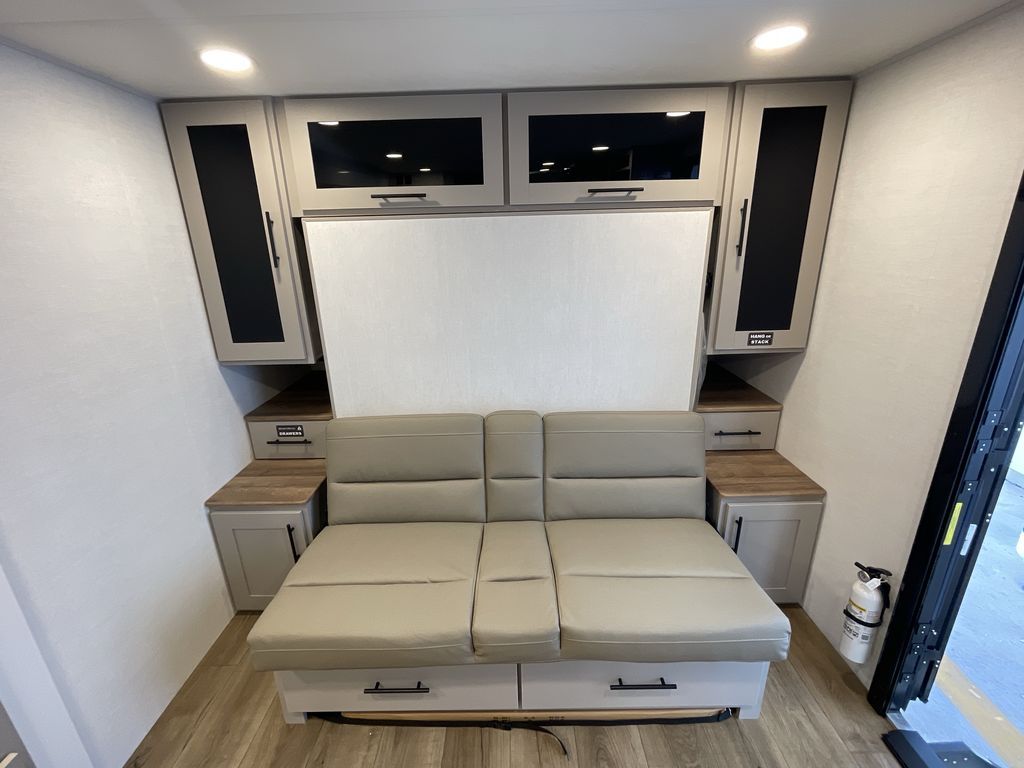 Step inside through the solid step entry and you'll be greeted by a cozy queen bed, perfect for a restful night’s sleep. In between wardrobe nightstands and topped with overhead storage, there’s plenty of room for your clothes and essentials. For added versatility, the bed converts into a 60" jack knife sofa, providing extra seating when needed. The slide out features a dinette that offers additional space, a comfy sleeping area, and a spot to enjoy meals. Across from the dinette, the kitchen is fully equipped with a 10-cu. ft. refrigerator, two-burner cooktop, sink, and microwave, everything you need to prepare your favorite dishes. At the rear corner, you’ll find even more sleeping space with dual 46" x 74" bunks, right next to a full bathroom complete with a 30" x 36" shower for added comfort and convenience.