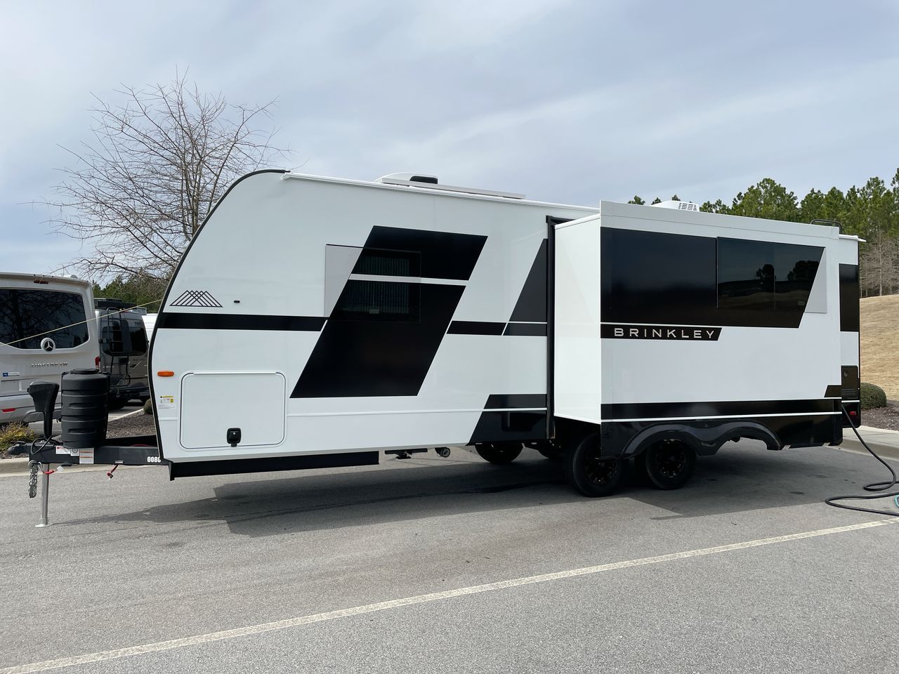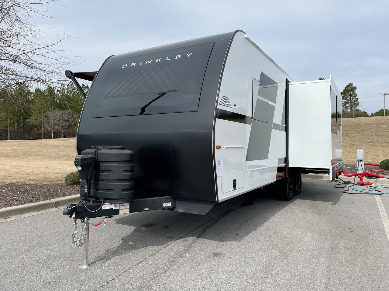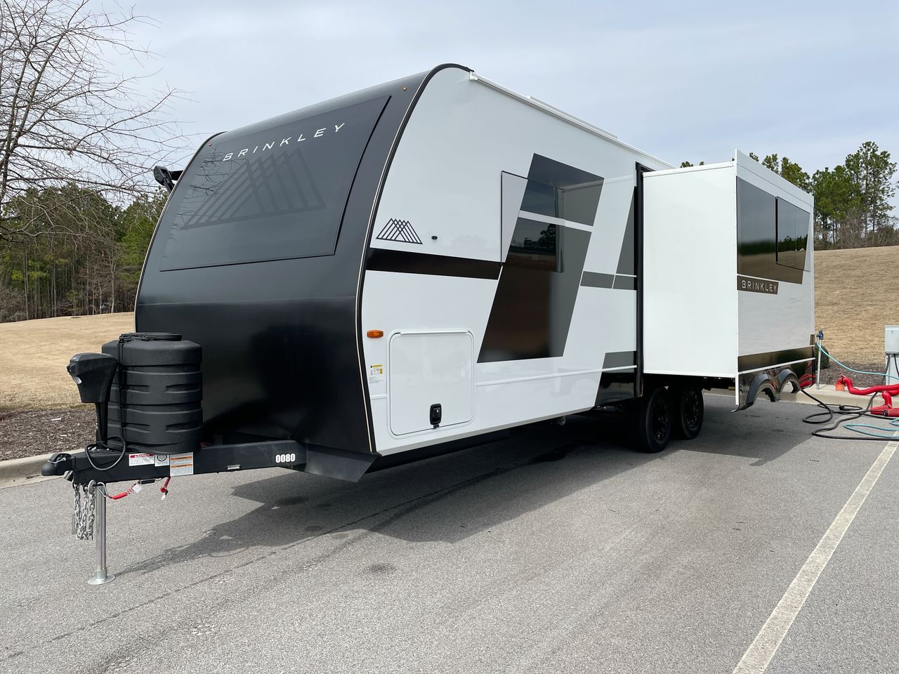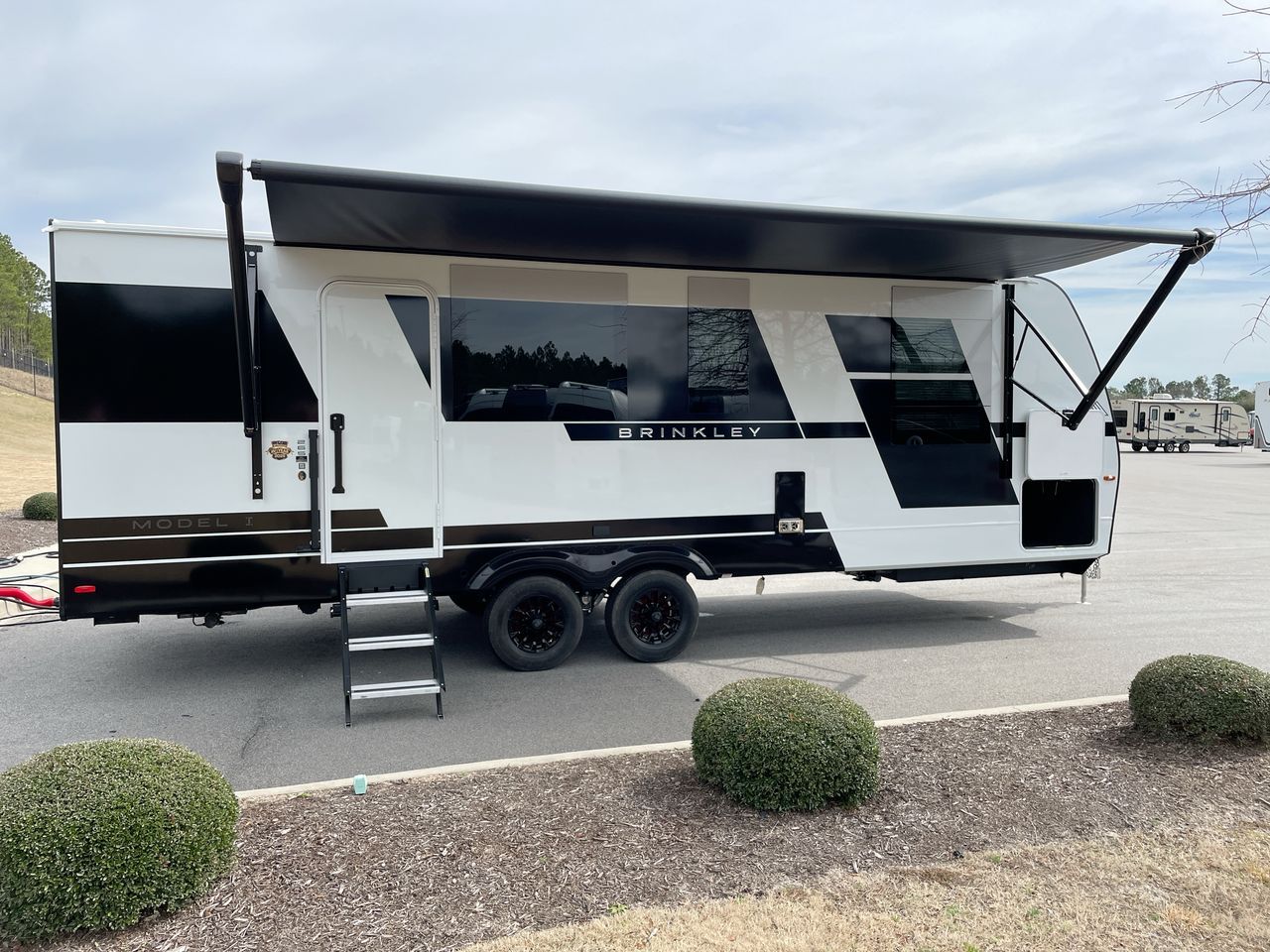Brinkley Model I travel trailer 265 highlights: Theater Seating Slide Pull-Out Dining Table King Bed LED Chassis Lighting Drop-Frame Pass-Thru Storage One look at this travel trailer and you'll be sold! The full rear bath features a spacious 42" x 30" shower with a built-in seat and Maxxair fan to name a few comforts. The front private bedroom features a 66" x 80" king bed with a MaxSpace Split-Level Wardrobe underneath to store shoes, clothes, and more! A slide out in the combined living area and kitchen makes your space more open, and you'll enjoy relaxing on the theater seating here in the evenings. The full kitchen includes a three burner stovetop, residential 30" convection microwave, 12 cu. ft. 12V refrigerator, plus a trash bin and Stow N' Go paper towel holder for added convenience. You can choose to eat outdoors under the 18' electric awning with LED lights or stay inside to dine at the pull-out dining table with a drawer for added storage! And if you're needing more sleeping space, just choose the optional tri-fold sofa in place of the theater seating! The lightweight Model I travel trailer by Brinkley is the perfect choice for those looking for an easy tow and at-home comforts! There is a drop-frame chassis, high-performance Road Armor suspension equalizer system, and Demco EZ Latch trailer coupler that automatically latches when dropped onto a hitch ball without the need of a safety pin. Additional exterior features include square Euro frameless windows, automotive-grade paint, full-width LED strip lighting in the pass-thru, and a pet & property security campside tie-down to keep your gear and furry friends safe. Inside, you'll be wowed by Brinkley's CraftSense wood trim construction, residential solid surface kitchen countertops, dimmable bedroom lights, and marine-grade neon LED shower lighting to name a few stand-out features!