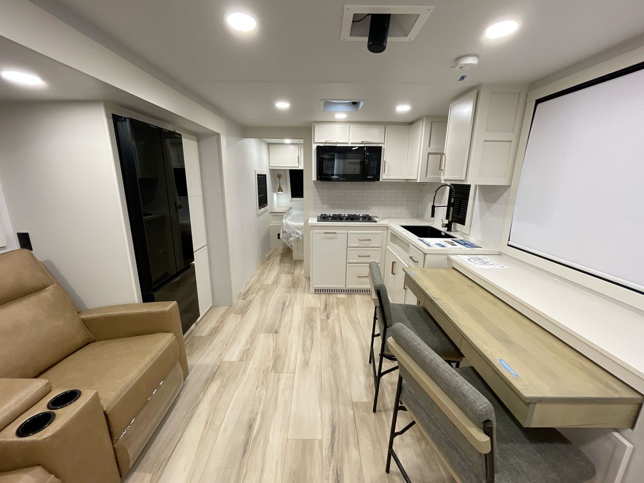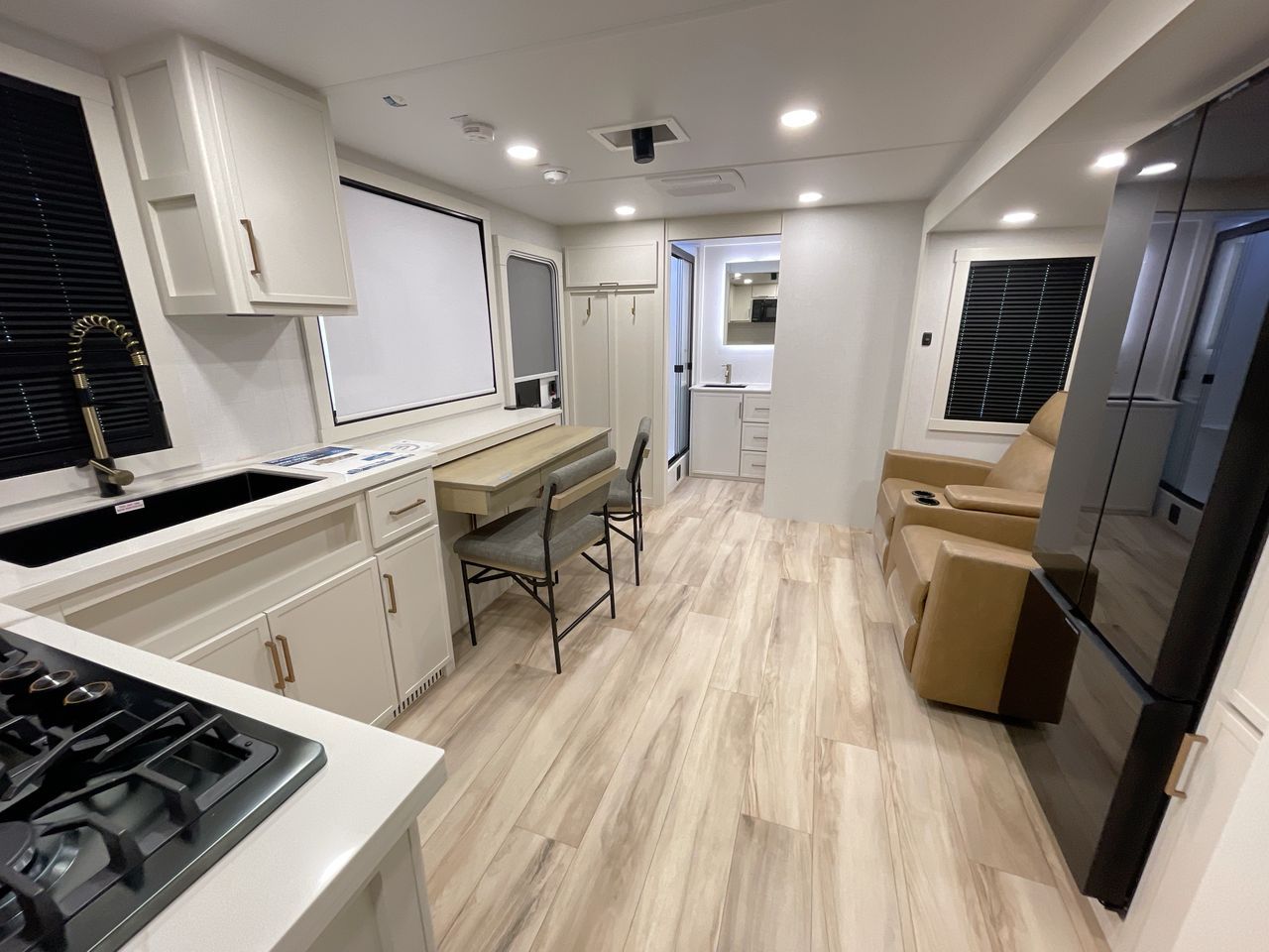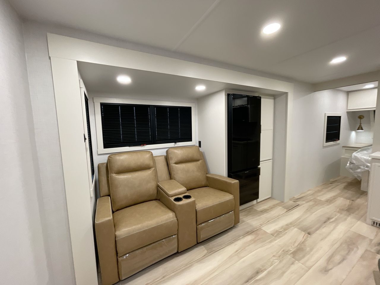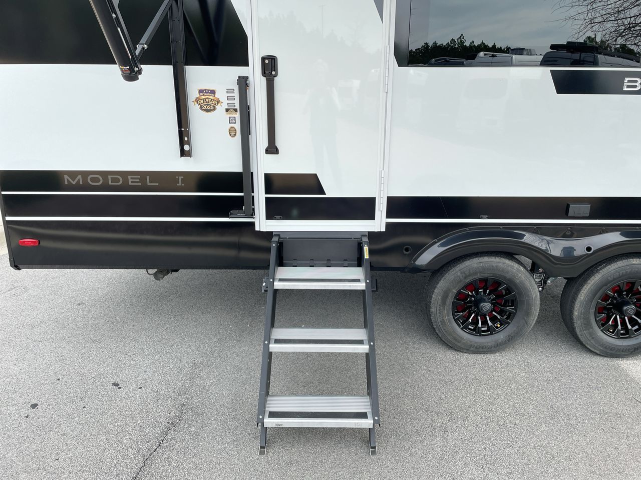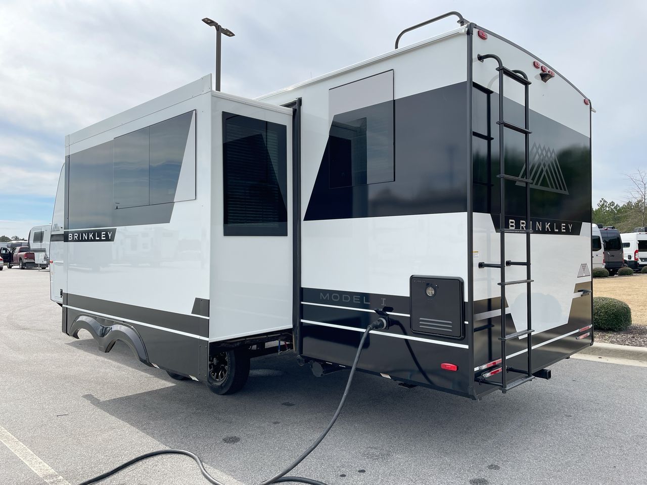 Brinkley Model I travel trailer 265 highlights: Theater Seating Slide Pull-Out Dining Table King Bed LED Chassis Lighting Drop-Frame Pass-Thru Storage One look at this travel trailer and you'll be sold! The full rear bath features a spacious 42" x 30" shower with a built-in seat and Maxxair fan to name a few comforts. The front private bedroom features a 66" x 80" king bed with a MaxSpace Split-Level Wardrobe underneath to store shoes, clothes, and more! A slide out in the combined living area and kitchen makes your space more open, and you'll enjoy relaxing on the theater seating here in the evenings. The full kitchen includes a three burner stovetop, residential 30" convection microwave, 12 cu. ft. 12V refrigerator, plus a trash bin and Stow N' Go paper towel holder for added convenience. You can choose to eat outdoors under the 18' electric awning with LED lights or stay inside to dine at the pull-out dining table with a drawer for added storage! And if you're needing more sleeping space, just choose the optional tri-fold sofa in place of the theater seating! The lightweight Model I travel trailer by Brinkley is the perfect choice for those looking for an easy tow and at-home comforts! There is a drop-frame chassis, high-performance Road Armor suspension equalizer system, and Demco EZ Latch trailer coupler that automatically latches when dropped onto a hitch ball without the need of a safety pin. Additional exterior features include square Euro frameless windows, automotive-grade paint, full-width LED strip lighting in the pass-thru, and a pet & property security campside tie-down to keep your gear and furry friends safe. Inside, you'll be wowed by Brinkley's CraftSense wood trim construction, residential solid surface kitchen countertops, dimmable bedroom lights, and marine-grade neon LED shower lighting to name a few stand-out features!