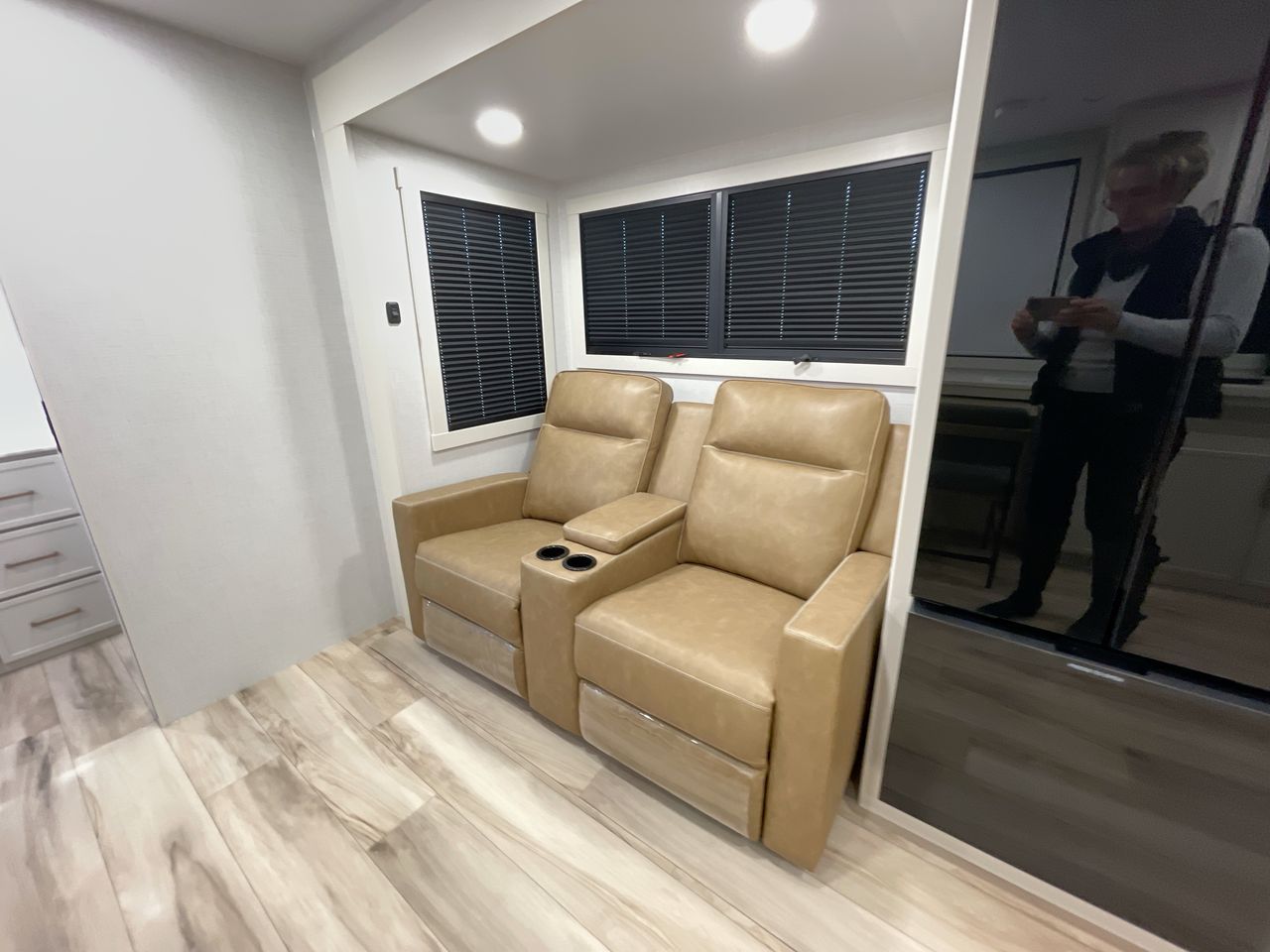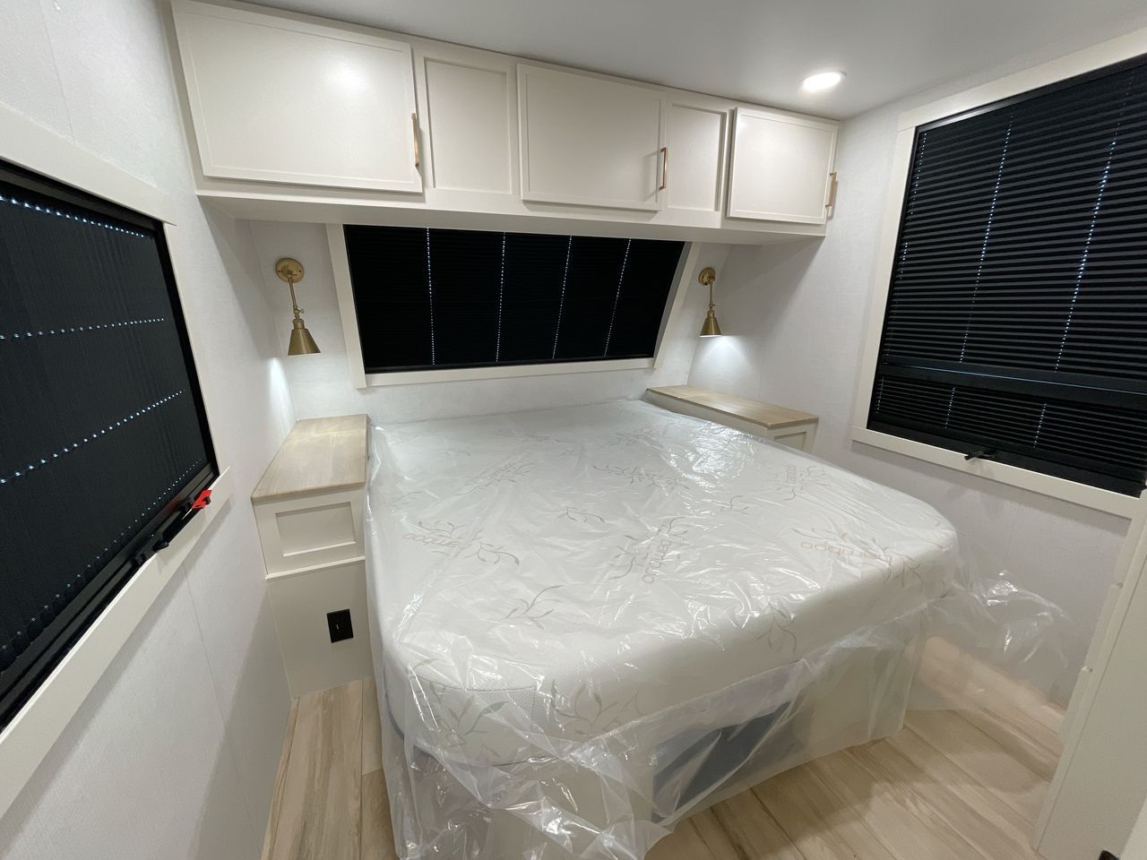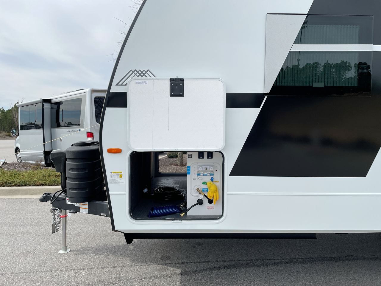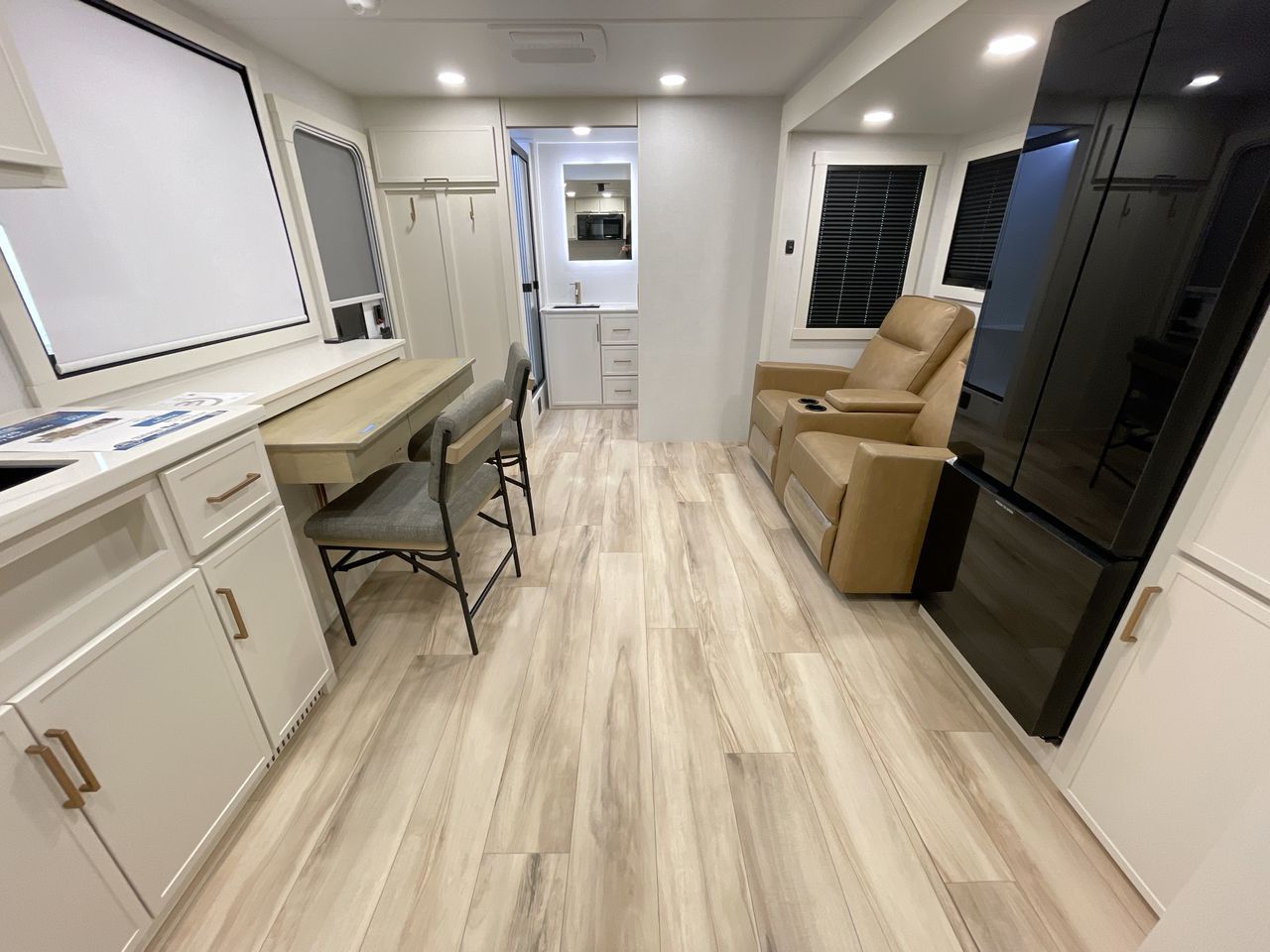 Brinkley Model I travel trailer 265 highlights: Theater Seating Slide Pull-Out Dining Table King Bed LED Chassis Lighting Drop-Frame Pass-Thru Storage One look at this travel trailer and you'll be sold! The full rear bath features a spacious 42" x 30" shower with a built-in seat and Maxxair fan to name a few comforts. The front private bedroom features a 66" x 80" king bed with a MaxSpace Split-Level Wardrobe underneath to store shoes, clothes, and more! A slide out in the combined living area and kitchen makes your space more open, and you'll enjoy relaxing on the theater seating here in the evenings. The full kitchen includes a three burner stovetop, residential 30" convection microwave, 12 cu. ft. 12V refrigerator, plus a trash bin and Stow N' Go paper towel holder for added convenience. You can choose to eat outdoors under the 18' electric awning with LED lights or stay inside to dine at the pull-out dining table with a drawer for added storage! And if you're needing more sleeping space, just choose the optional tri-fold sofa in place of the theater seating! The lightweight Model I travel trailer by Brinkley is the perfect choice for those looking for an easy tow and at-home comforts! There is a drop-frame chassis, high-performance Road Armor suspension equalizer system, and Demco EZ Latch trailer coupler that automatically latches when dropped onto a hitch ball without the need of a safety pin. Additional exterior features include square Euro frameless windows, automotive-grade paint, full-width LED strip lighting in the pass-thru, and a pet & property security campside tie-down to keep your gear and furry friends safe. Inside, you'll be wowed by Brinkley's CraftSense wood trim construction, residential solid surface kitchen countertops, dimmable bedroom lights, and marine-grade neon LED shower lighting to name a few stand-out features!
