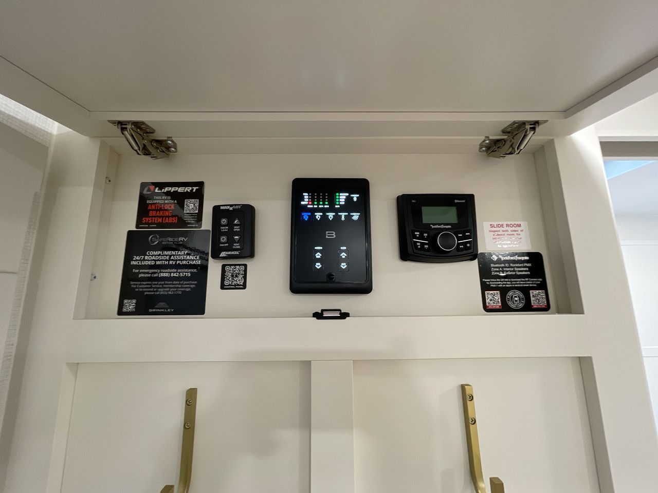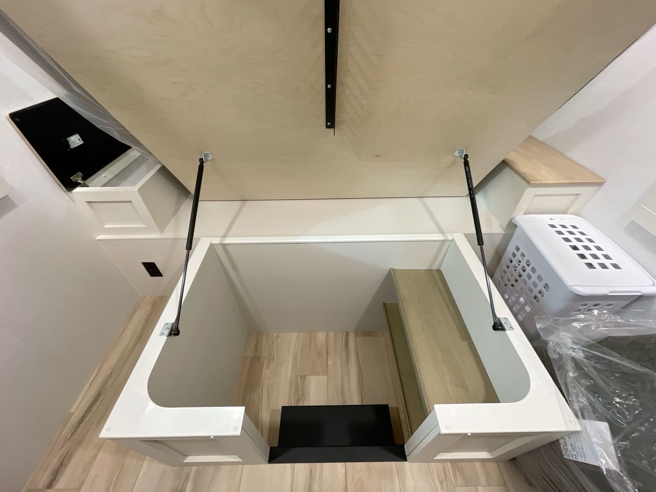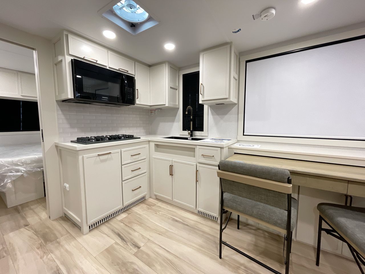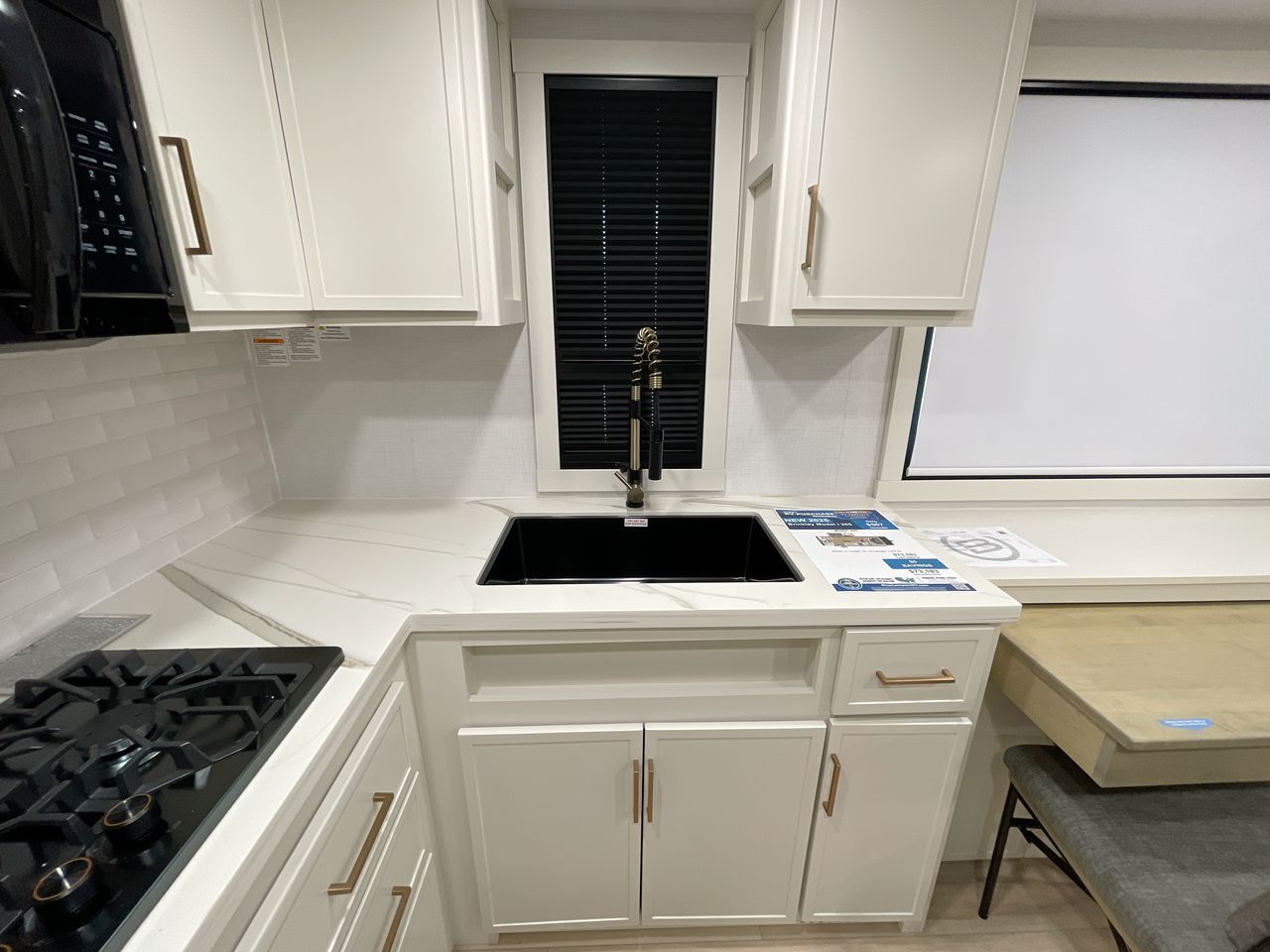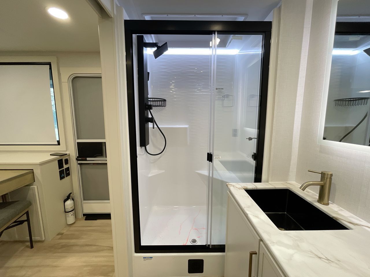 Brinkley Model I travel trailer 265 highlights: Theater Seating Slide Pull-Out Dining Table King Bed LED Chassis Lighting Drop-Frame Pass-Thru Storage One look at this travel trailer and you'll be sold! The full rear bath features a spacious 42" x 30" shower with a built-in seat and Maxxair fan to name a few comforts. The front private bedroom features a 66" x 80" king bed with a MaxSpace Split-Level Wardrobe underneath to store shoes, clothes, and more! A slide out in the combined living area and kitchen makes your space more open, and you'll enjoy relaxing on the theater seating here in the evenings. The full kitchen includes a three burner stovetop, residential 30" convection microwave, 12 cu. ft. 12V refrigerator, plus a trash bin and Stow N' Go paper towel holder for added convenience. You can choose to eat outdoors under the 18' electric awning with LED lights or stay inside to dine at the pull-out dining table with a drawer for added storage! And if you're needing more sleeping space, just choose the optional tri-fold sofa in place of the theater seating! The lightweight Model I travel trailer by Brinkley is the perfect choice for those looking for an easy tow and at-home comforts! There is a drop-frame chassis, high-performance Road Armor suspension equalizer system, and Demco EZ Latch trailer coupler that automatically latches when dropped onto a hitch ball without the need of a safety pin. Additional exterior features include square Euro frameless windows, automotive-grade paint, full-width LED strip lighting in the pass-thru, and a pet & property security campside tie-down to keep your gear and furry friends safe. Inside, you'll be wowed by Brinkley's CraftSense wood trim construction, residential solid surface kitchen countertops, dimmable bedroom lights, and marine-grade neon LED shower lighting to name a few stand-out features!