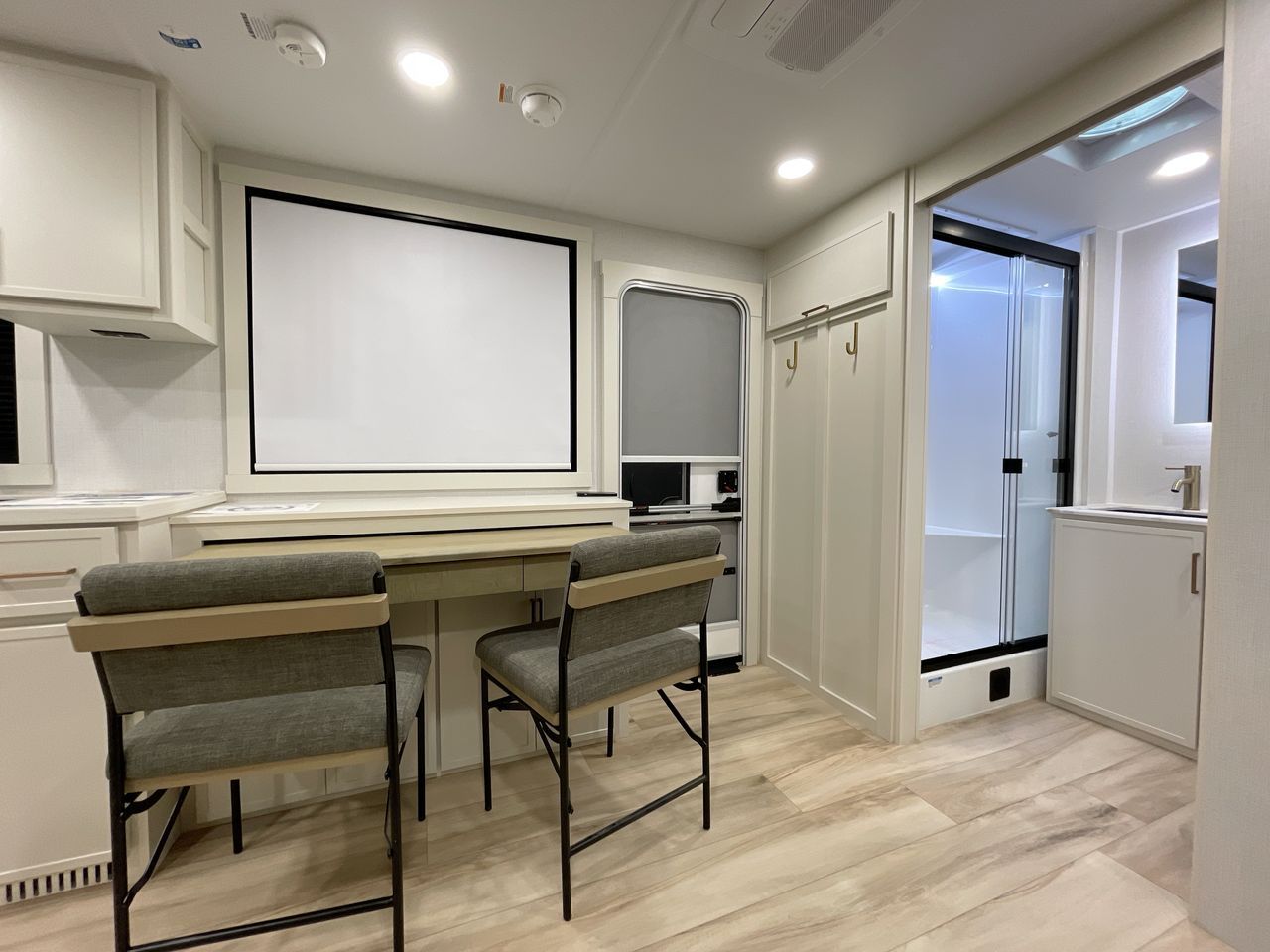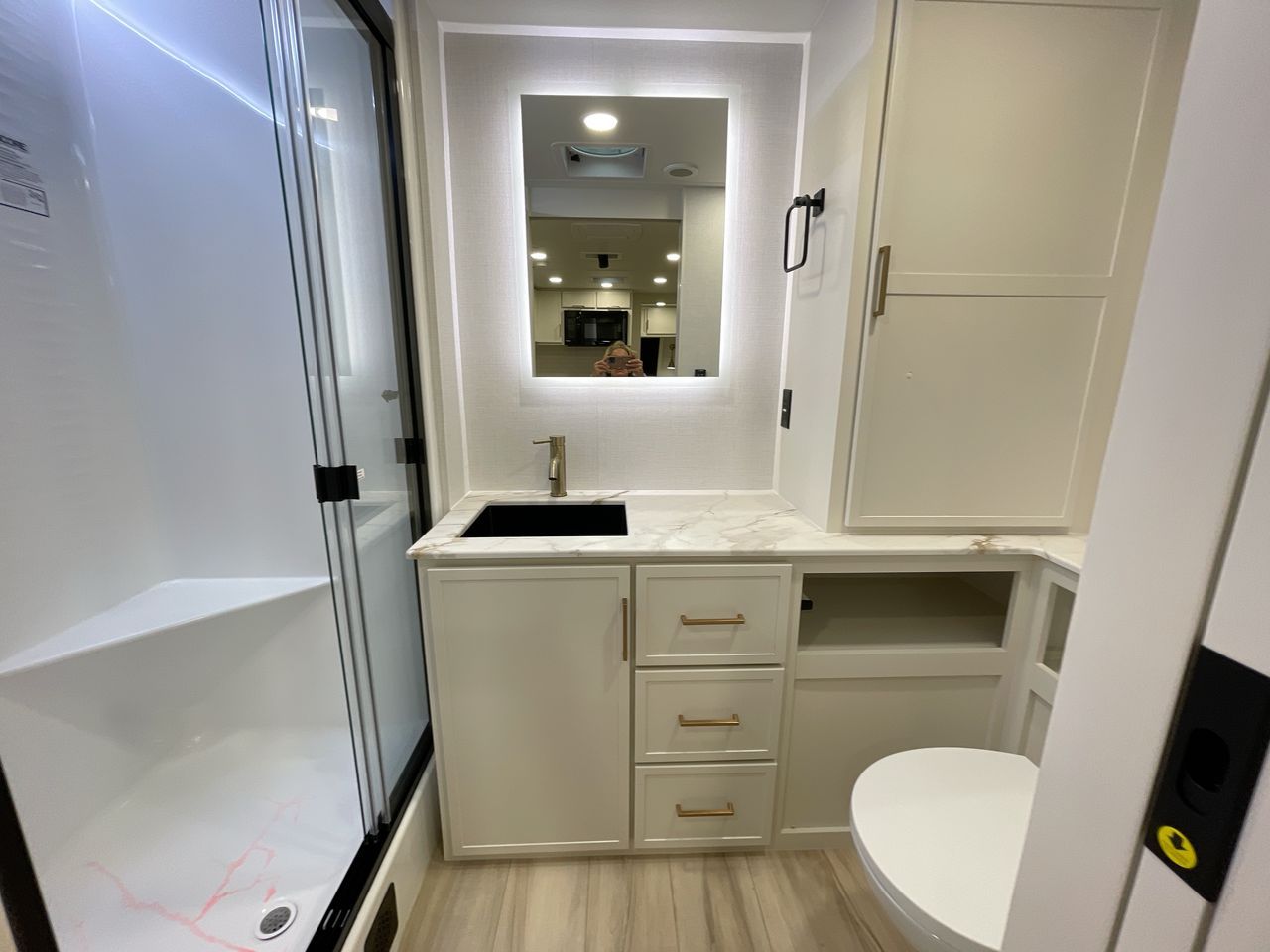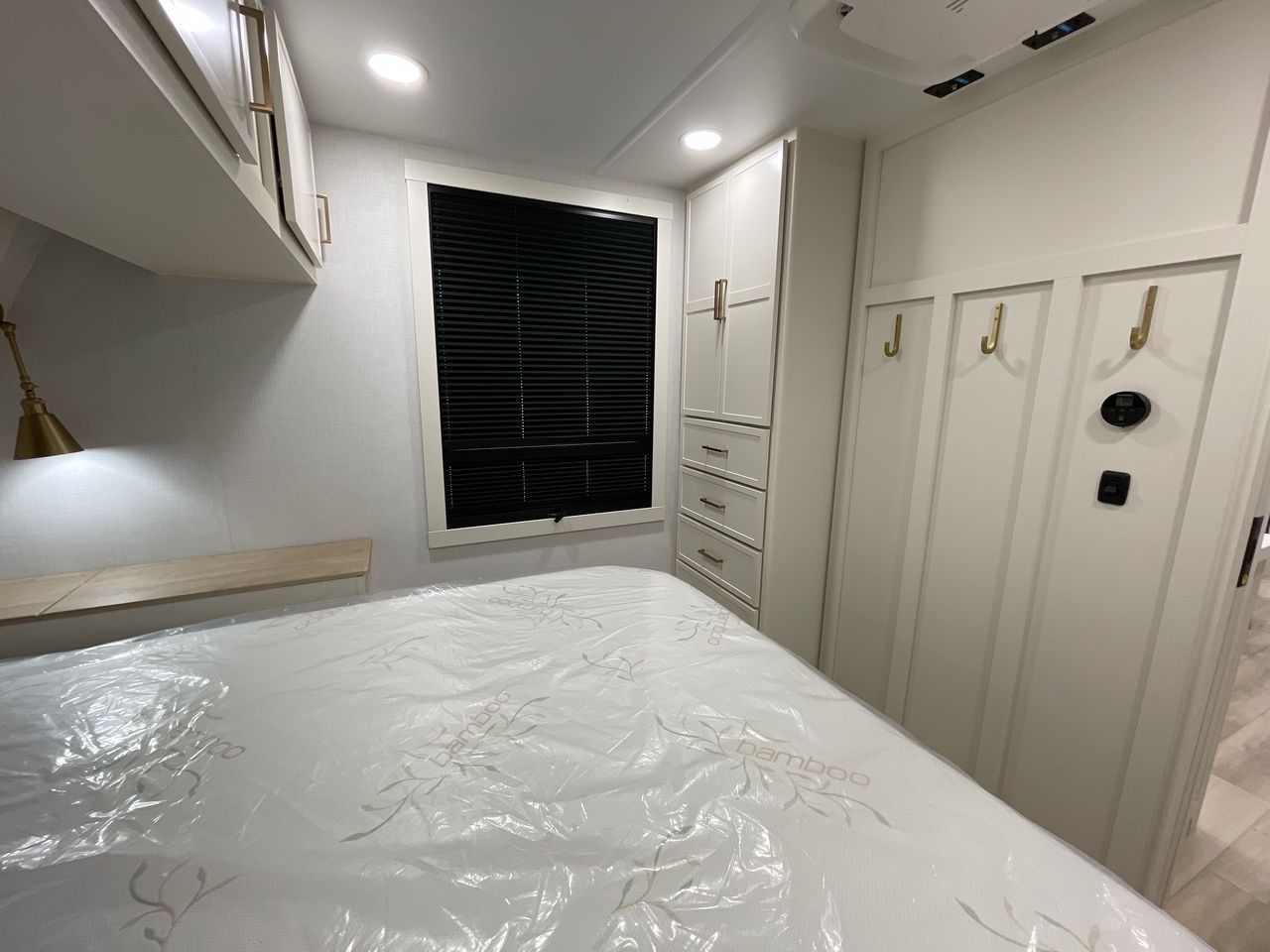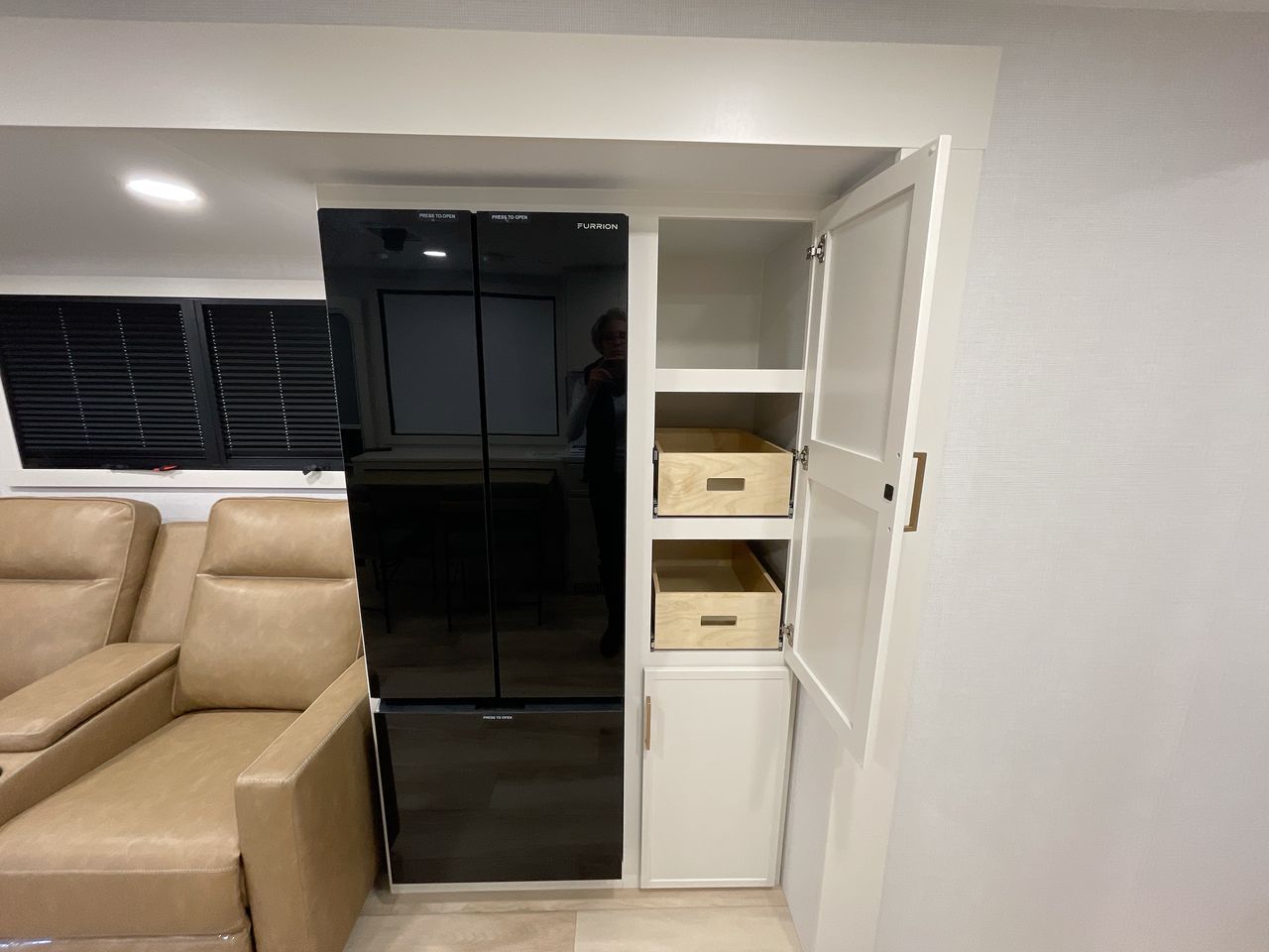 Brinkley Model I travel trailer 265 highlights: Theater Seating Slide Pull-Out Dining Table King Bed LED Chassis Lighting Drop-Frame Pass-Thru Storage One look at this travel trailer and you'll be sold! The full rear bath features a spacious 42" x 30" shower with a built-in seat and Maxxair fan to name a few comforts. The front private bedroom features a 66" x 80" king bed with a MaxSpace Split-Level Wardrobe underneath to store shoes, clothes, and more! A slide out in the combined living area and kitchen makes your space more open, and you'll enjoy relaxing on the theater seating here in the evenings. The full kitchen includes a three burner stovetop, residential 30" convection microwave, 12 cu. ft. 12V refrigerator, plus a trash bin and Stow N' Go paper towel holder for added convenience. You can choose to eat outdoors under the 18' electric awning with LED lights or stay inside to dine at the pull-out dining table with a drawer for added storage! And if you're needing more sleeping space, just choose the optional tri-fold sofa in place of the theater seating! The lightweight Model I travel trailer by Brinkley is the perfect choice for those looking for an easy tow and at-home comforts! There is a drop-frame chassis, high-performance Road Armor suspension equalizer system, and Demco EZ Latch trailer coupler that automatically latches when dropped onto a hitch ball without the need of a safety pin. Additional exterior features include square Euro frameless windows, automotive-grade paint, full-width LED strip lighting in the pass-thru, and a pet & property security campside tie-down to keep your gear and furry friends safe. Inside, you'll be wowed by Brinkley's CraftSense wood trim construction, residential solid surface kitchen countertops, dimmable bedroom lights, and marine-grade neon LED shower lighting to name a few stand-out features!