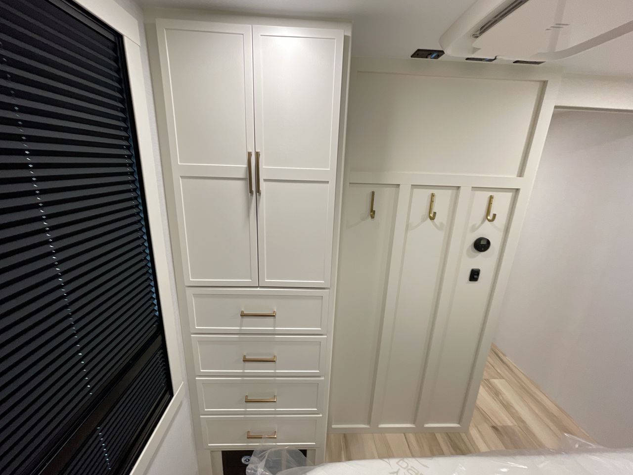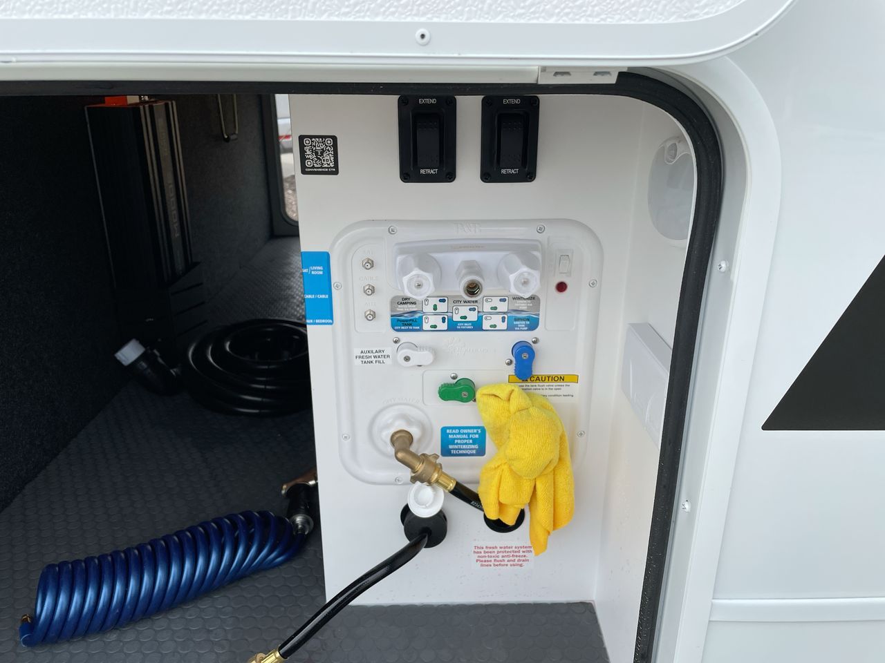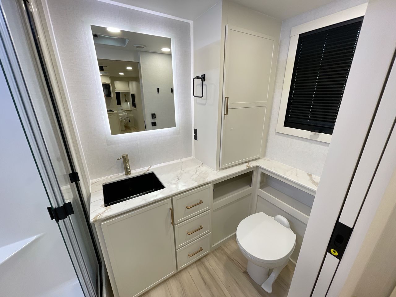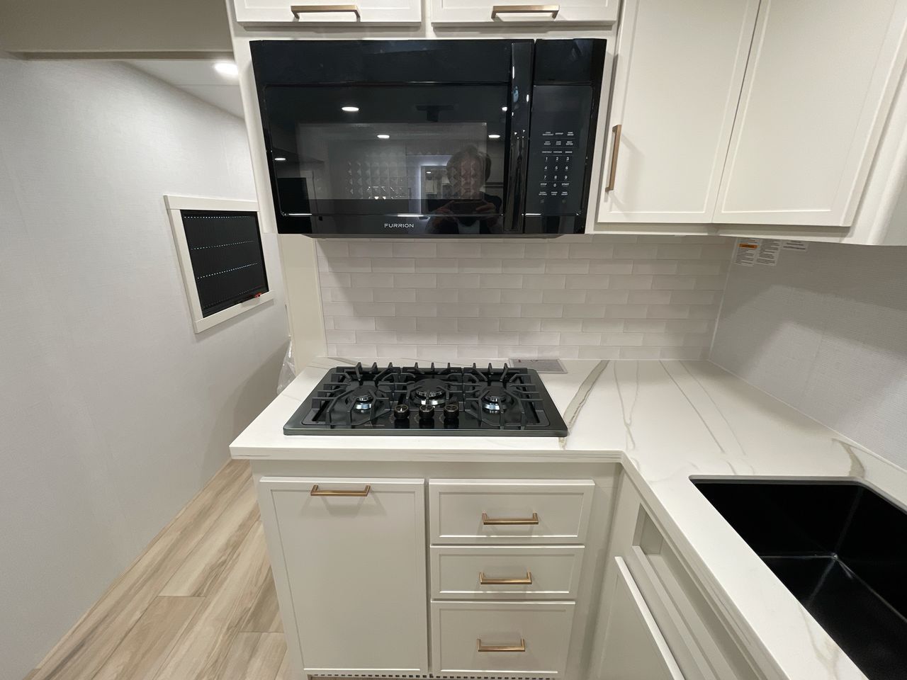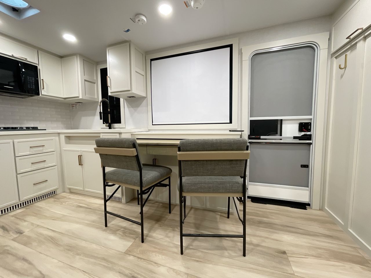 Brinkley Model I travel trailer 265 highlights: Theater Seating Slide Pull-Out Dining Table King Bed LED Chassis Lighting Drop-Frame Pass-Thru Storage One look at this travel trailer and you'll be sold! The full rear bath features a spacious 42" x 30" shower with a built-in seat and Maxxair fan to name a few comforts. The front private bedroom features a 66" x 80" king bed with a MaxSpace Split-Level Wardrobe underneath to store shoes, clothes, and more! A slide out in the combined living area and kitchen makes your space more open, and you'll enjoy relaxing on the theater seating here in the evenings. The full kitchen includes a three burner stovetop, residential 30" convection microwave, 12 cu. ft. 12V refrigerator, plus a trash bin and Stow N' Go paper towel holder for added convenience. You can choose to eat outdoors under the 18' electric awning with LED lights or stay inside to dine at the pull-out dining table with a drawer for added storage! And if you're needing more sleeping space, just choose the optional tri-fold sofa in place of the theater seating! The lightweight Model I travel trailer by Brinkley is the perfect choice for those looking for an easy tow and at-home comforts! There is a drop-frame chassis, high-performance Road Armor suspension equalizer system, and Demco EZ Latch trailer coupler that automatically latches when dropped onto a hitch ball without the need of a safety pin. Additional exterior features include square Euro frameless windows, automotive-grade paint, full-width LED strip lighting in the pass-thru, and a pet & property security campside tie-down to keep your gear and furry friends safe. Inside, you'll be wowed by Brinkley's CraftSense wood trim construction, residential solid surface kitchen countertops, dimmable bedroom lights, and marine-grade neon LED shower lighting to name a few stand-out features!