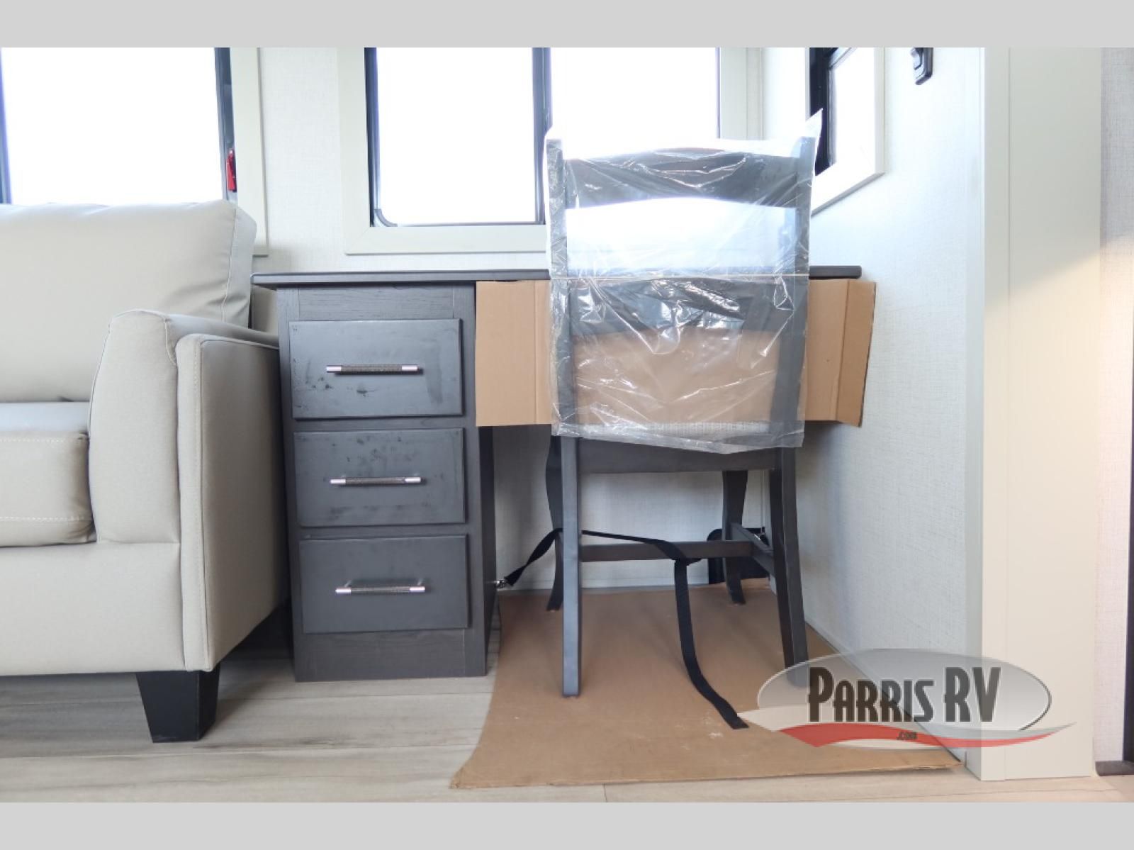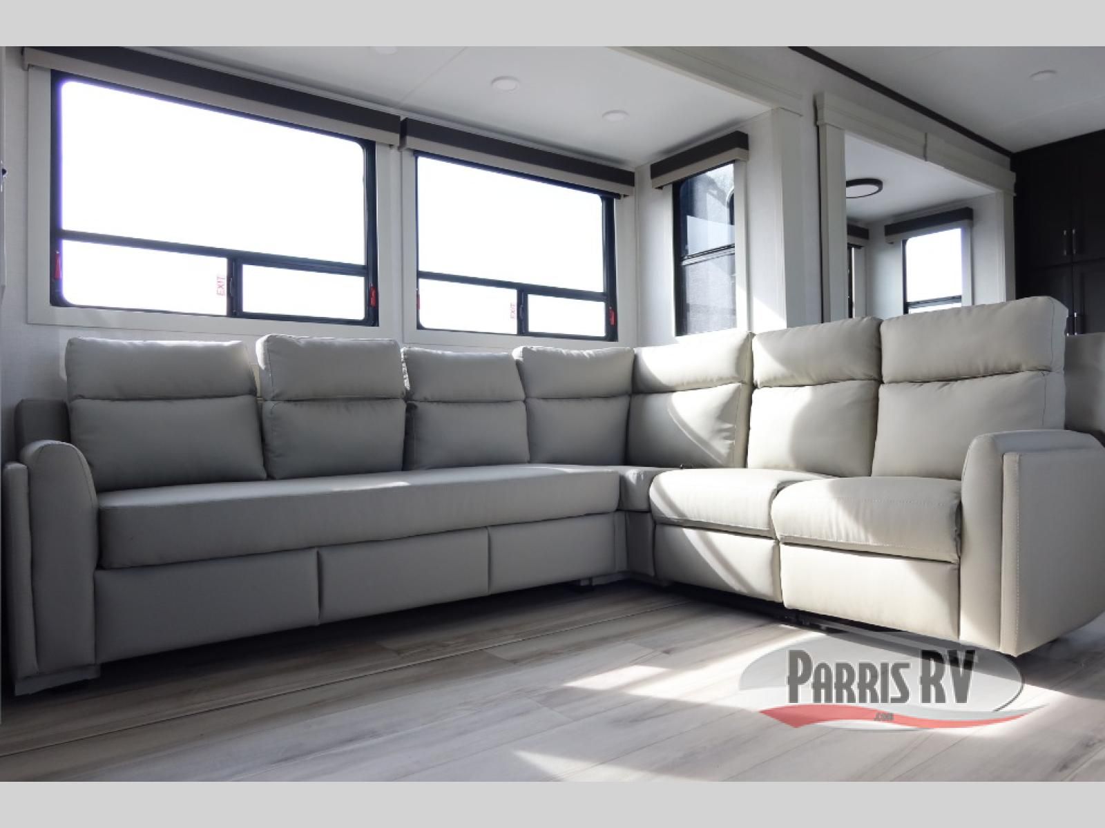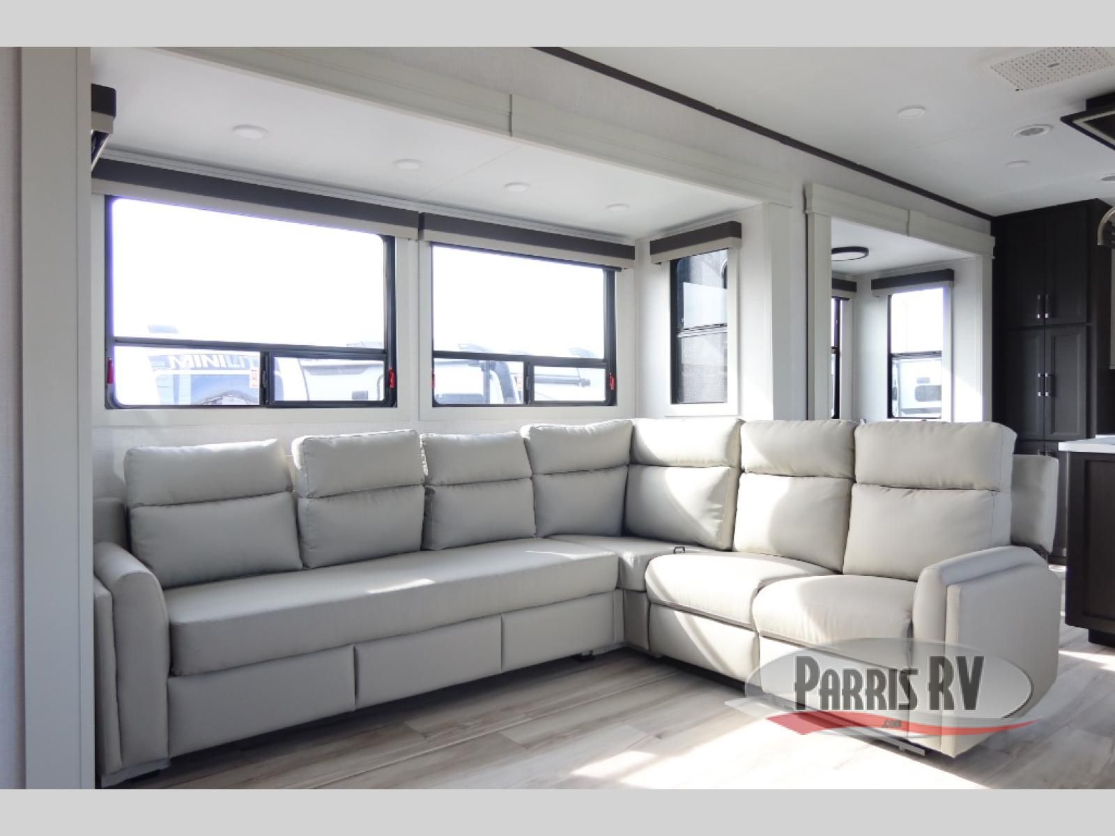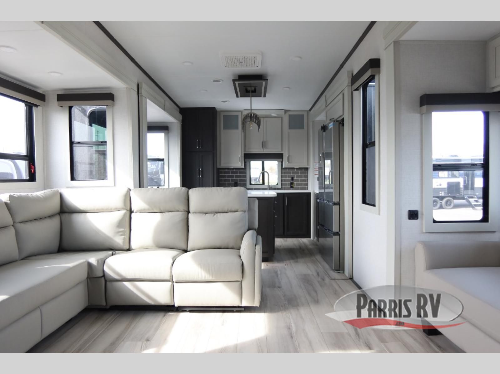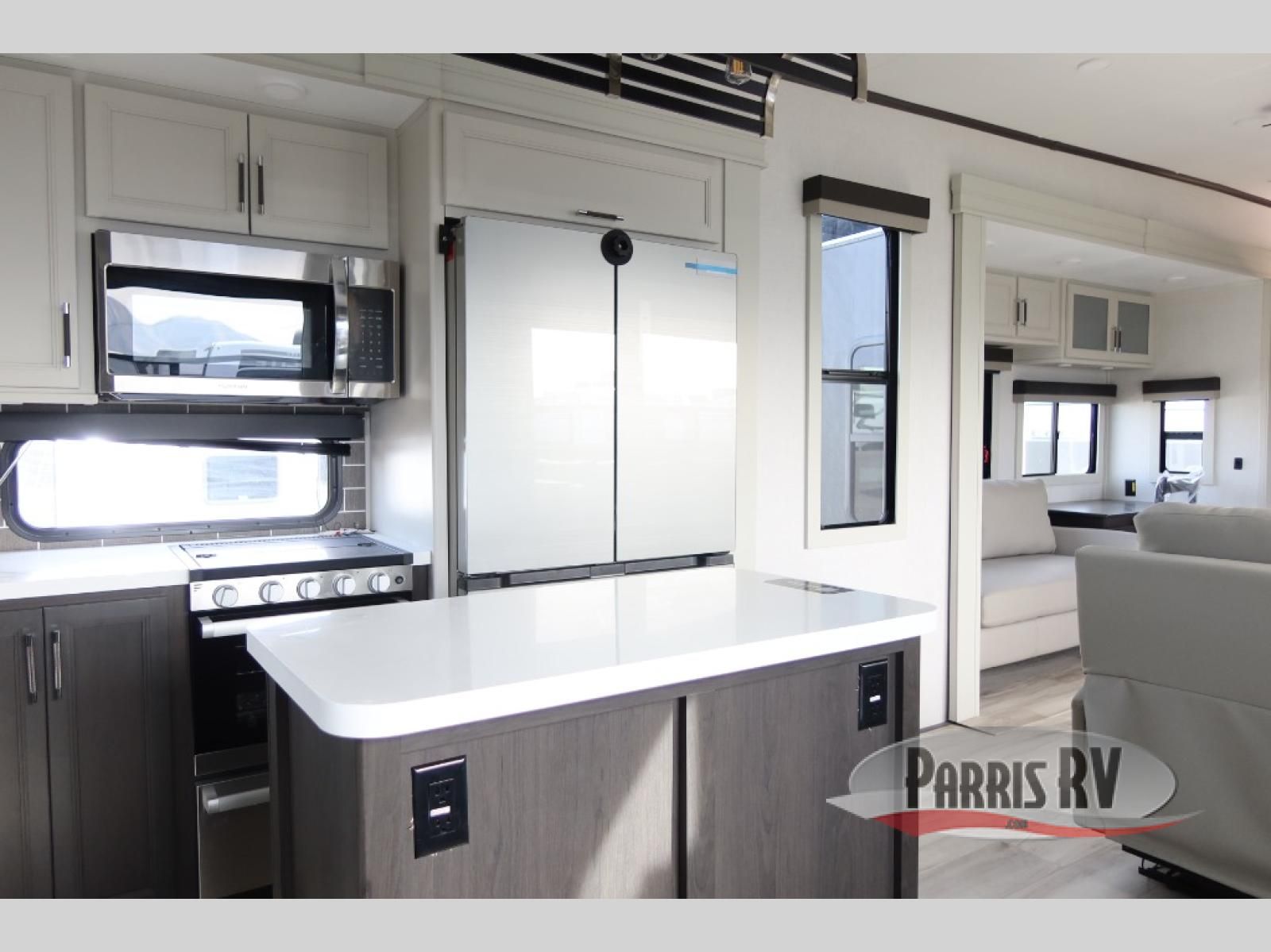 This rear kitchen fifth wheel makes extended stays or weekend trips to the lake enjoyable! The chef of your group will find plenty of counter space with the included kitchen island, plus there is a pantry and 18 cu. ft. residential refrigerator for food storage. A free-standing dinette provides a place to dine together, and the largest L-shaped sofa with recliners will be the perfect spot to relax with a movie. If you have guests, they could sleep here or on the hide-a-bed sofa sleeper. The dual entry bath includes a shower with a seat for added comfort, and the front master bedroom will feel just like home with its king bed slide out and master closet. There is also a dresser and stackable washer and dryer prep if you want to add those appliances!