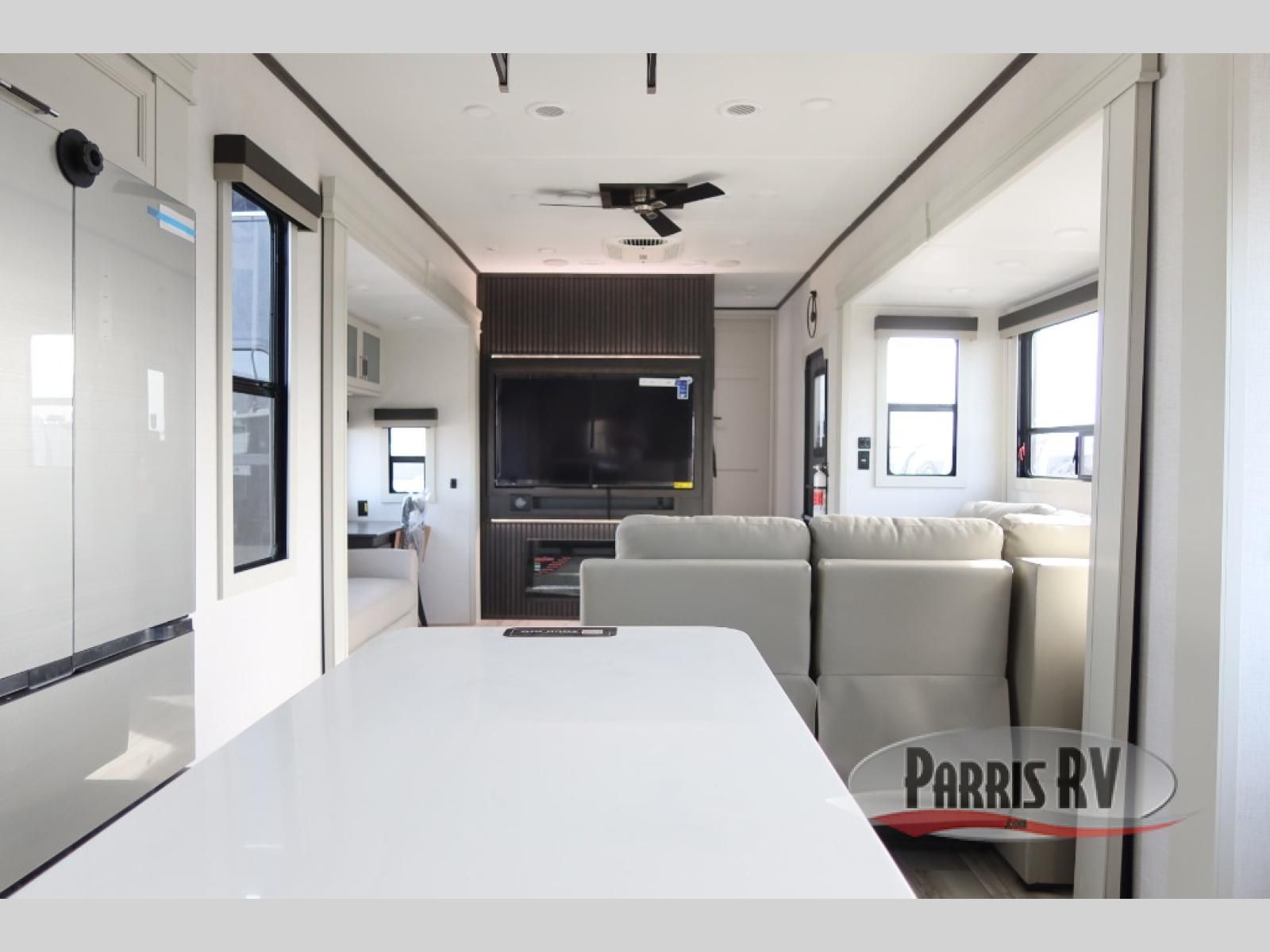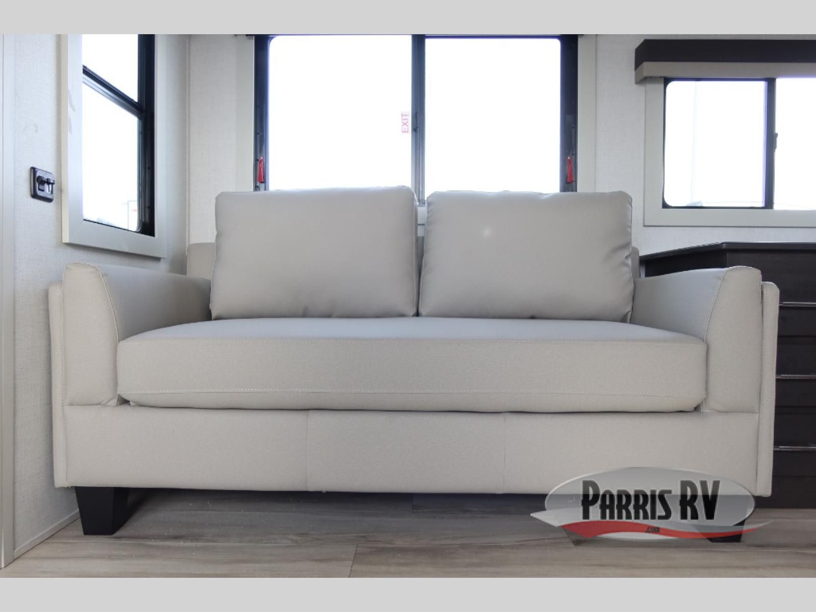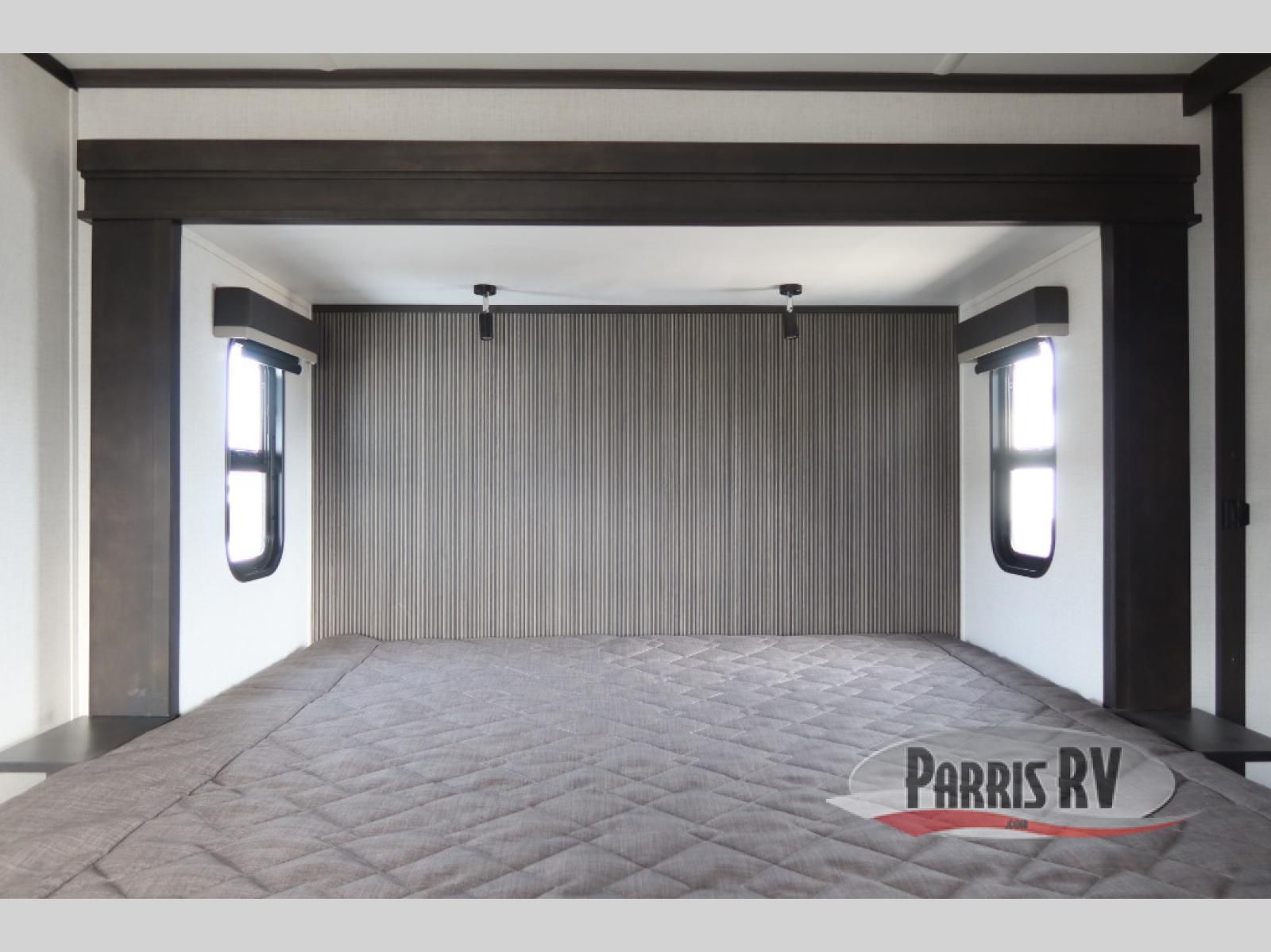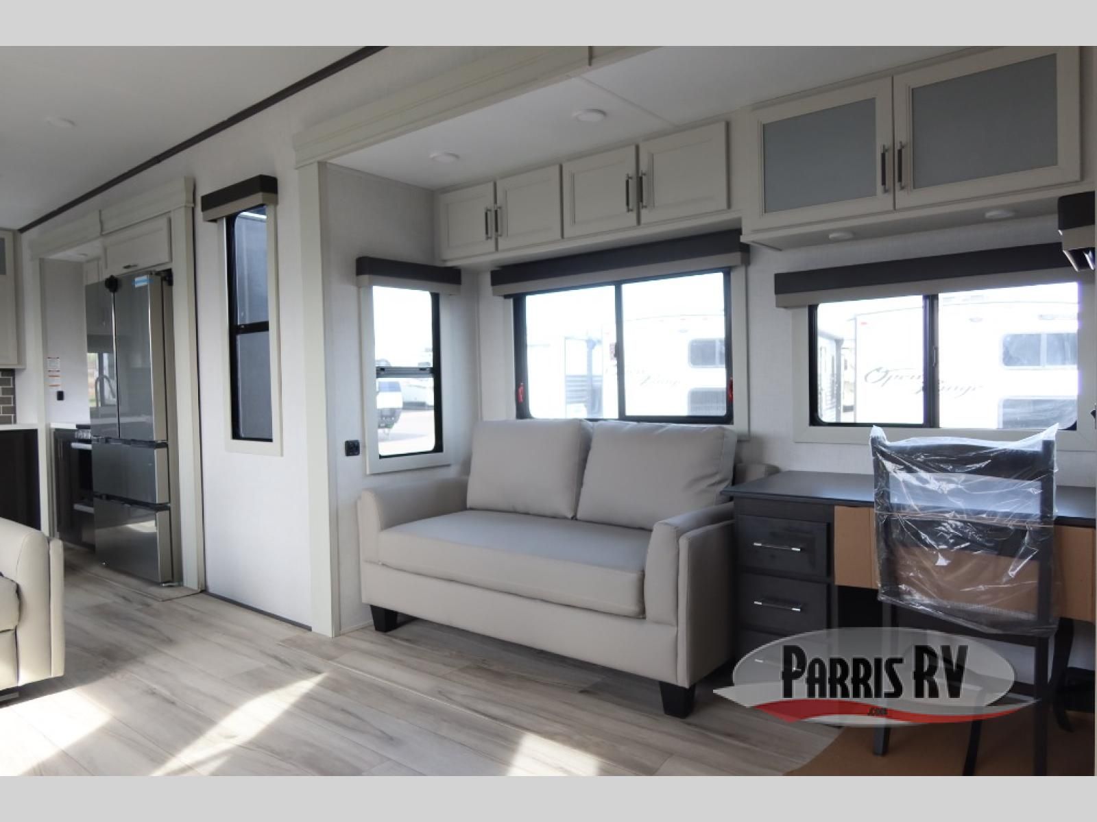 This rear kitchen fifth wheel makes extended stays or weekend trips to the lake enjoyable! The chef of your group will find plenty of counter space with the included kitchen island, plus there is a pantry and 18 cu. ft. residential refrigerator for food storage. A free-standing dinette provides a place to dine together, and the largest L-shaped sofa with recliners will be the perfect spot to relax with a movie. If you have guests, they could sleep here or on the hide-a-bed sofa sleeper. The dual entry bath includes a shower with a seat for added comfort, and the front master bedroom will feel just like home with its king bed slide out and master closet. There is also a dresser and stackable washer and dryer prep if you want to add those appliances!
