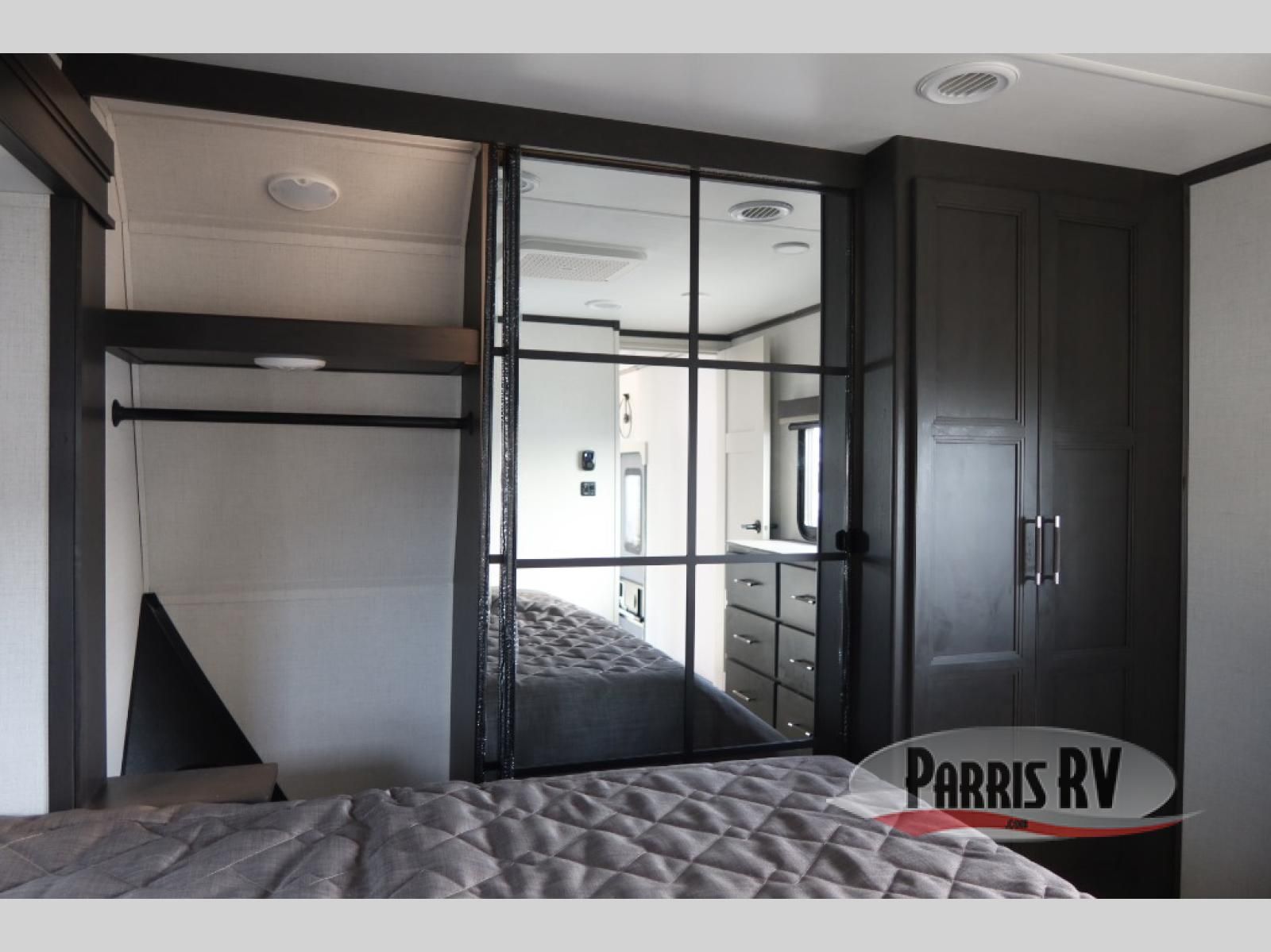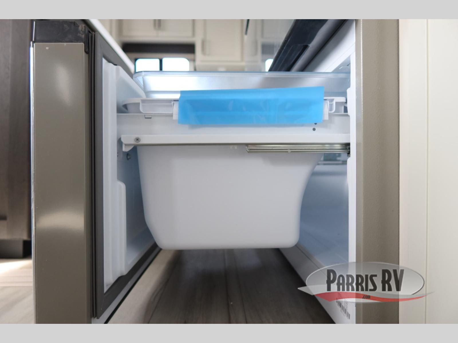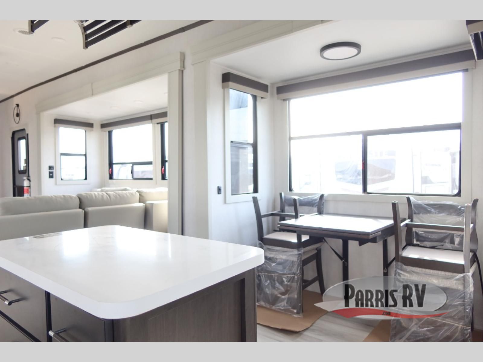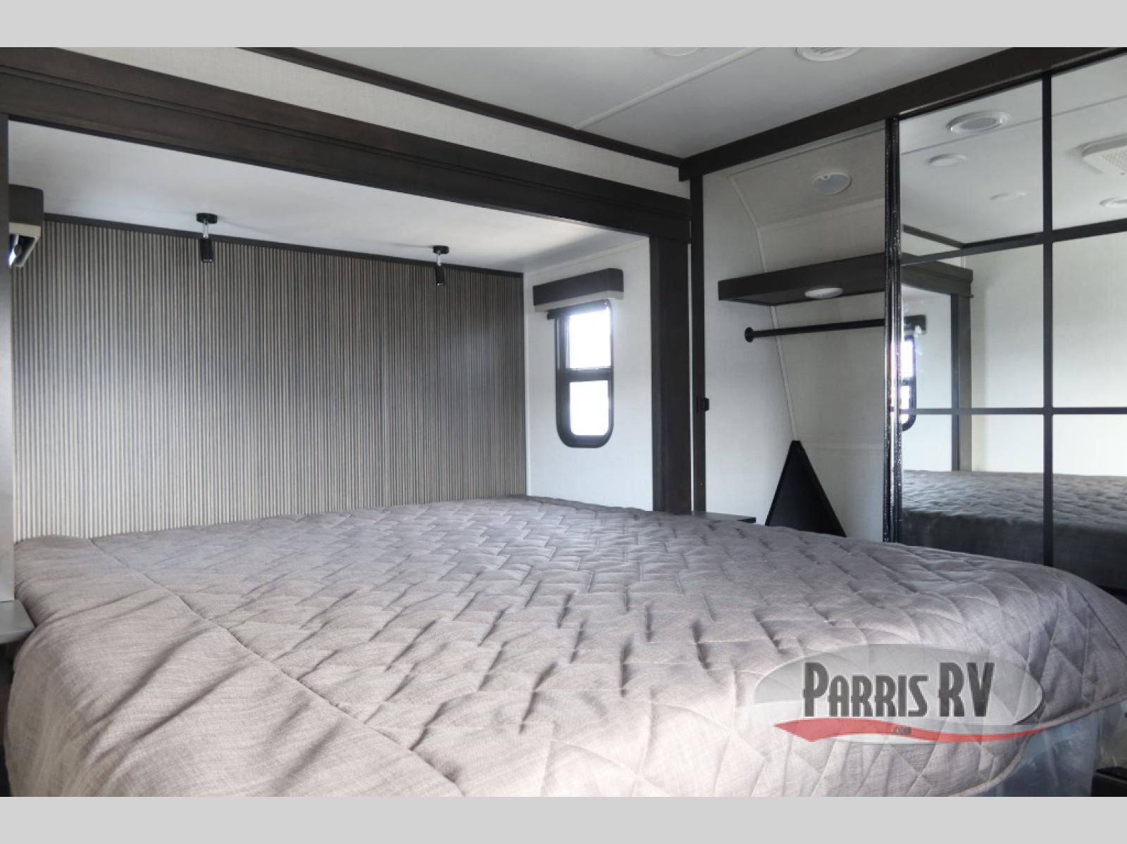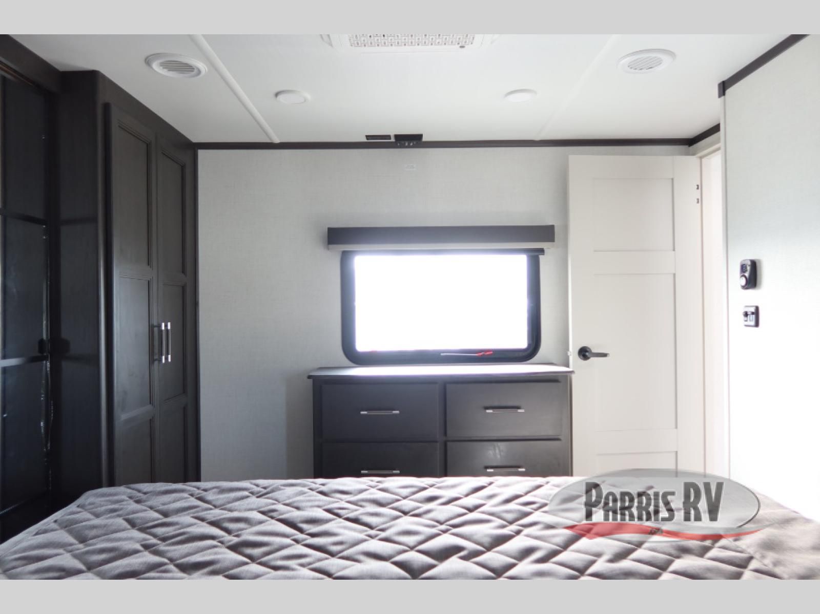 This rear kitchen fifth wheel makes extended stays or weekend trips to the lake enjoyable! The chef of your group will find plenty of counter space with the included kitchen island, plus there is a pantry and 18 cu. ft. residential refrigerator for food storage. A free-standing dinette provides a place to dine together, and the largest L-shaped sofa with recliners will be the perfect spot to relax with a movie. If you have guests, they could sleep here or on the hide-a-bed sofa sleeper. The dual entry bath includes a shower with a seat for added comfort, and the front master bedroom will feel just like home with its king bed slide out and master closet. There is also a dresser and stackable washer and dryer prep if you want to add those appliances!