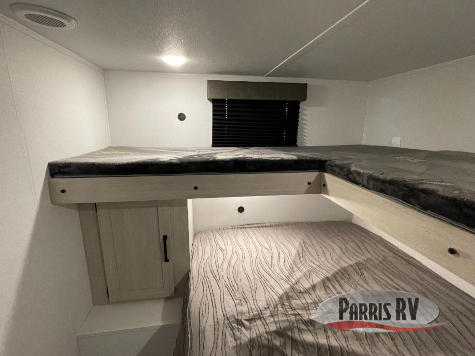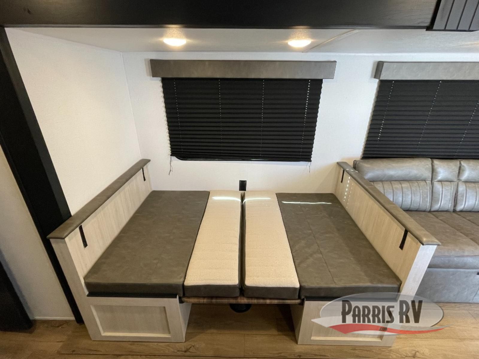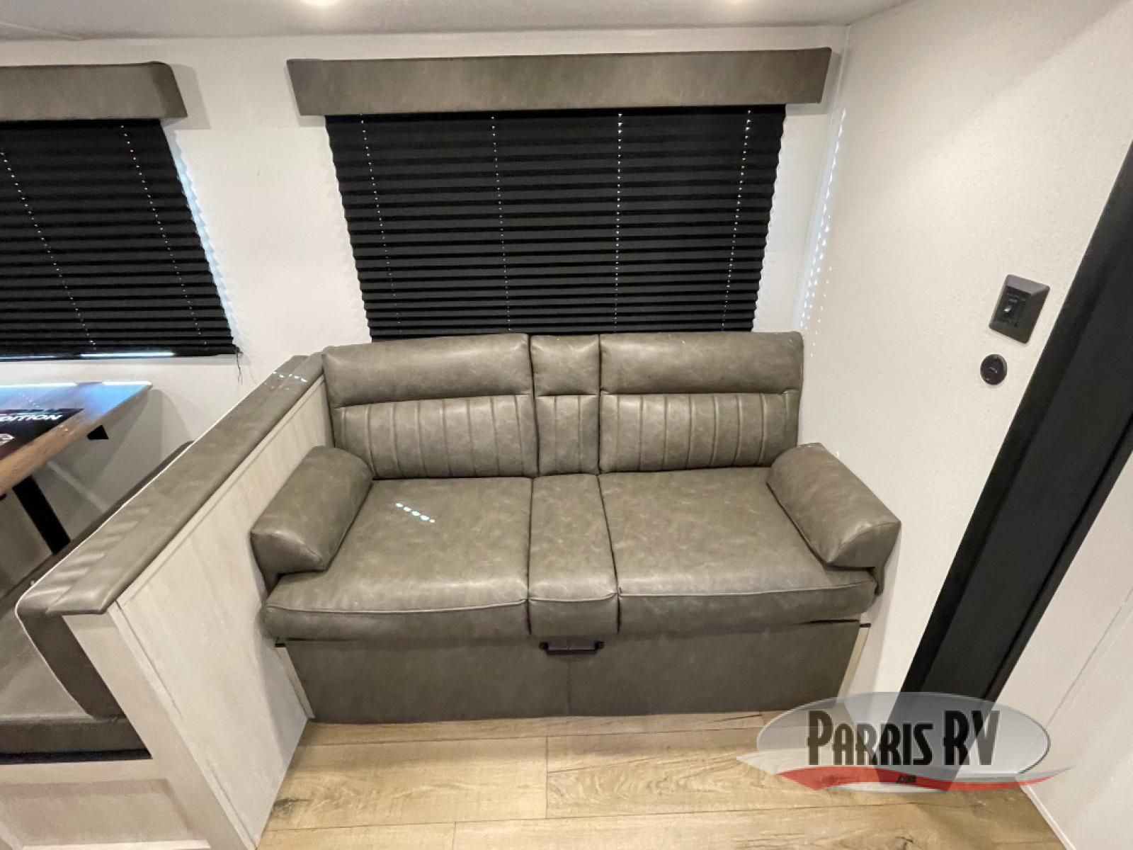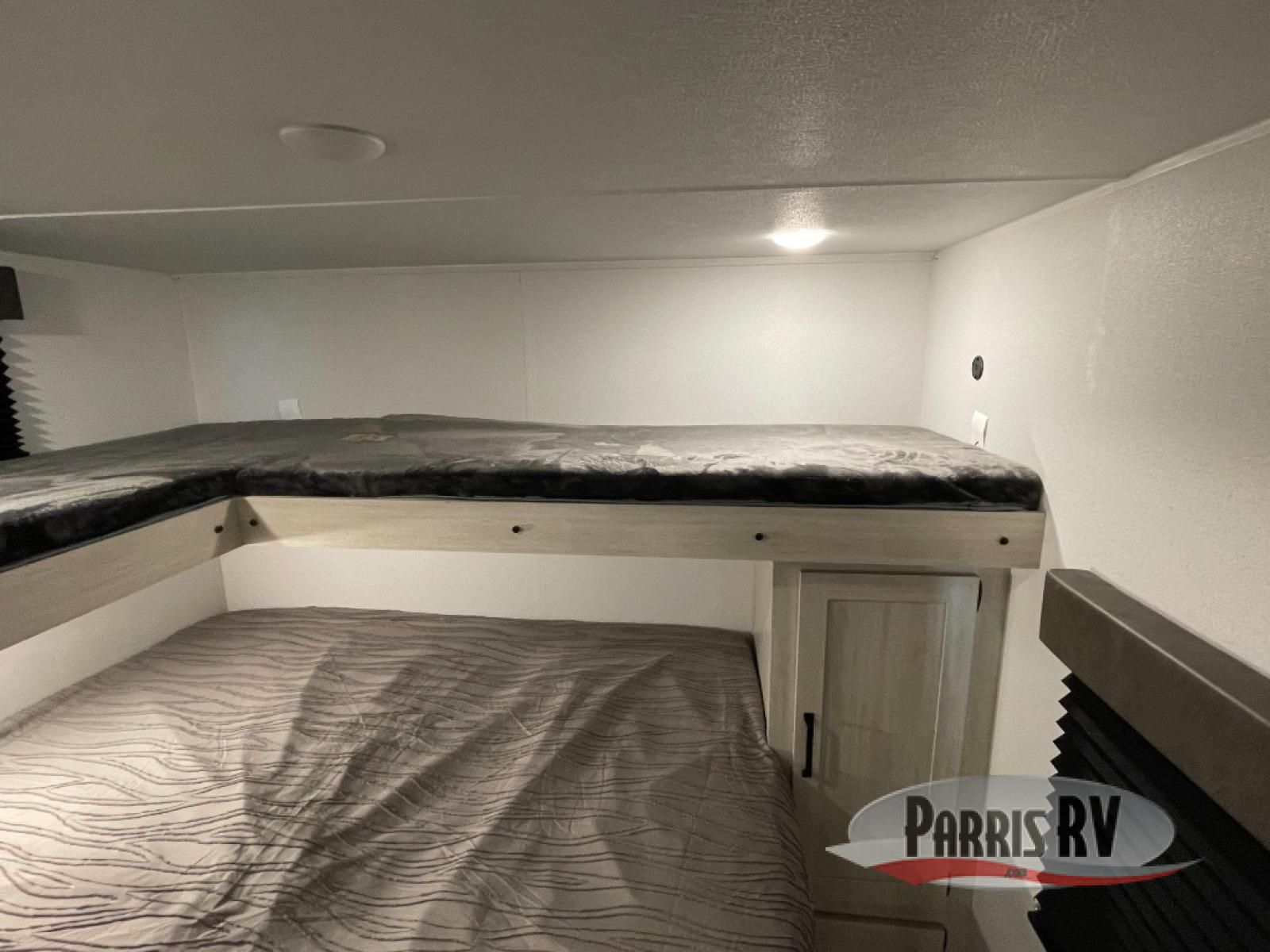 If you're looking for more space, this double axle unit features a large slide so you can walk about freely. Here, you'll find the booth dinette and sofa, which sit across from the optional TV if you want to enjoy movie nights. The full kitchen includes a stainless microwave and three burner cooktop to make meals, plus a pantry and 12V refrigerator for food storage. And an optional outside mini kitchen with a grill can be added if you enjoy cooking outdoors! Your guests or littles are sure to enjoy the rear bedroom with a queen bed, a 28" x 65" bunk, 28" x 76" bunk, a shirt closet, and a wardrobe so everything has a place!