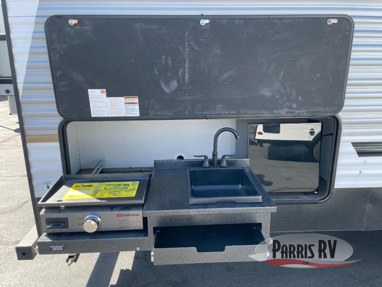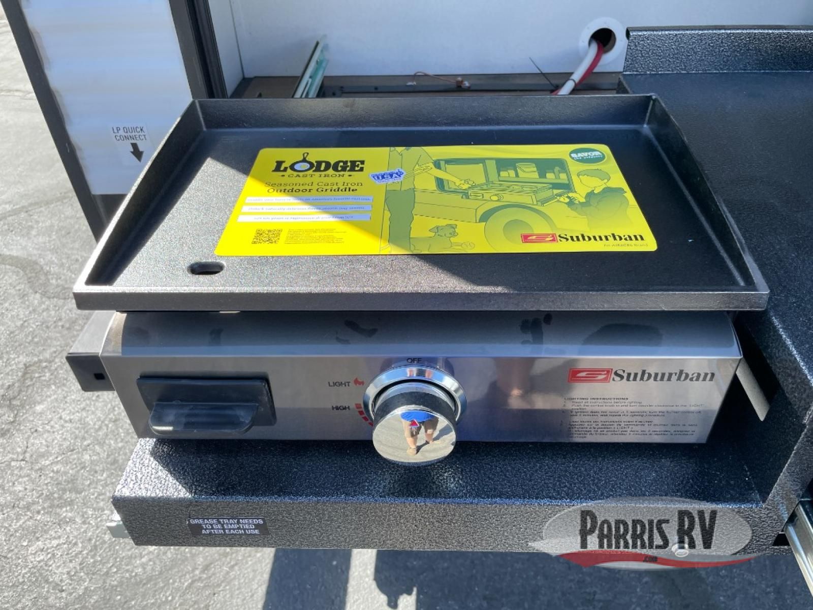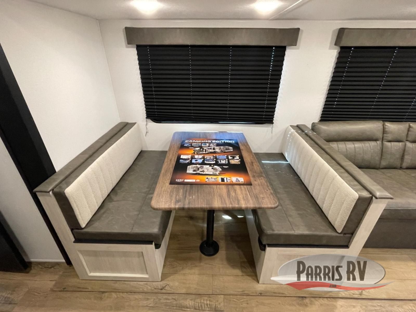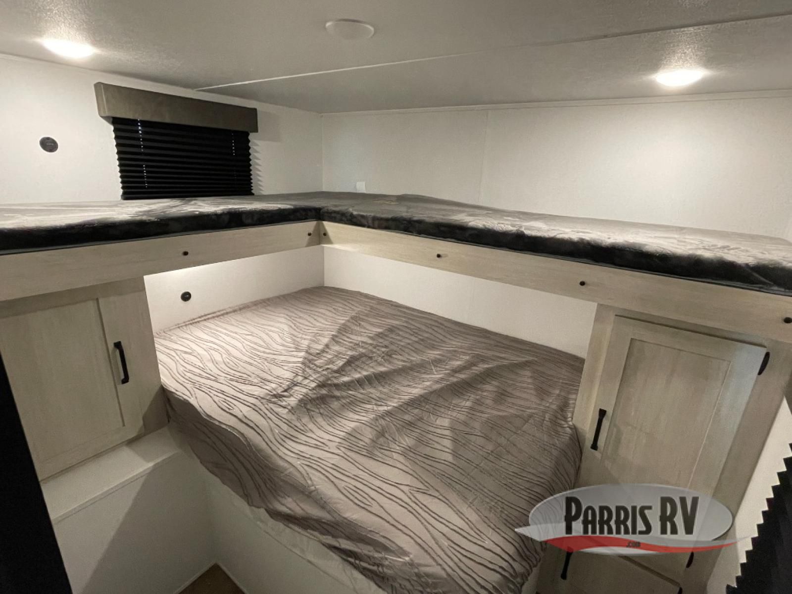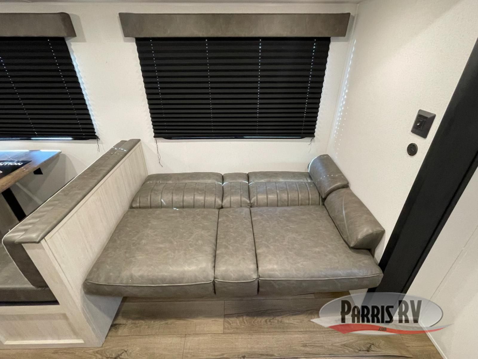 If you're looking for more space, this double axle unit features a large slide so you can walk about freely. Here, you'll find the booth dinette and sofa, which sit across from the optional TV if you want to enjoy movie nights. The full kitchen includes a stainless microwave and three burner cooktop to make meals, plus a pantry and 12V refrigerator for food storage. And an optional outside mini kitchen with a grill can be added if you enjoy cooking outdoors! Your guests or littles are sure to enjoy the rear bedroom with a queen bed, a 28" x 65" bunk, 28" x 76" bunk, a shirt closet, and a wardrobe so everything has a place!