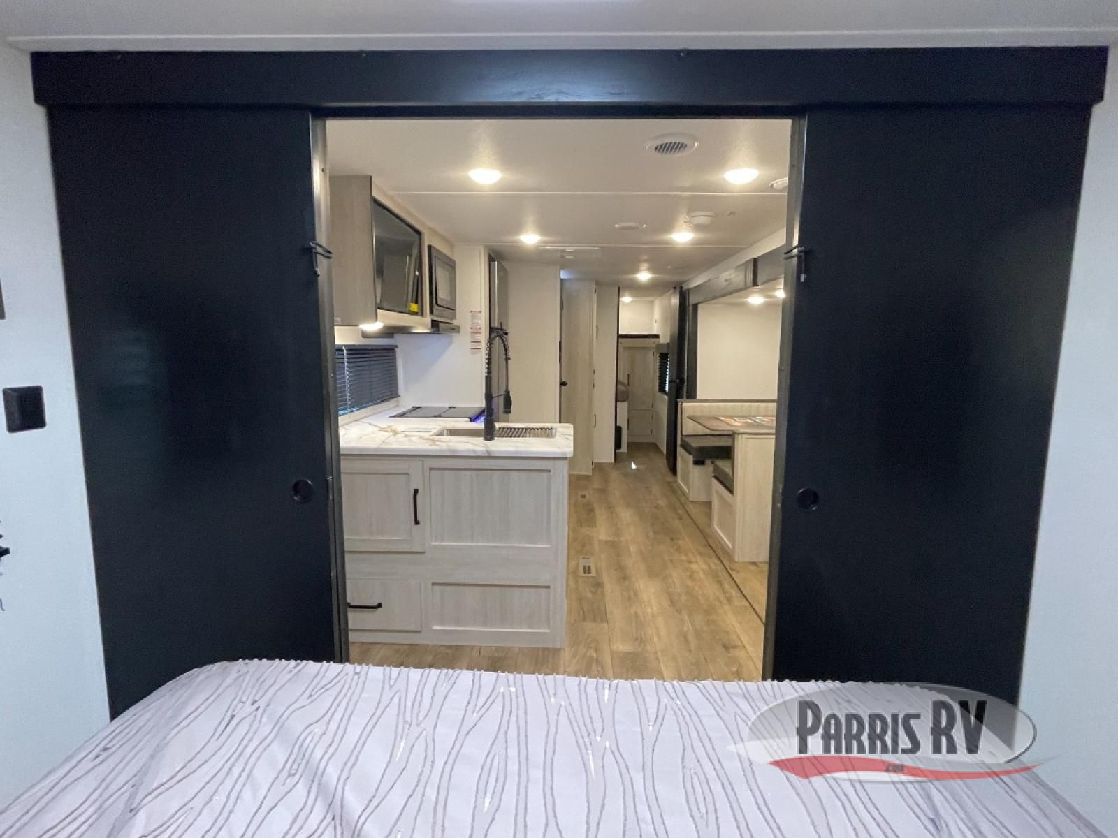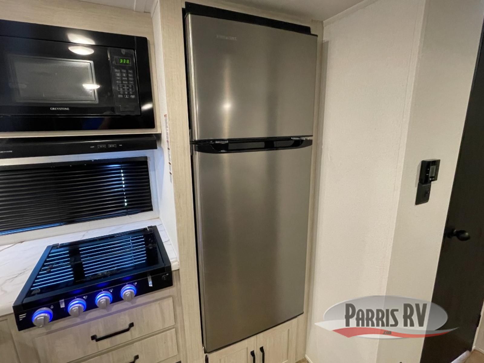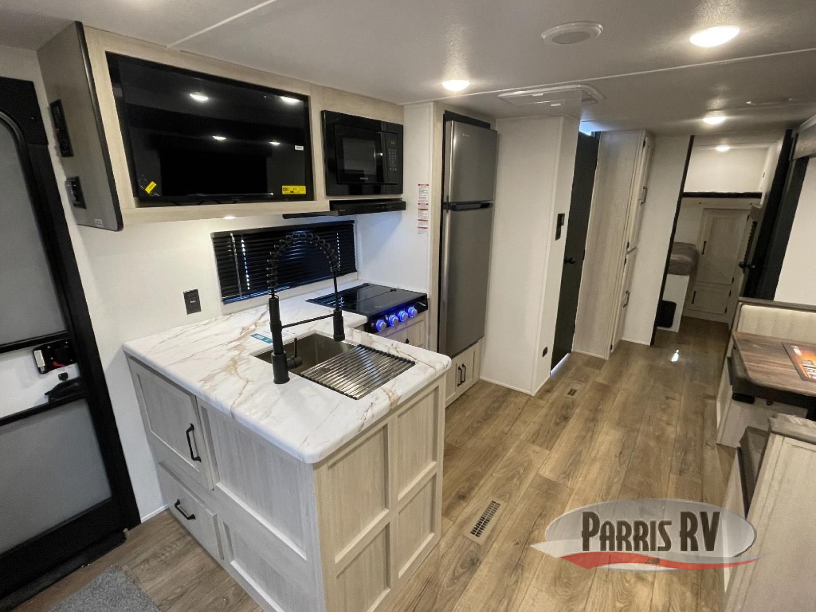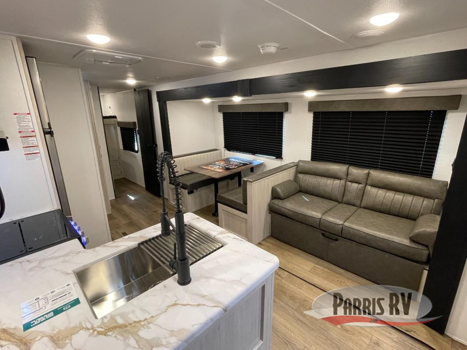 If you're looking for more space, this double axle unit features a large slide so you can walk about freely. Here, you'll find the booth dinette and sofa, which sit across from the optional TV if you want to enjoy movie nights. The full kitchen includes a stainless microwave and three burner cooktop to make meals, plus a pantry and 12V refrigerator for food storage. And an optional outside mini kitchen with a grill can be added if you enjoy cooking outdoors! Your guests or littles are sure to enjoy the rear bedroom with a queen bed, a 28" x 65" bunk, 28" x 76" bunk, a shirt closet, and a wardrobe so everything has a place!