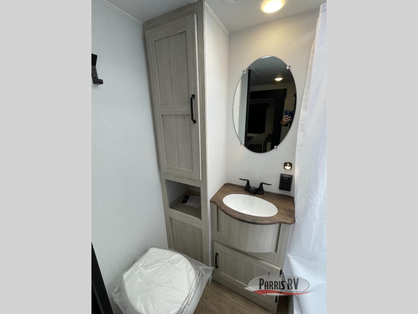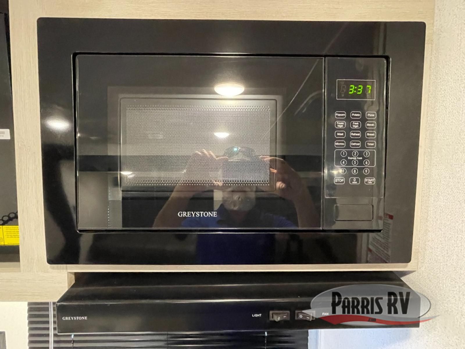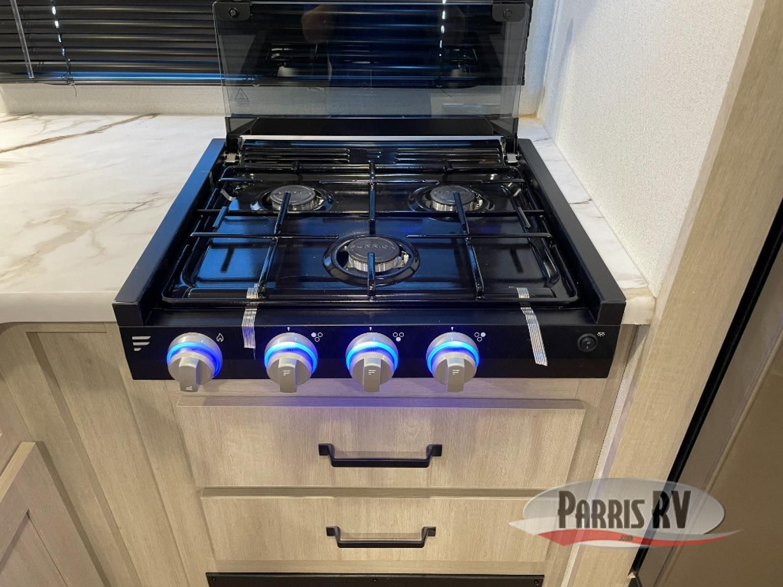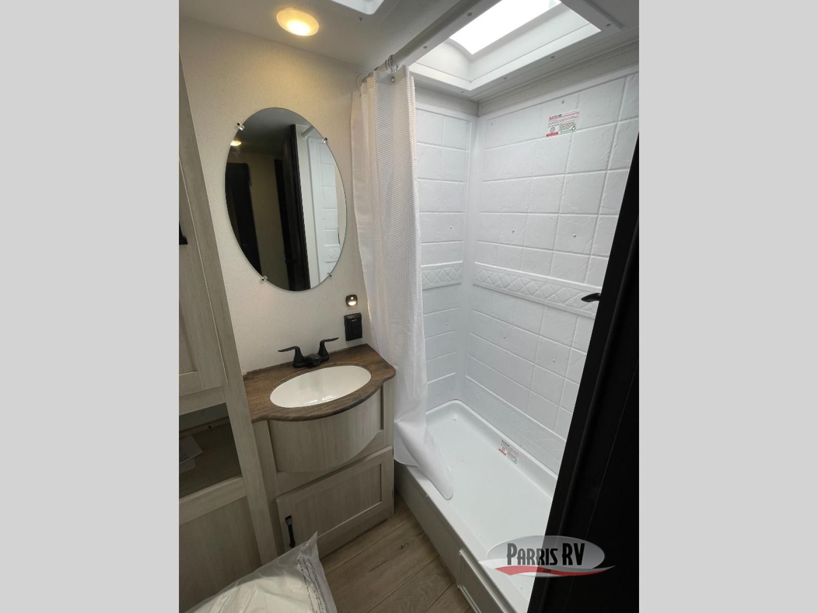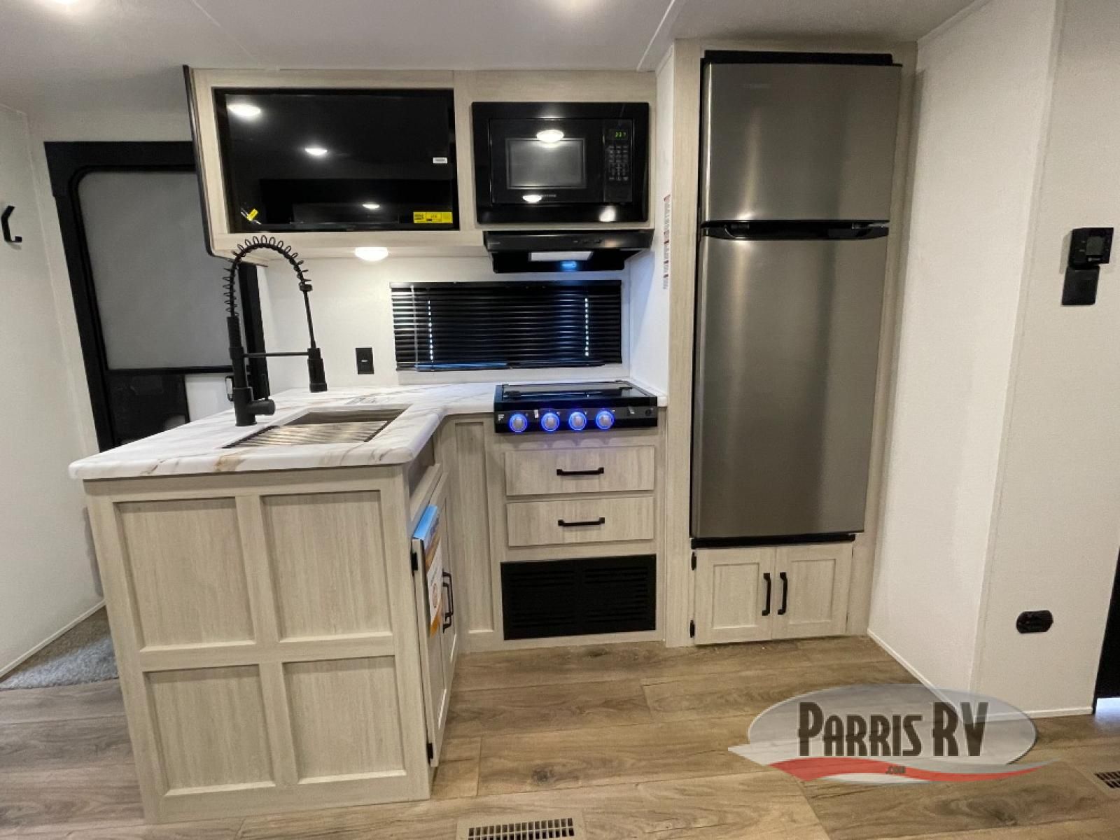 If you're looking for more space, this double axle unit features a large slide so you can walk about freely. Here, you'll find the booth dinette and sofa, which sit across from the optional TV if you want to enjoy movie nights. The full kitchen includes a stainless microwave and three burner cooktop to make meals, plus a pantry and 12V refrigerator for food storage. And an optional outside mini kitchen with a grill can be added if you enjoy cooking outdoors! Your guests or littles are sure to enjoy the rear bedroom with a queen bed, a 28" x 65" bunk, 28" x 76" bunk, a shirt closet, and a wardrobe so everything has a place!